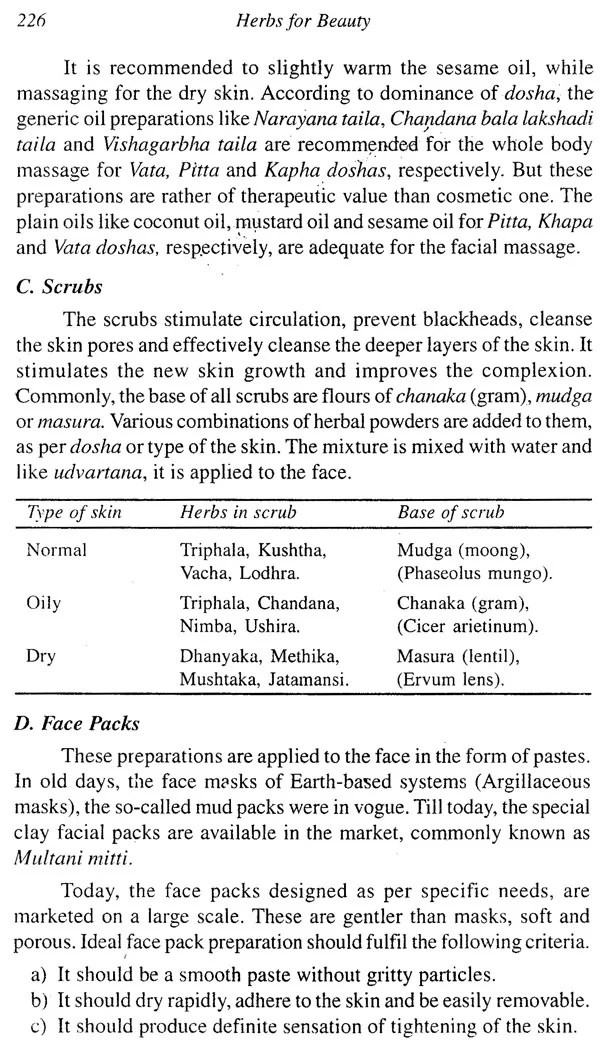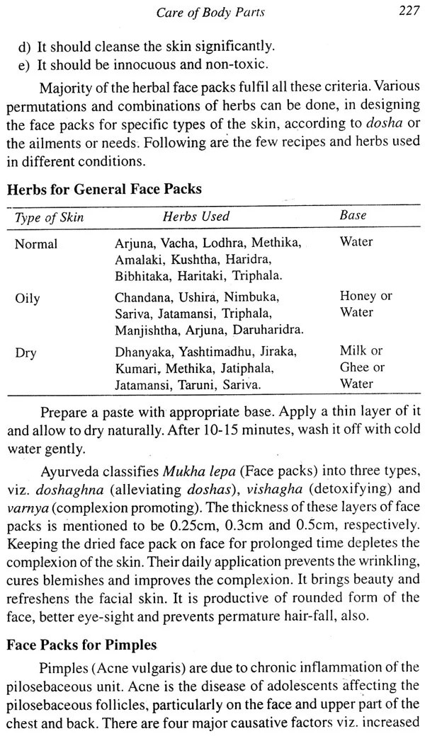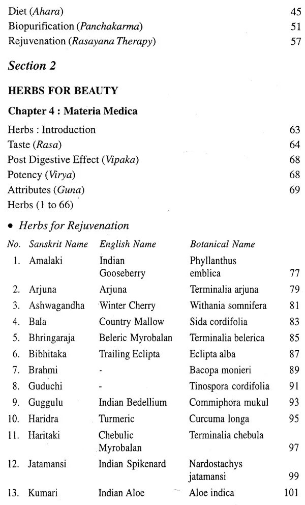 The present work 'Herbs for Beauty' authored by Dr. Prakash Paranjpe and Smita Paranjpe is comprehensive work on Indian cosmetics. The senior author is well versed in both the sciences - Ayurveda and Modern medicine and the junior author is trained in preparations of medicines and her skill is laudable. The book is preceded by a succinct introduction with the comparison of man and the universe and the fundamental difference between Ayurveda & Modern medicine. The present monograph has been arranged into three sections. Section one comprises three chapters dealing successively with the History and Philosophy of Ayurveda, Fundamental Principles of Ayurveda and Health and Life style. Section Two is devoted to Materia Medica wherein 66 drugs have been chosen. Introducing them, they are captioned with introduction, parts to be used, Ayurvedic properties, rejuvenating properties and external uses. This section is initiated with the fundamentals of drug which elucidate the concepts of Rasa, Gulp, Virya, Vipaka and Prabhava. The material of this section is annexed in one chapter which becomes fourth in number. Section Three projects Care of Body Parts and it is confined into fifth chapter. This part of the book is very lucid, luculent and charming. Beauty is solely based on the parts of the body. At a glance, smoothy & fair complexion of the skin, dark blackness of hair apprise of the beauty of the person and is meant accomplished when the organs of cognition and conation are aesthetically attractive, lovely and charming. Authors have taken great pains giving the physiology (from both the stand points) of these parts and their proper care with the herbal preparations.