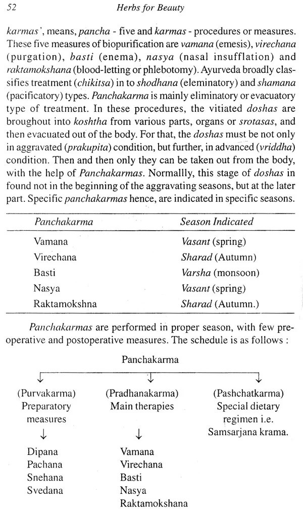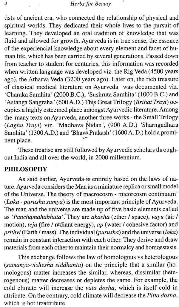 Beauty is not merely confined in body and organs (both congnitive and conative) but in mind also. Since the whole base of the work is Ayurvedic, authors have not hesitated in including the History and Philosophy of Ayurveda. Ayurveda has been nurchered with the philosophical concepts of Indian Philosophy (mainly, Nyaya, Vaisesika, Sankhya and Yoga). Nyaya and Vaisesika have defined the body (sarira) in their own way. According to former, body is the vehicle of actions, sense organs and objects (Cestendriyarthasrayah sariram, 1.1.11 while it is abode of the enjoyment of the senses (Bhogayatanam sariram. Whole activities of the senses are controlled. Sattva, Rajas and Tamas are the three qualities of mind (manas). In the Agnipurana (270.13), God has been eulozised to promote the health to senses and mind along with wisdom (buddhisvasthyam manas svasthyam svasthyarn aindriyakam tatha). Now a days, in a global beauty contests, the aspirant has to go under these parameters. In premordial nature (prakrti) is an equilibrium of Sattva (essence), Rajas (motion) and Tamas (inertia) and they represent creative, protective and destructive potentials and they play vital role in formation of personality of the individual. Tridosas are outcome of five Mahabhutas and the whole universe is made of it. Since the body is formation of Dosa, Dhatu & Mala and that is why these three factors (including seven body tissues and three main body excreta) have been elaborately explained. Organism of the body is scientifically defined. Under the health of hygiene, daily regimen (dinacarya) and seasonal regimen (rtucarya) along with dietetics are also discussed. Biopurification through Pancakarma (emesis, purgation, enema, nasal insufflation and blood-letting) is dealt with in order to eliminate the vitiated dosas lying in the channels. Pancakarma is preceded by oleation and sudation and followed by Rasayan therapy. An application of Rasayanas improves tissue nourishment and lastly rejuvenates the body resulting in longevity, improved mental power and immunity.