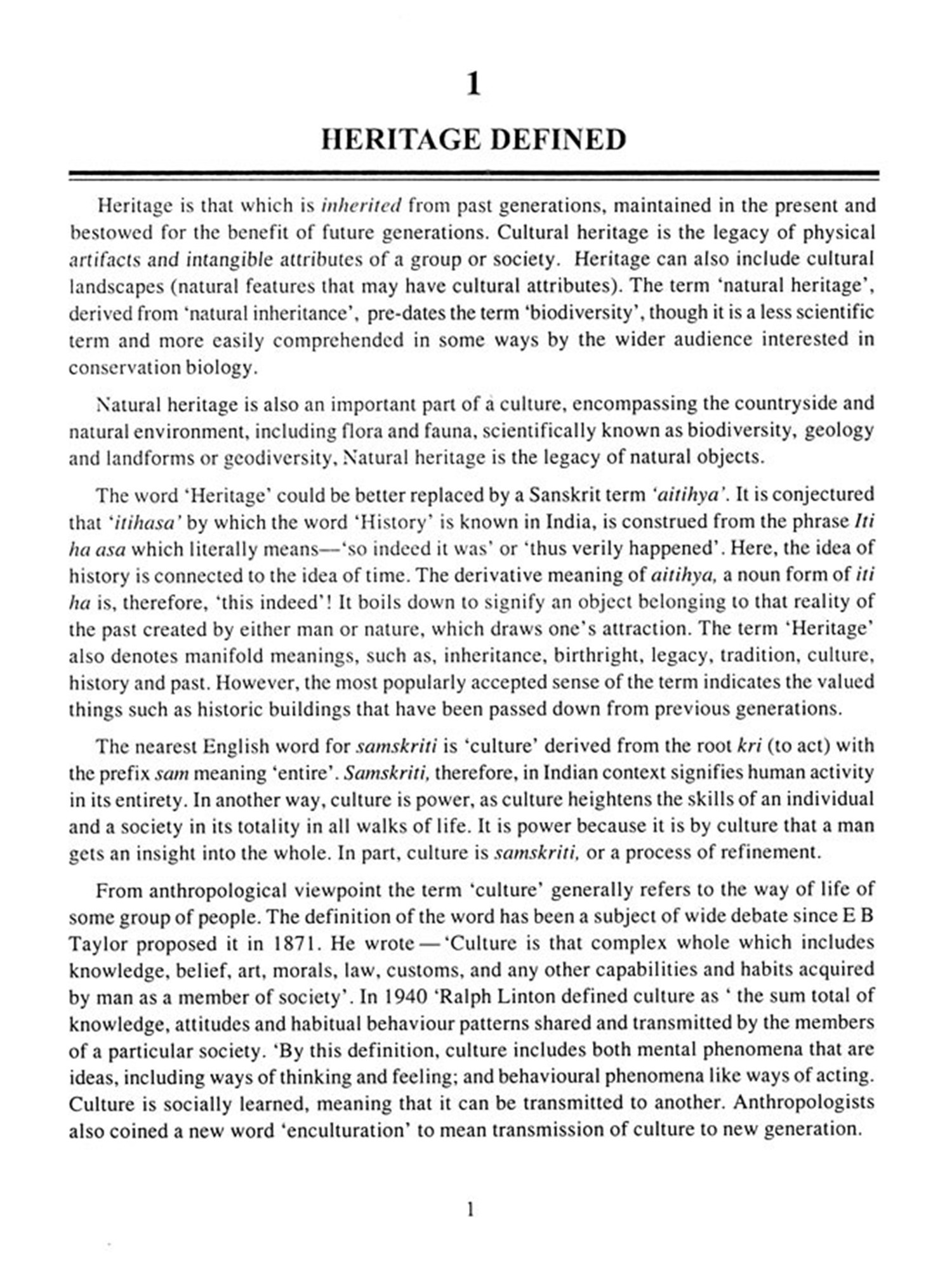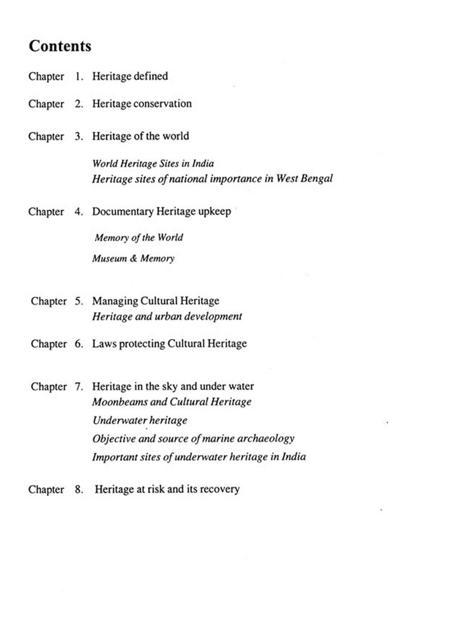 It is with this view in mind the contents of the monograph were selected to elaborate the topics like the definition of heritage, its conservation, the world heritage sites in India, the documentary heritage upkeep, managing cultural heritage, laws protecting cultural heritage, heritage in the sky and under water as also the heritage at risk and its recovery. It is hoped that the monograph may be of some help to provide recommendations for policies dealing with matters of cultural and natural heritage in the country.