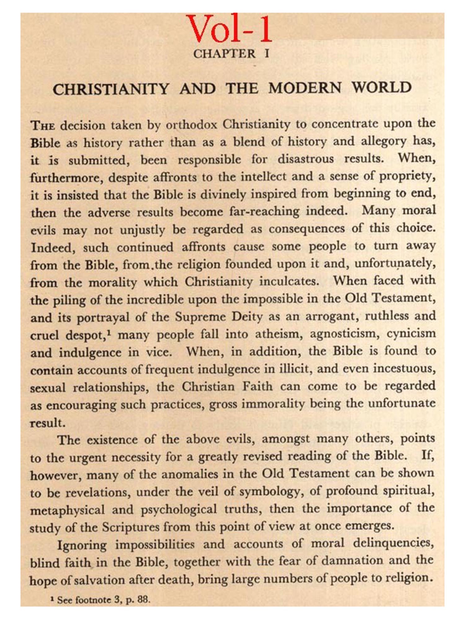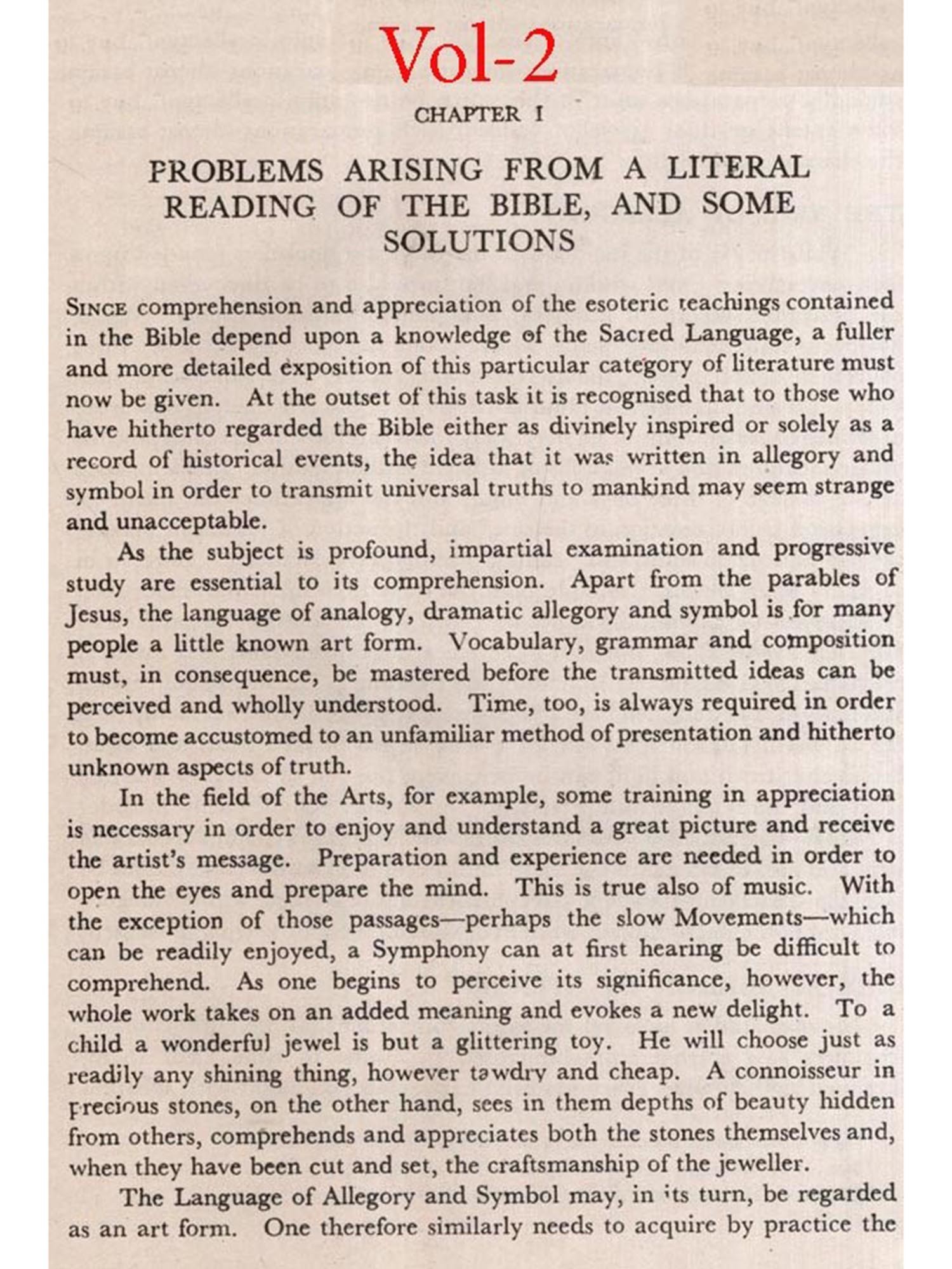 The value of this approach to World Scriptures becomes evident when the keys of interpretation are applied to the Bible. Success has, however, been rendered difficult by at least three prevalent practices. The first of these is to mistake the veils for the truths which they both conceal and reveal. The second is to require the acceptance as fact of much that is purely allegorical and, indeed, in some cases incredible. The third is the insistence by some Chris-tian denominations upon unquestioning belief in dogmas, based upon a literal reading of certain passages of the Bible, as essential to the salvation of man here and hereafter. Unfortunately, this is carried to still greater lengths by ex-cathedra pronouncements that failure to affirm implicit belief in stated dogmas may lead to excommunication, and even to eternal damnation.