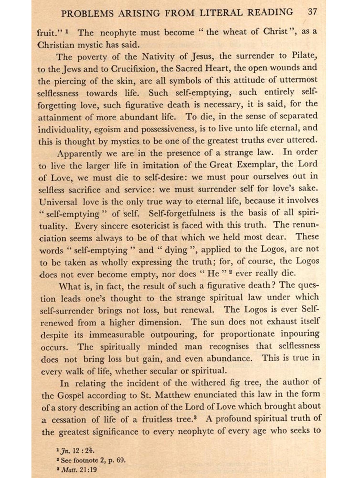 These trends observable in orthodox Christianity may be regarded as particularly harmful at the present period in world history; for as a result of them the attention of Christians is diverted from eternal verities. These especially include the supreme importance of the search for and discovery of the Divine Presence within man, "Christ in you, the hope of glory," and of the fact that the Divinity in all men is one and the same. When the spiritual unity between all members of the human Race is fully recognised aggressive competition, organised crime and wars of conquest become impossibilities. The spiritually darkened, war-threatened and competitively divided condition of humanity today may well be amongst the tragic consequences of the long continued imposition by the spiritual Heads of the Christian Faith doubtless with the highest motives and out of consideration for the spiritual welfare of the people of dogmas based upon the literal reading of Biblical allegories; for when accepted and applied to life such dogmas inevitably affect international, national and personal relationships. They may be partly responsible for the divided condition of Christianity and even of humanity itself.