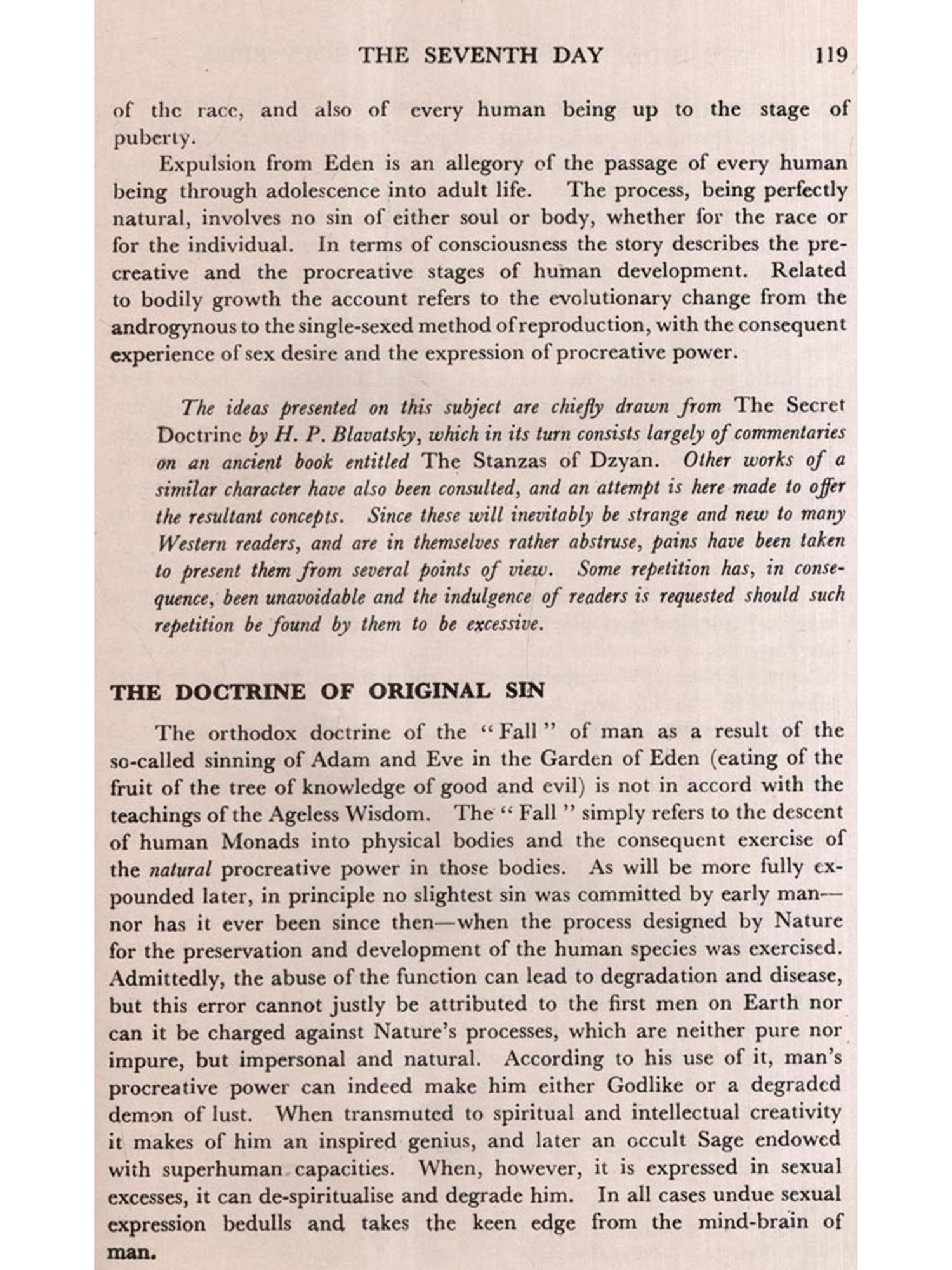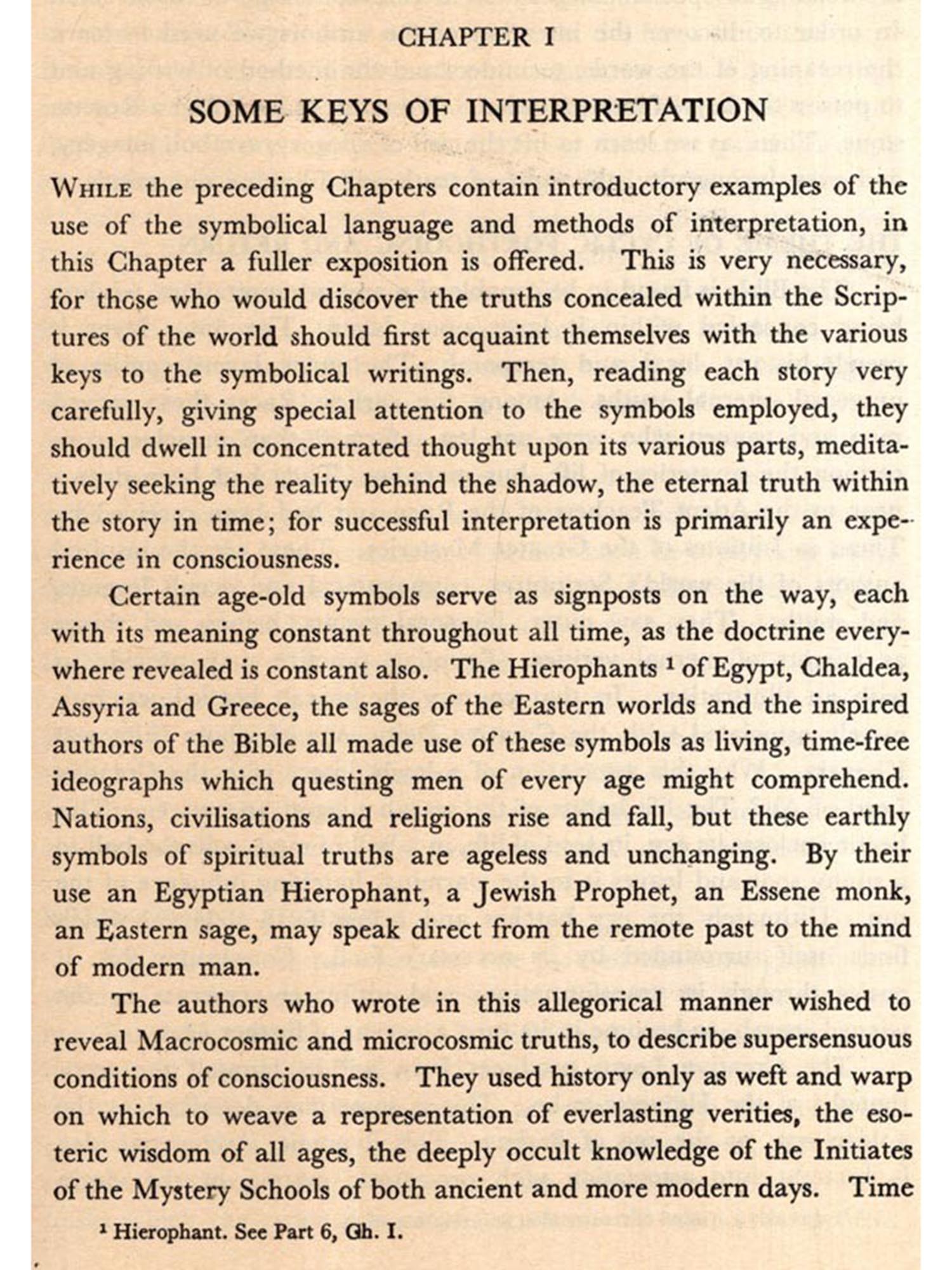 In these various ways the religions and philosophies of the ancients prove profitable to the modern student, whilst those possessed of knowledge of the Sacred Language and the keys of interpretation recognise ideas which are found to be common to all World Faiths, exoteric and esoteric. The universal use of symbols with which to portray those ideas makes them readily available; for the meaning of the symbols used are found to be constant, as constant also are the doctrines which they reveal. Thus, whilst ancient superstitions and magical practices, and the instinctive personification and dramatization of natural phenomena by primitive peoples, are recognised, World Scriptures and mythologies may legitimately be regarded as rich mines of the Ageless Wisdom. On occasion throughout this work, therefore, parallels are drawn between Biblical statements and the same ideas appearing in different forms in other sacred writings.