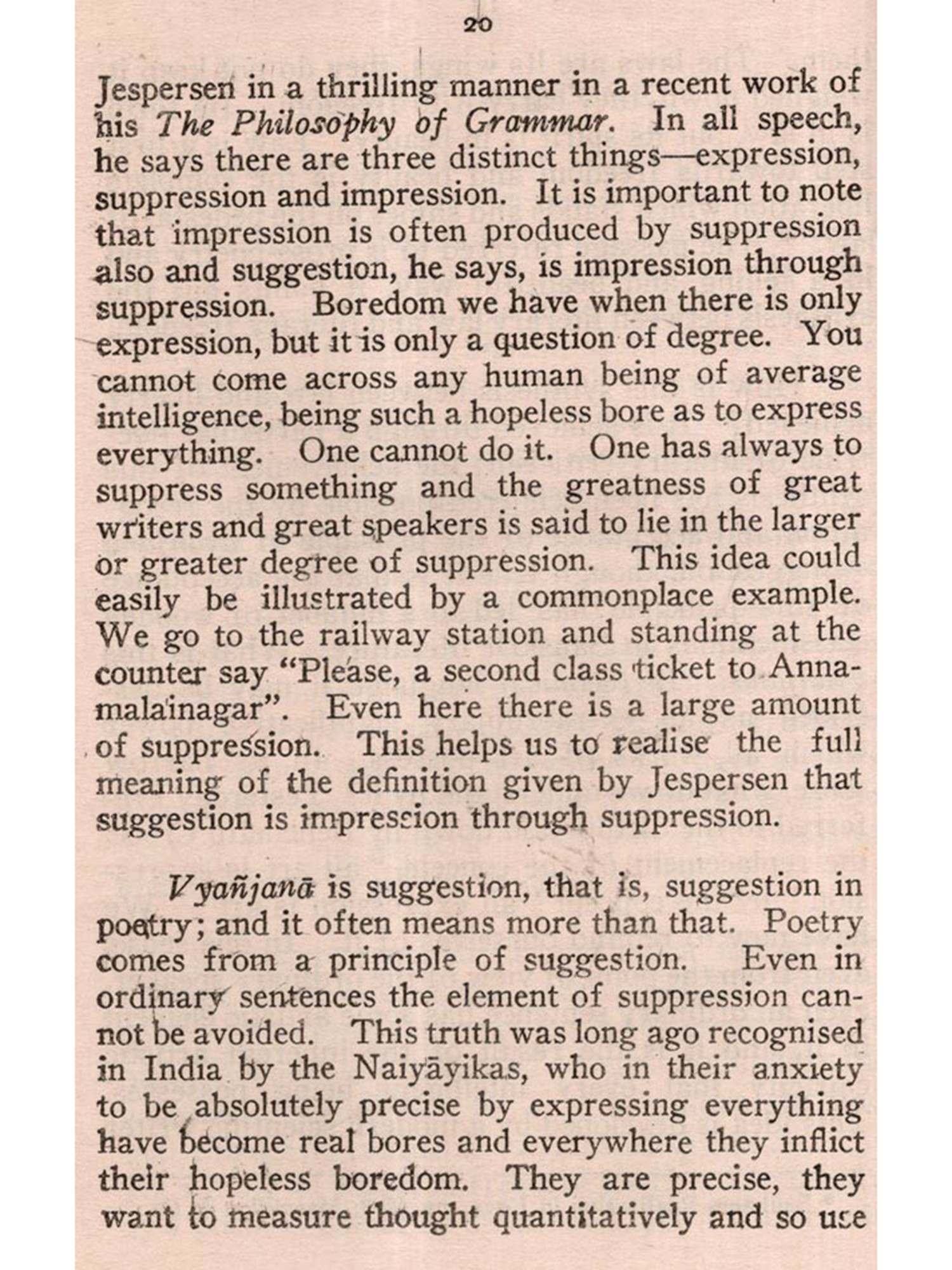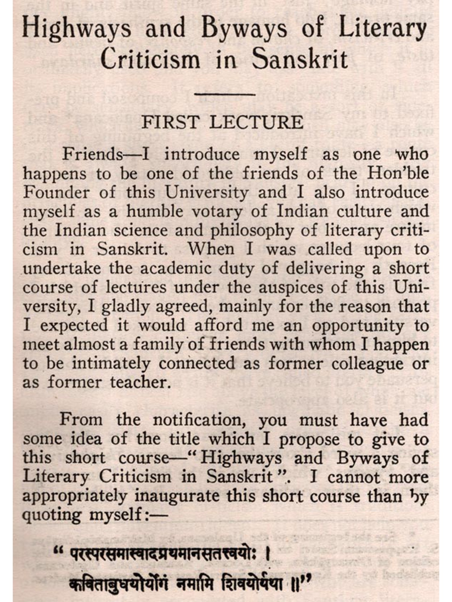 Prof. Sastri himself shone as the pioneering example of this unique combination. His four lectures on the Highways and Byways of Literary Criticism in Sanskrit, delivered during 23rd to 26th Jan. 1931 at the Annamalai University bear out this fact. These were first brought out as a booklet in 1945 by the Kuppuswami Sastri Research Institute. On account of its wide use by scholars and students in various universities in India and outside, selections from the book were included in an introduction to Indian Poetics, ed. by V. Raghavan and Nagendra (Macmillan & Co., 1970).