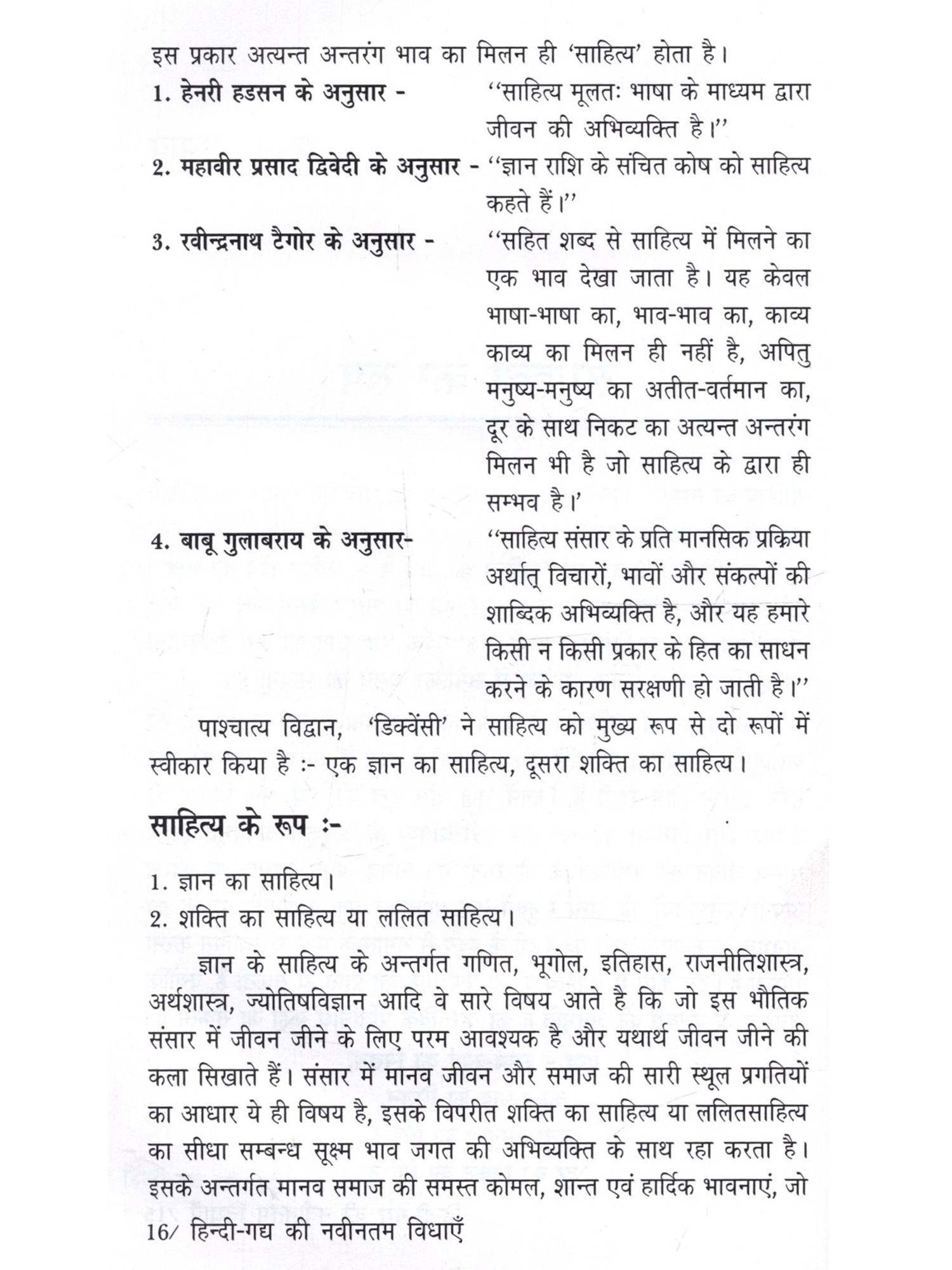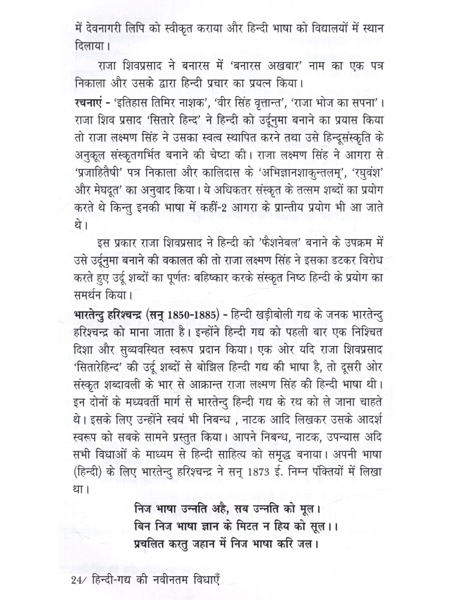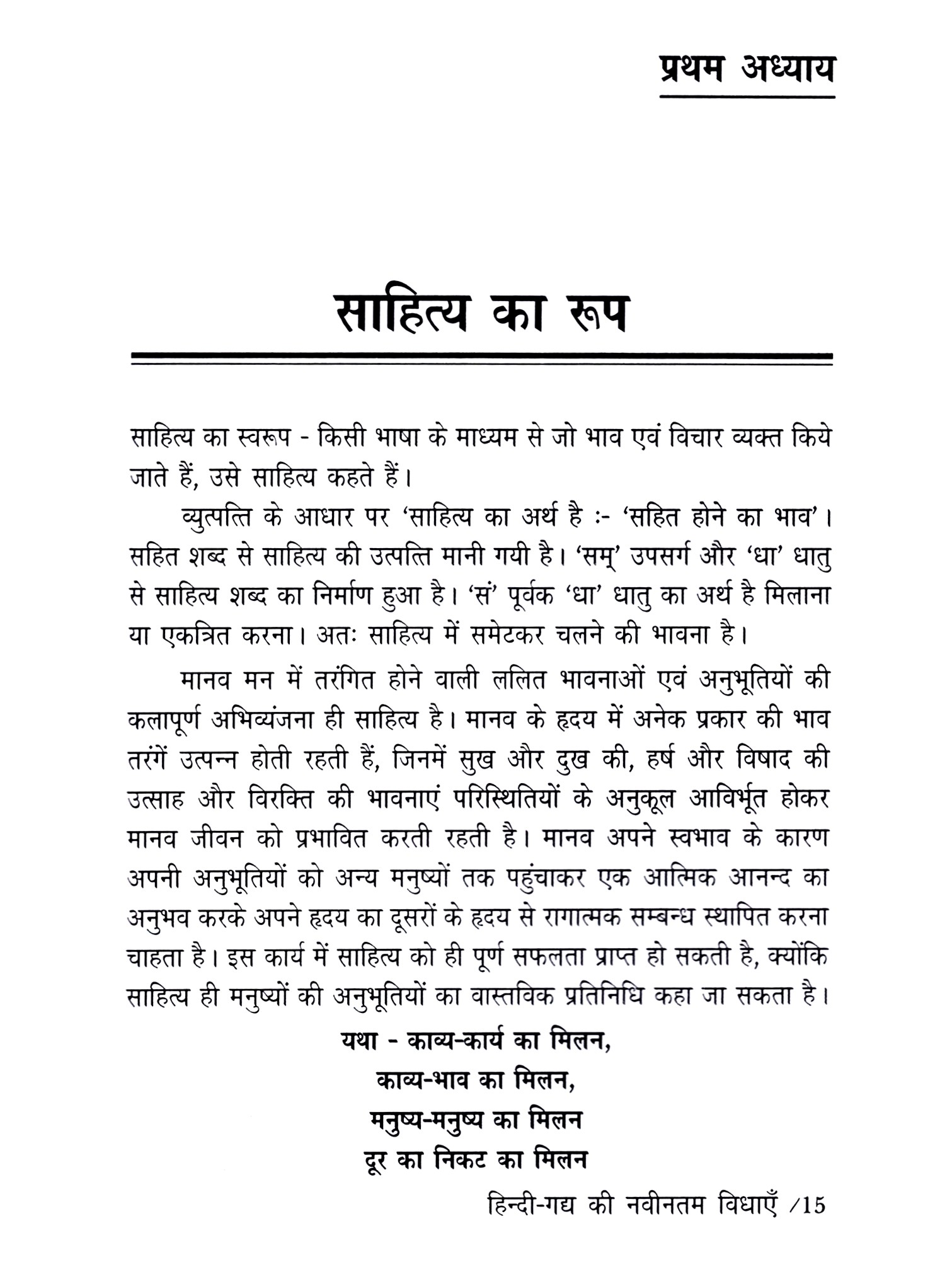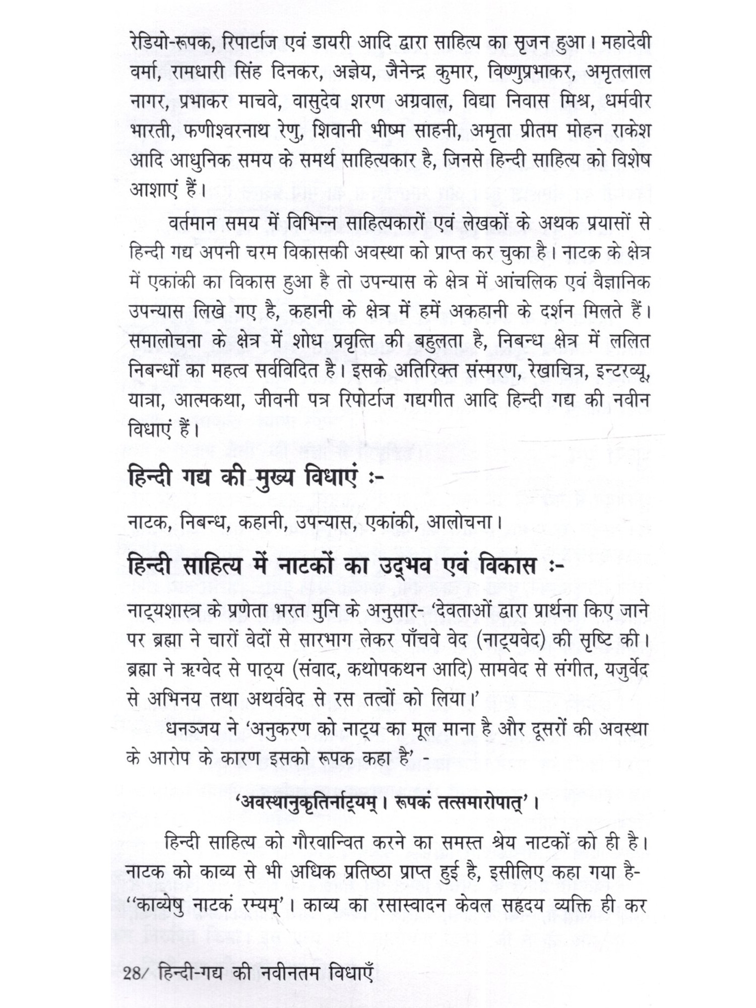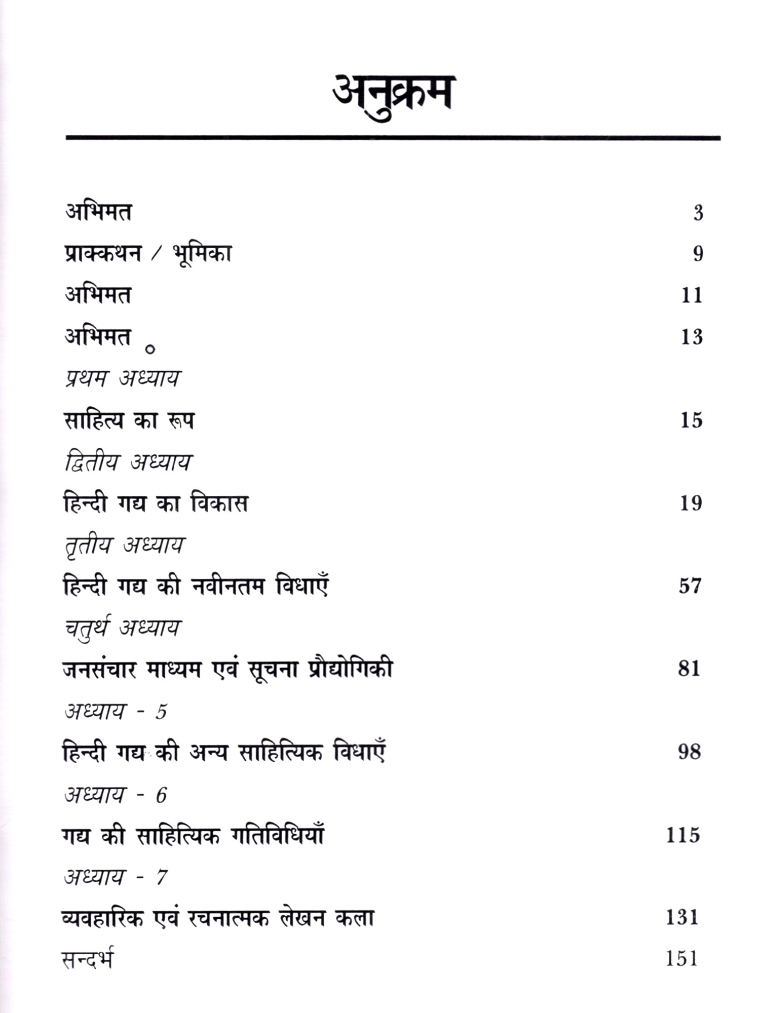 हिन्दी भारतीय समाज के उल्लास, सौन्दर्य, चिन्तन, मनन एवं भावधारा की भाषा है, साथ ही अन्तर्द्वन्द, संघर्ष, उपेक्षा, ग्लानि एवं पश्चाताप की भाषा है। कारगिल युद्ध में वीर जवानों का जयघोष इसी भाषा में हुआ था। उस समय अनेक पत्रपत्रिकाओं में भारतीय जनता के एकात्मभाव की प्रतिध्वनि हिन्दी भाषा में ही सुनाई पड़ी थी, काव्य लिखे गए थे, गीत गाए गए थे, सम्पादकीय एवं लेखों में भी भारतीय जवानों की शौर्यगाथा का वर्णन किया गया था। वैसे तो हिन्दी गद्य साहित्य में उपन्यास, कहानी, निबन्ध, आलोचना, नाटक एवं एकांकी पर्याप्त रूप से पल्लवित एवं पुष्पित हुए, लेकिन इनके अतिरिक्त अंग्रेजी तथा अन्य भाषाओं के पाश्चात्य साहित्य के सम्पर्क के परिणाम स्वरूप हिन्दी में अन्य बहुत सी गद्य विधाएं भी प्रसारित हुई यथा जीवनी, आत्मकथा, पत्र-साहित्य, गद्यकाव्य, रेखाचित्र, संस्मरण तथा रिपार्टाज आदि ये सब ऐसी ही नवीनतम प्रतिमान है, जिनका आधुनिक रूप नितान्त नवीनतम है। प्रस्तुत पुस्तक में सबसे प्रधान साहित्यिक घटना नवीनतम विधाएं है, इसीलिए उनसे सन्दर्भित प्रवृत्तियों का विश्लेषण, महत्वपूर्ण एवं अनुबन्धित रचनाएं, रचनाकारों का परिचय, एवं कालगत उपलब्धियों का यहाँ विस्तारपूर्वक विवेचन किया गया है। लेखिका ने गद्य के विविध प्रतिमानों को कई रूपों में विभक्त किया है यथा गद्य का विकास, साहित्य का स्वरूप, हिन्दी गद्य की नवीनतम विधाएं, गद्य की साहित्यिक विधाएं एवं सृजनात्मक लेखन आदि। यहाँ आधुनिक काल के नवीनतम, प्रतिमान क्रम पर प्रकाश डालना ही प्रस्तुत पुस्तक का उद्देश्य रहा है। हिन्दी साहित्य के विद्यार्थियों के लिए गद्य के नवीनतम आयामों का ज्ञान अत्यन्त आवश्यक है। यह पुस्तक बी.ए., एम.ए. पाठ्यक्रम के लिए सहायक सिद्ध होगी क्योंकि यहाँ मैंने अपनी कलम द्वारा हिन्दी जानने वाले बहुसंख्यक छात्र/छात्राओं तक ज्ञान का प्रकाश पहुँचाने का बुनियादी प्रयास करने की चेष्टा की है। हिन्दी गद्य साहित्य के आदि से अद्यतन विकास क्रम की यह नवीनतम प्रस्तुति साहित्यानुरागी अध्येताओं एवं छात्रों को विशाल हिन्दी परम्परा से परिचित कराने में अवश्य सहायक होगी। मेरे गुरुजनों के आशीष तथा निर्देश मेरे लिए पाथेय एवं आलोक रहे हैं। मैं उन विद्वानों का अपने तहेदिल से आभार प्रकट करती हूँ। जिन्होंने समय-2 मेरा मार्गदर्शन किया एवं मेरे लेखन कर्म को निरन्तर गतिशील बनाए रखने में पग-2 पर प्रोत्साहित किया। पुस्तक को और अधिक उपयोगी बनाने के लिए छात्रों एवं शिक्षकों के सुझावों का मैं स्वागत करूँगी।