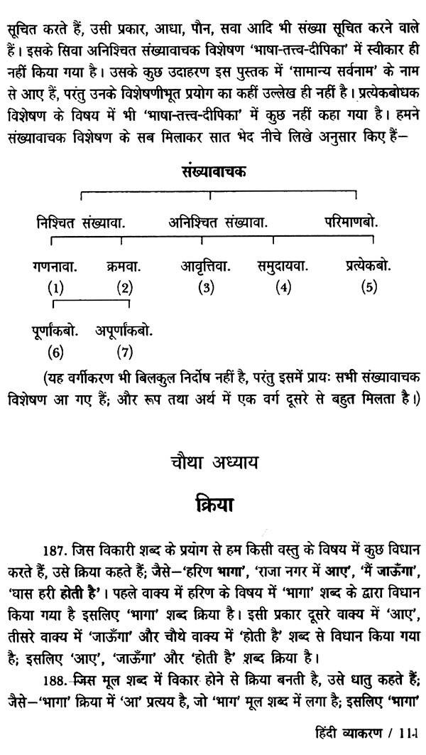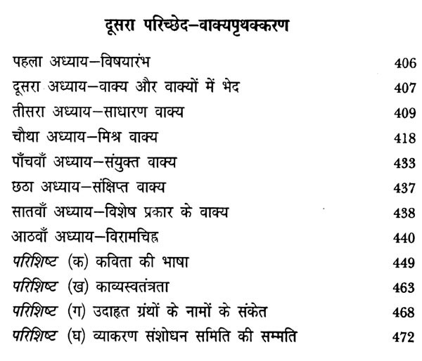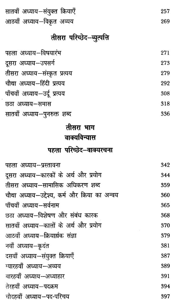 कुछ लोगों का मत है कि हिंदी के 'सर्वागपूर्ण' व्याकरण में मूल विषय के साथ-साथ साहित्य का इतिहास, छंदोनिरूपण, रस, अलंकार, कहावतें, मुहाविरे आदि विषय रहने चाहिए। यद्यपि ये सब विषय भाषाज्ञान की पूर्णता के लिए आवश्यक हैं, तो भी ये सब अपने आप में स्वतंत्र विषय हैं और व्याकरण से इनका कोई प्रत्यक्ष संबंध नहीं है। किसी भी भाषा का 'सर्वागपूर्ण' व्याकरण वही है, जिससे उस भाषा के सब शिष्ट रूपों और प्रयोगों का पूर्ण विवेचन किया जाय और उनमें यथासंभव स्थिरता लाई जाय। हमारे पूर्वजों ने व्याकरण का यही उद्देश्य माना है' और मैंने इसी पिछली दृष्टि से इस पुस्तक को 'सर्वागपूर्ण' बनाने का प्रयत्न किया है। यद्यपि यह ग्रंथ पूर्णतया सर्वागपूर्ण नहीं कहा जा सकता, क्योंकि इतने व्यापक विषय में विवेचन की कठिनाई और भाषा की अस्थिरता तथा लेखक की भ्रांति और अल्पज्ञता के कारण कई बातों का छूट जाना संभव है, तथापि मुझे यह कहने में कुछ भी संकोच नहीं है कि इस पुस्तक से आधुनिक हिंदी के स्वरूप का प्रायः पूरा पता लग सकता है।