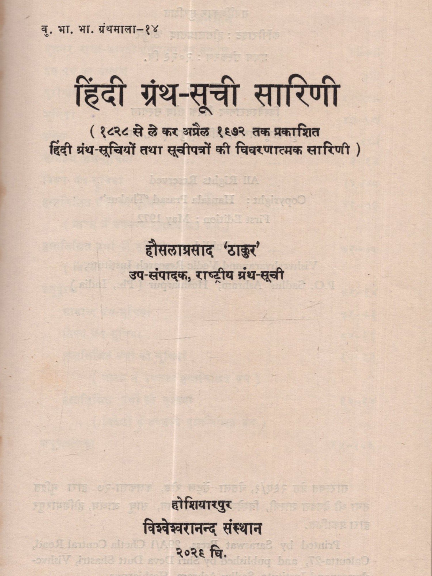 हिन्दी ग्रन्थ-सूची सारिणी: Hindi Granth-Suchi Sarinee (1828 Se Le Kar Aprail 1672 Tak Prakashit Hindi Granth-Suchiyon Tatha Suchipatron Ki Vivaranatmak Sarinee (An Old and Rare Book)