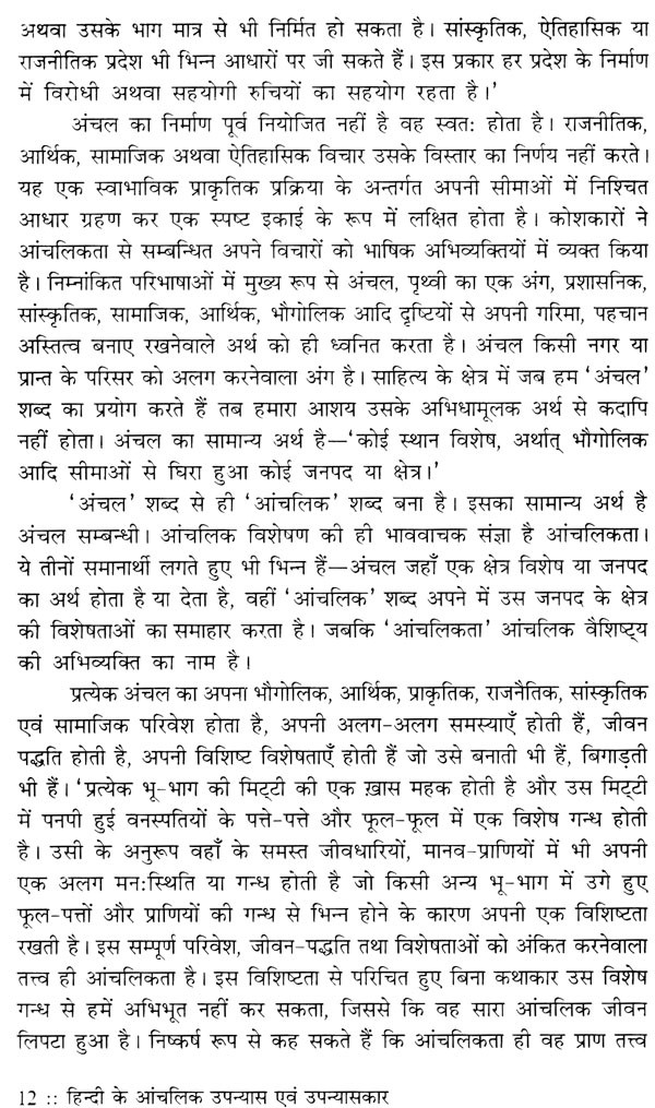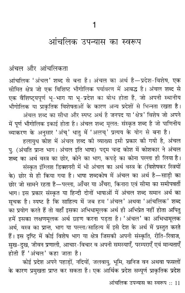 किसी भी देश के सभी अंचल एक दूसरे से अभिन्न होते हुए भी बहुत से अर्थों में अलग-अलग हैं। यदि अंचल की तुलना की जाय तो प्रत्येक अंचल की अपनी विशेषताएँ हैं। इसका कारण यह है कि कोई भी अंचल एक विशिष्ट भौगोलिक पर्यावरण में स्थित होता है। भौगोलिक सीमाओं में बँधे अंचल अपनी धरती को विस्तृत मैदान, झाड़, पहाड़, नदी-नाले, झरने, सरोवर इत्यादि का पूर्ण विवरण देते हैं। भौगोलिक संस्कृति, ऐतिहासिक परम्परा व वैज्ञानिक माध्यम के साथ ही 'अंचल' को एक ठोस व्यक्तित्व प्राप्त होता है। साहित्य समीक्षक कुमार विमल के शब्दों में, डॉ. फणीश सिंह का यह समीक्षात्मक प्रयास आंचलिक उपन्यासों के प्रति किसी आग्रही दृष्टिकोण से प्रेरित नहीं है। आंचलिक उपन्यासों की उपलब्धियों, खासकर संक्रमणशील परिवेश का साक्ष्य बनने की शक्ति का इसमें उद्घाटन हुआ है। इतना ही नहीं, आंचलिक उपन्यासों के समग्र सोच की सीमाएँ भी उभरकर इसमें सामने आयी हैं। निःसन्देह आंचलिक उपन्यासों के पाठकों को यह समीक्षा कृति बहुत कुछ नयी और विचारोत्तोजक सामग्री देने में सफल होगी।