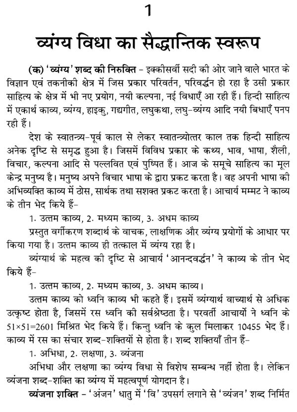 प्रथम अध्याय में व्यंग्य विधा के सैद्धांतिक स्वरूप के विश्लेषण पर विचार किया गया है। व्यंग्य विधा की स्थापना करते हुए उसकी स्वीकृति एवं विधा निर्णयन के प्रतिमान को स्पष्ट किया गया है। व्यंग्य विधा को स्पष्ट करने हुए एतद् विषयन निष्कर्ष प्रस्तुत किए गये हैं।