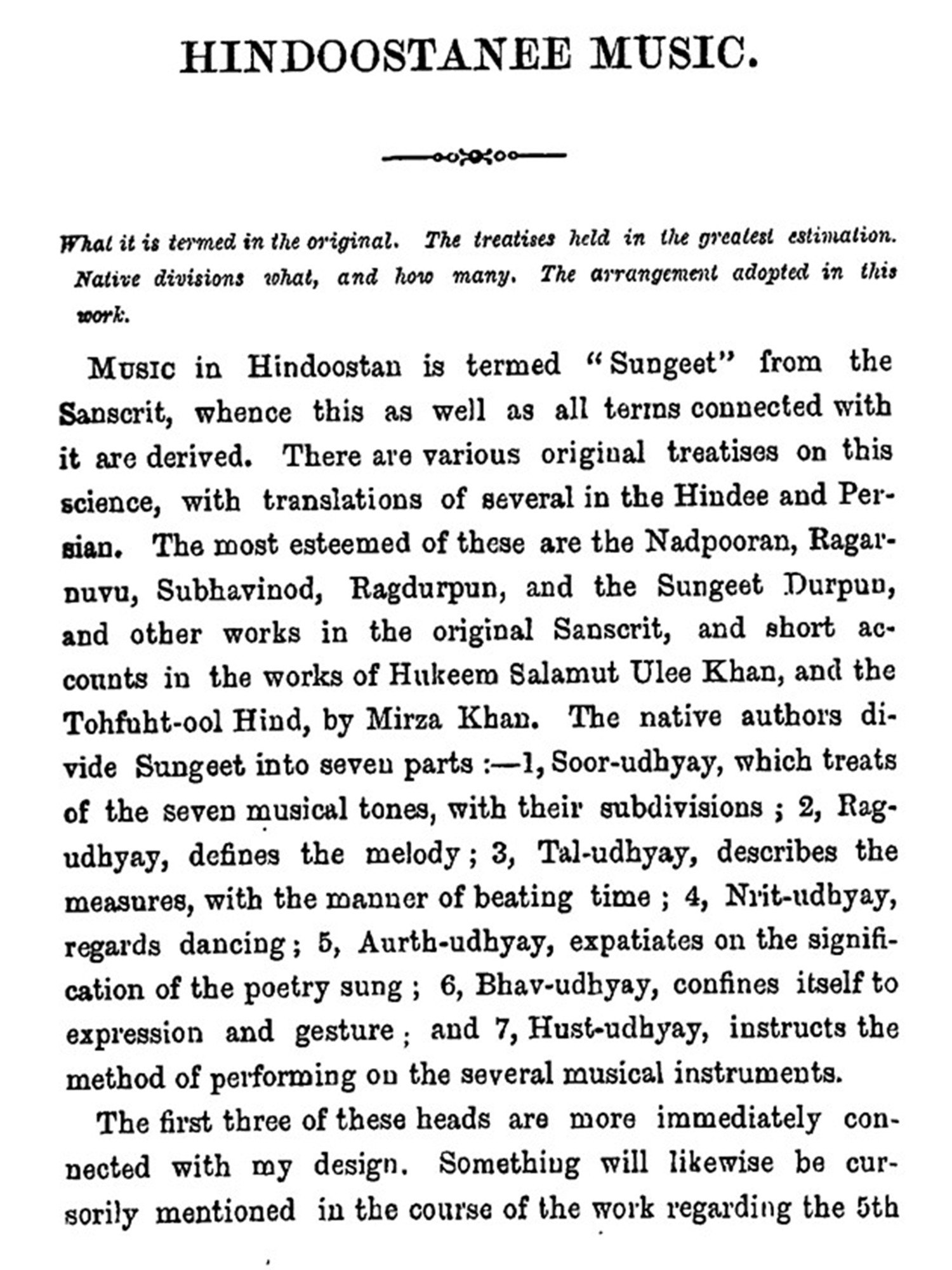 The whole will consist of two parts: The first part contains extracts from almost all the eminent works on Hindu Music extant in the English language.
