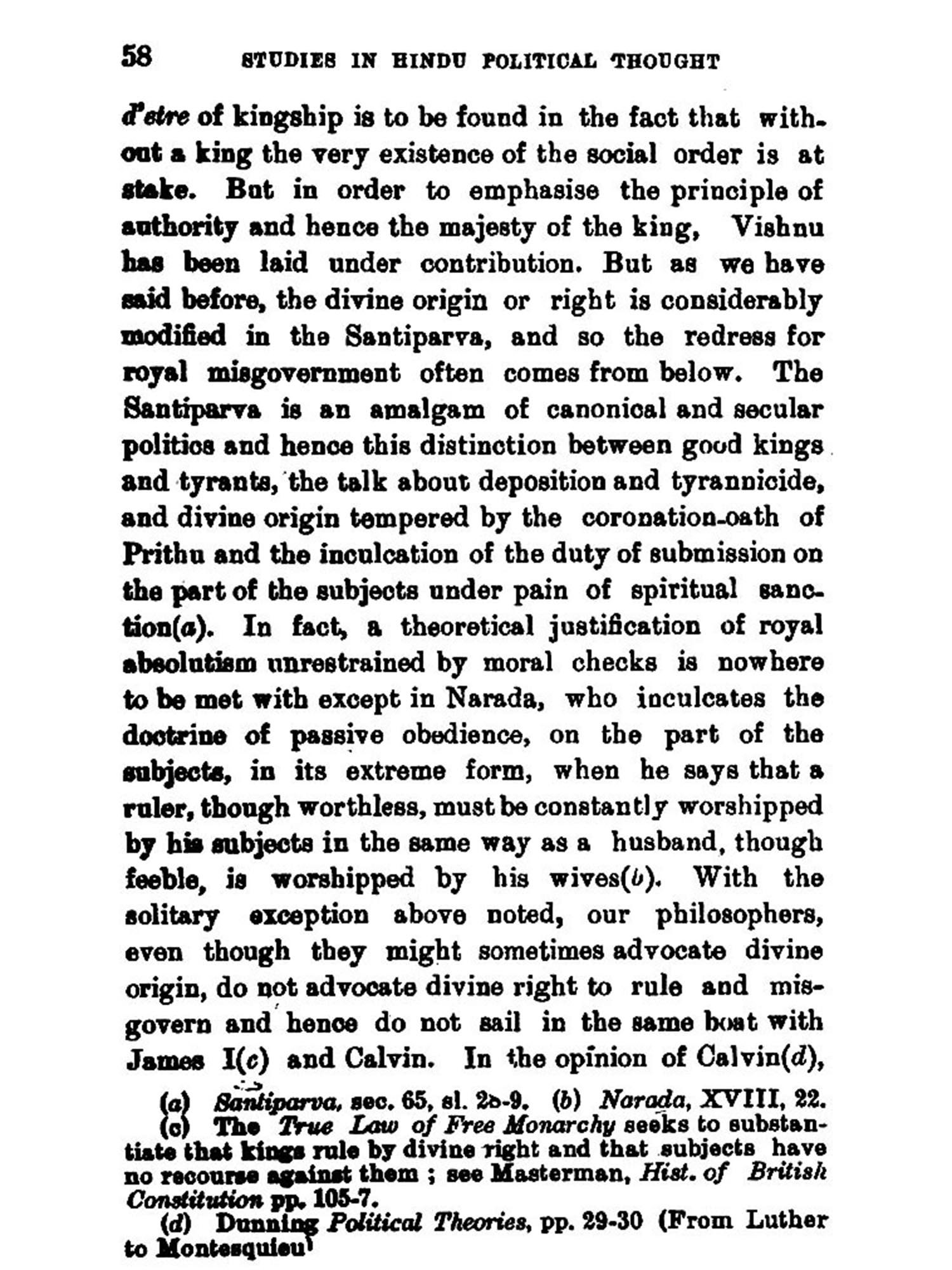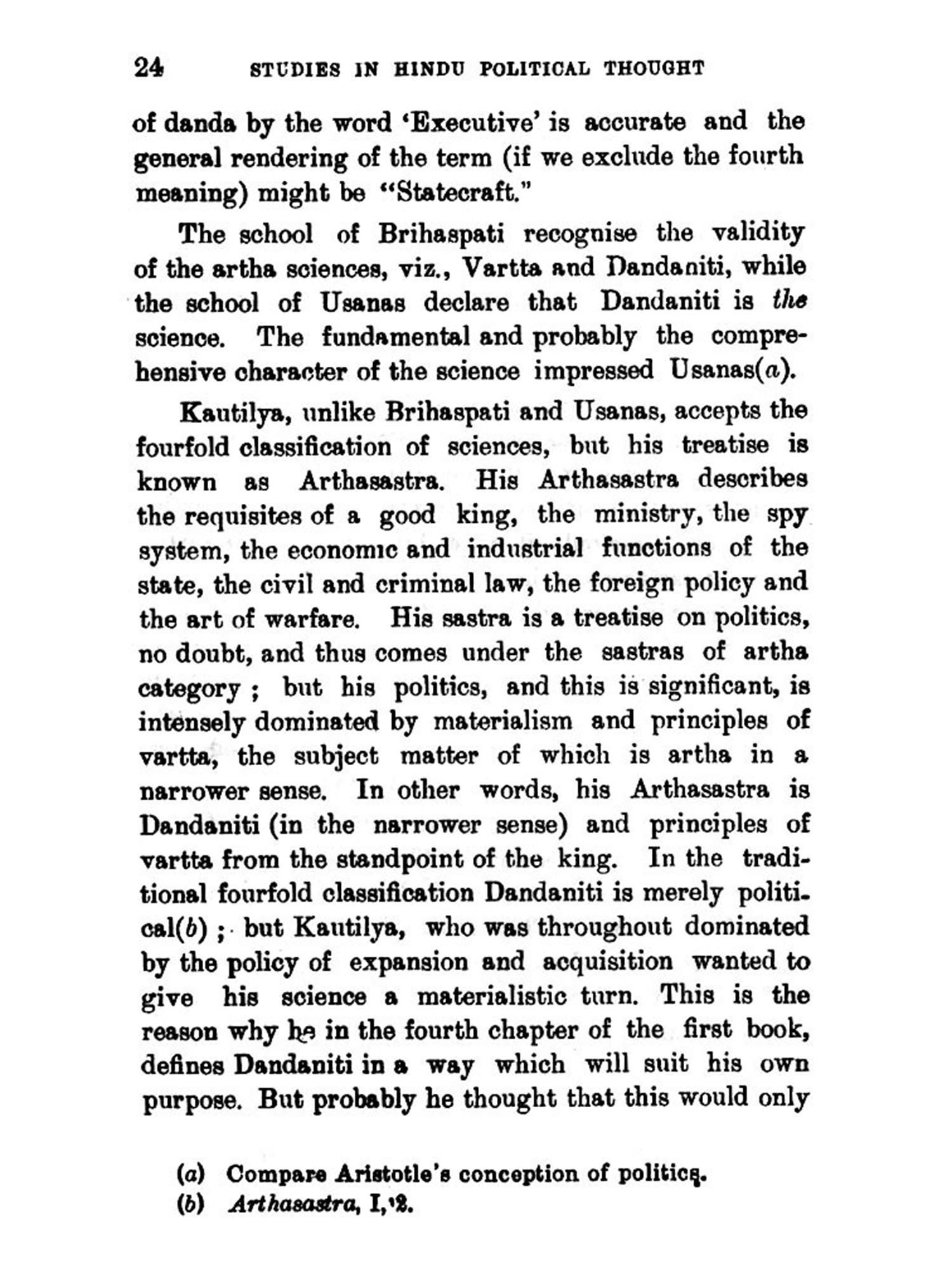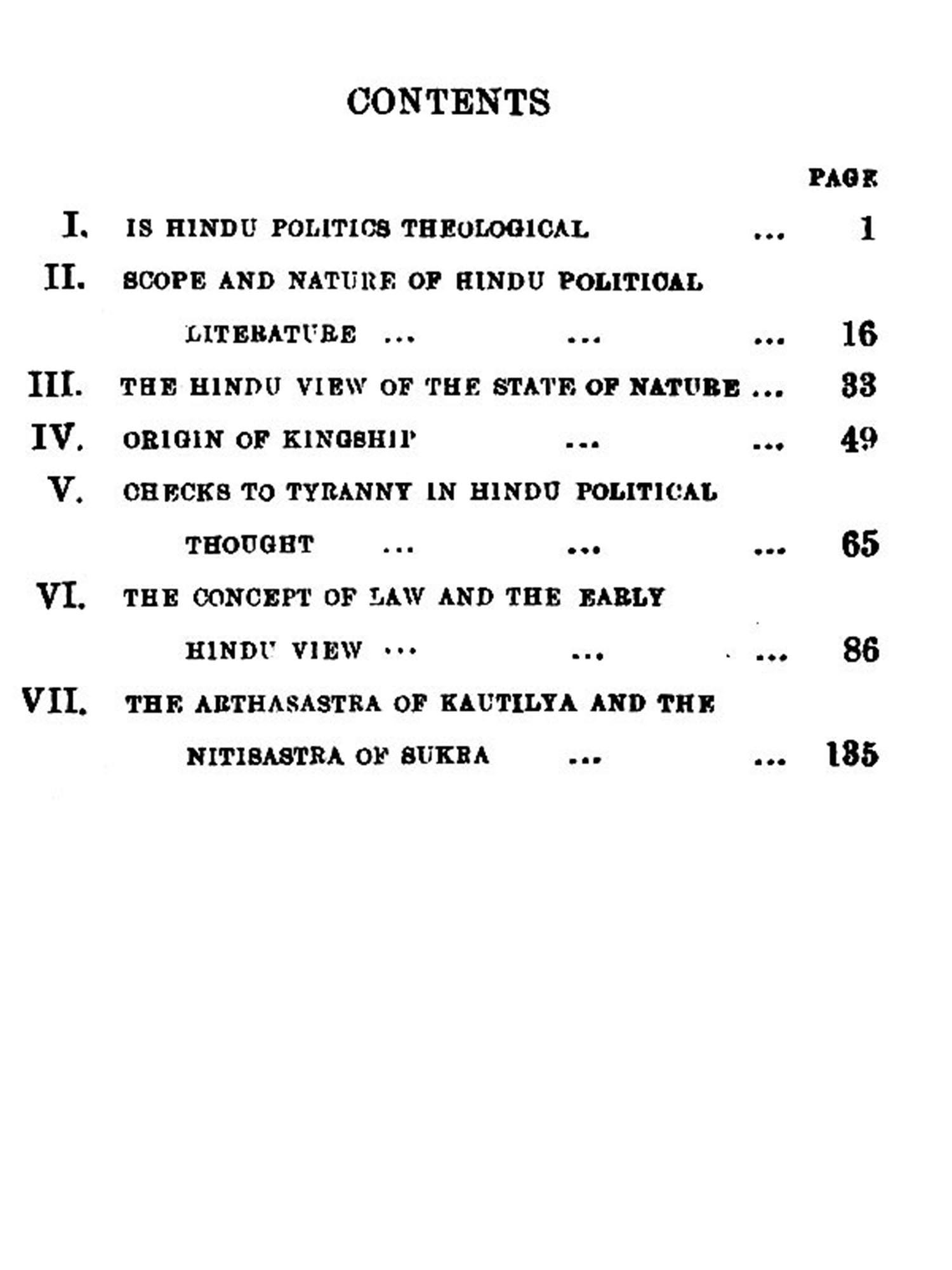 In one sense, it was an evil day for India when the Sacred Books of the East made their appearance: it showed to what absurd lengths 'other-worldli-ness' could go. That the culture of the ancient Hindus was a well-balanced one and that they were as much worldly as any other people, have been amply demonstrated by recent researches in Indology. The present book is the outcome of a desire to establish the fact, that in realms of political thought, the Hindus were not as backward as some writers try to make out; and with that end in view, I have examined some aspects of political thought in some detail.