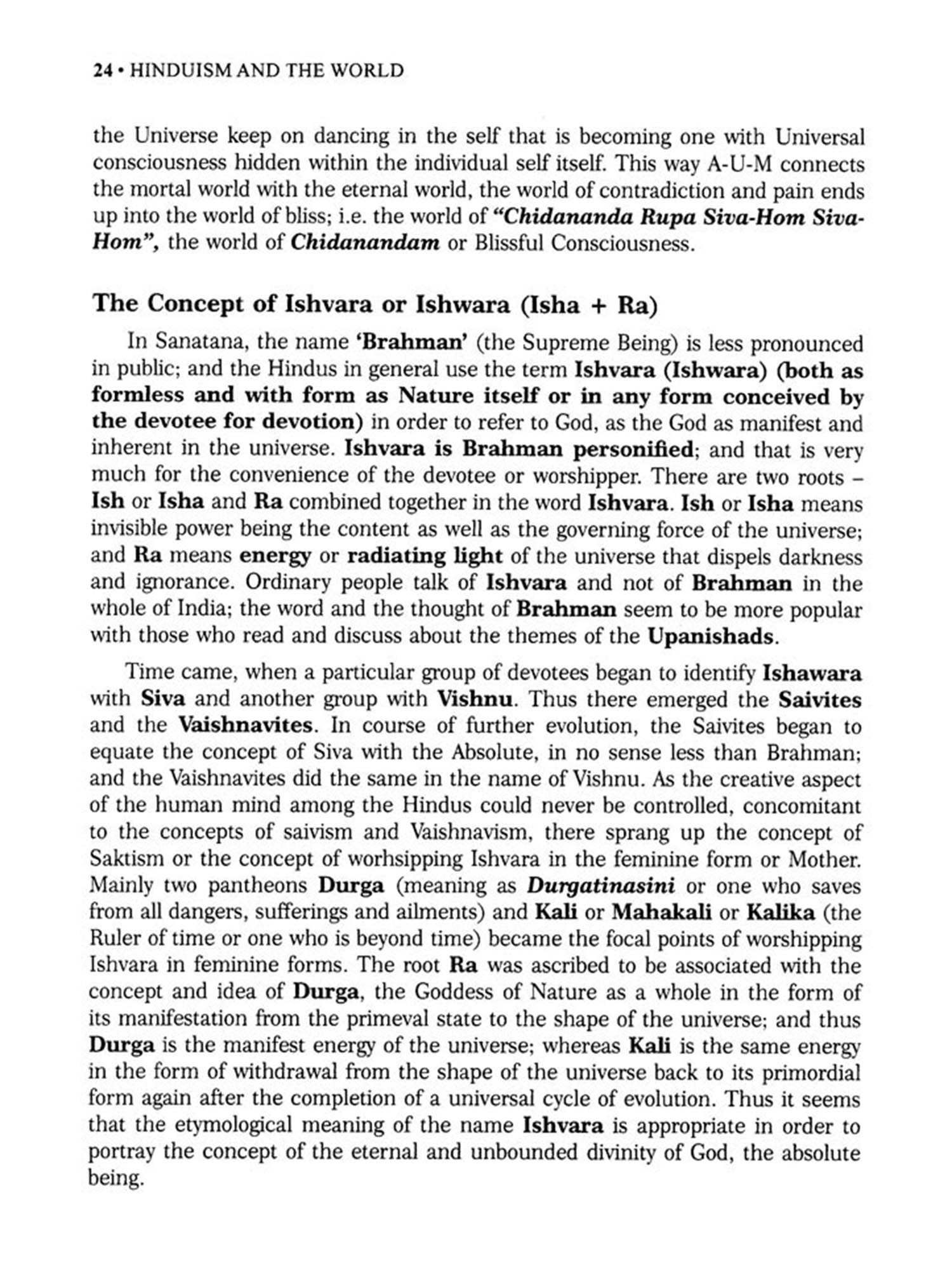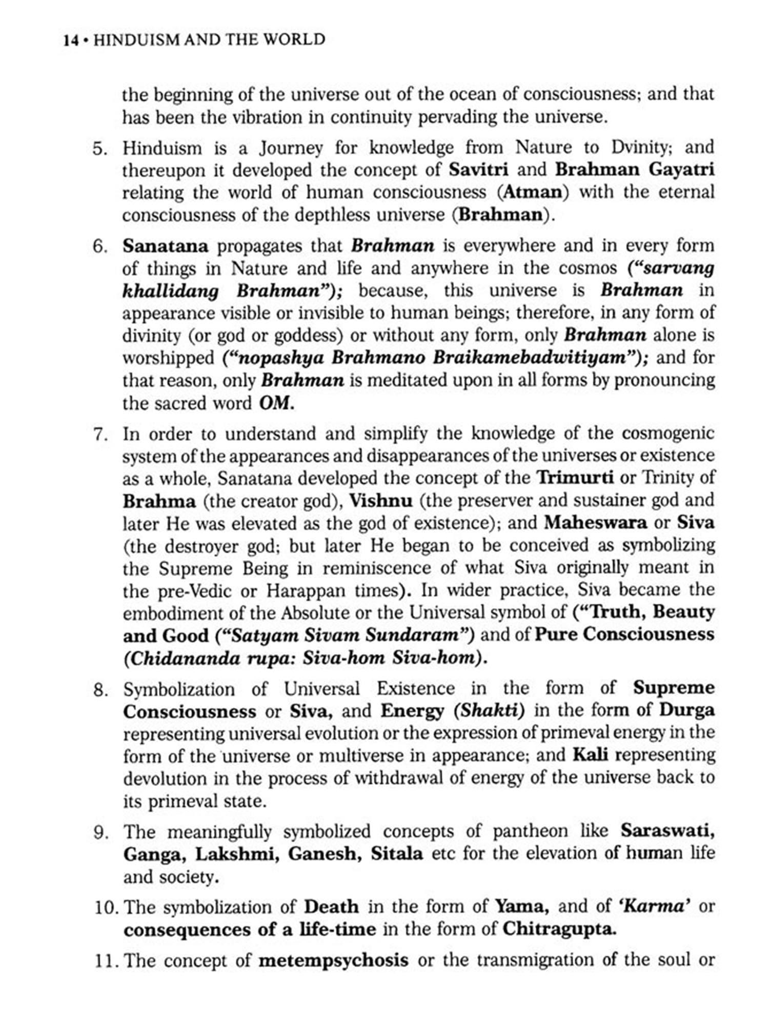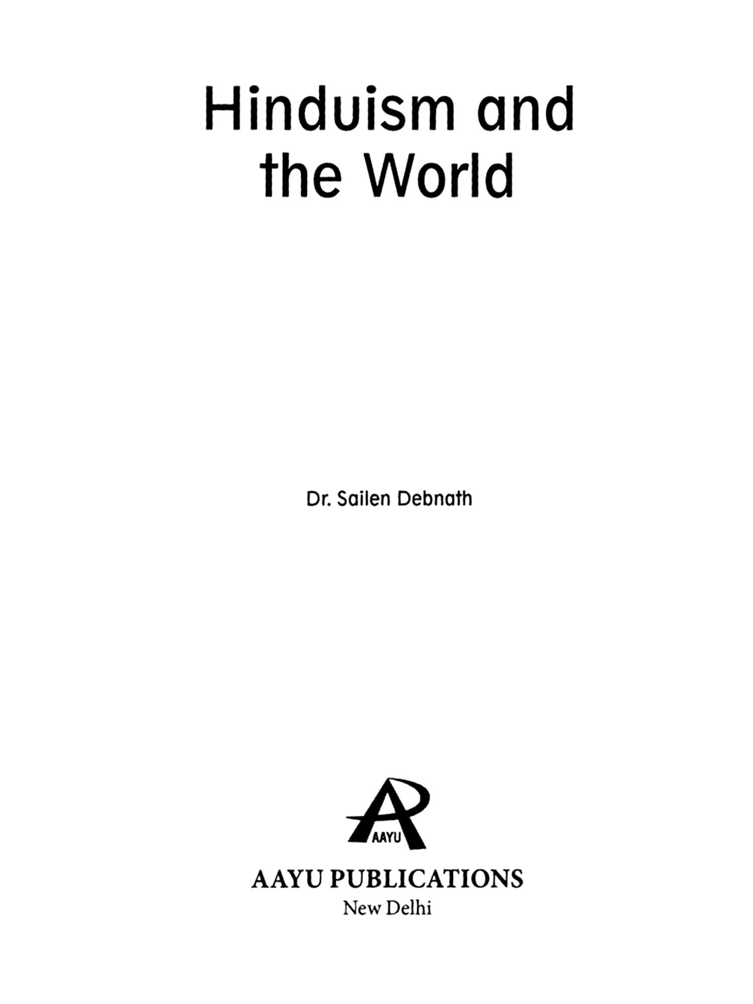 'Hinduism and the World' is a delineation of the inner meaning, essence, scientific foundation and evolution of Sanatana (Dharma), called Hinduism by foreigners, from its genesis in the abyss of time in the past, with distinct progress of Yoga, meditation and the concept of 'Pasupati Siva' in the Indus Valley (Harappan) Civilization and subsequent stages of evolution with the emergence of the Vedas, specifically the in-depth studies of Brahman and Atman in the Upanishads and the Geeta, all through the Vedic Age; the long Buddhist millennium from sixth century B.C. to fourth century C.E.; and then through the Age of Sankara's Vedanta and medieval 'Bhaktivada'. The world-wide impact of the Upanishads and of the Geeta and further proliferation of Hindu view of life, time and the universe in the recent centuries are well explained. The concepts of the Hindu pantheon, symbols of 'Sura and Asura' (like matter and anti-matter), the lotus, Kalpavriksha, Samudra Manthan have seen the light of deeper interpretations.