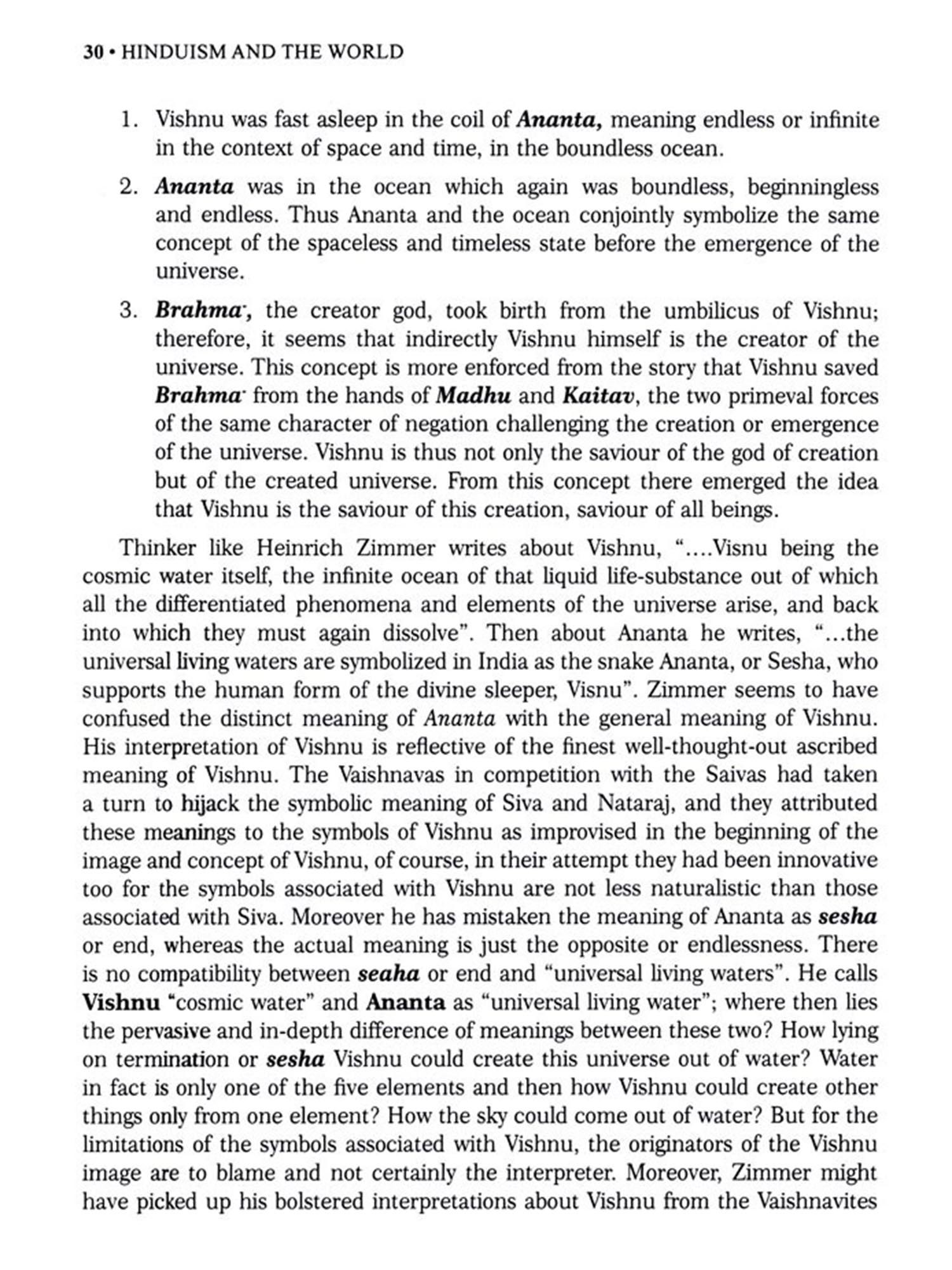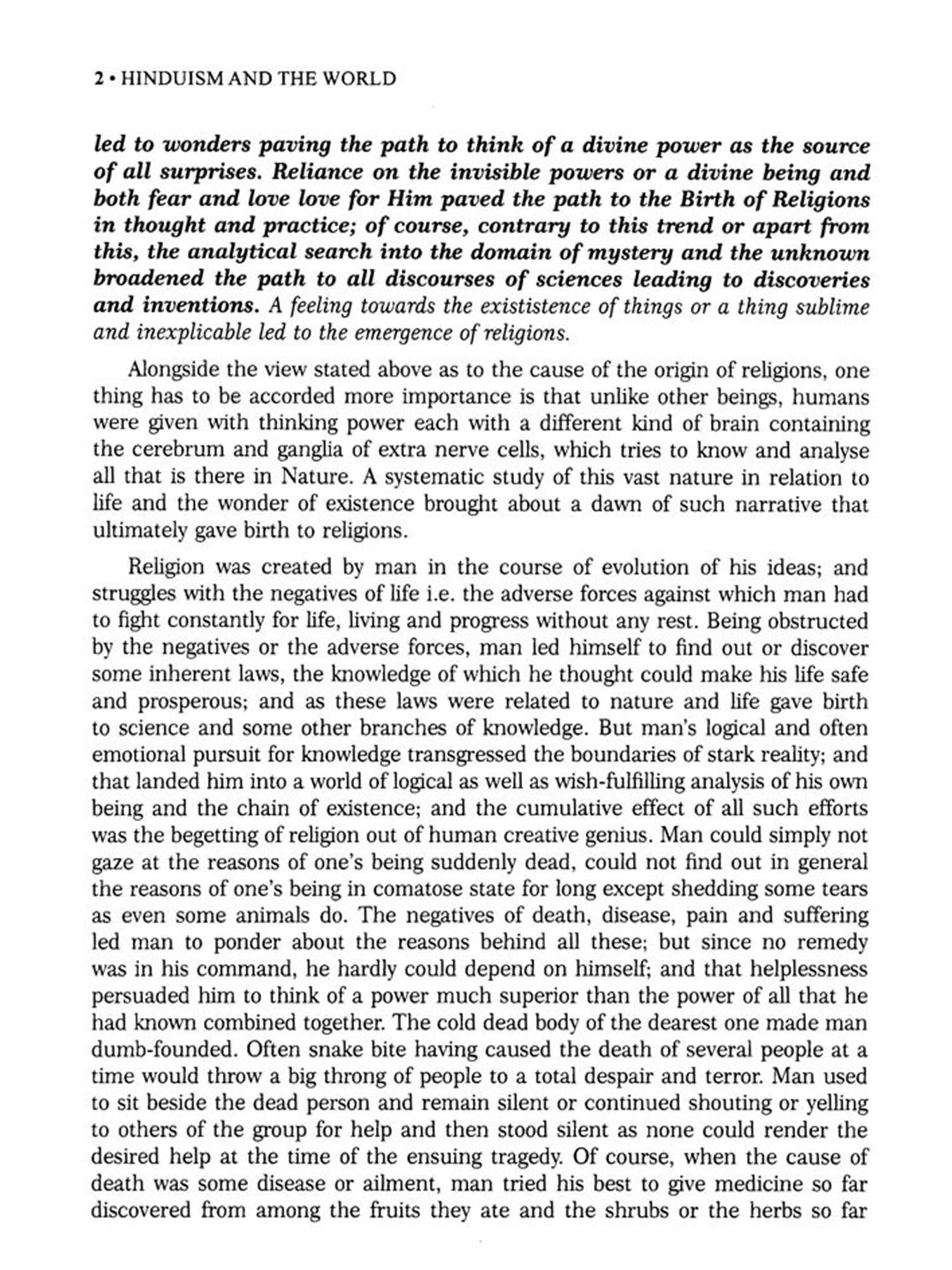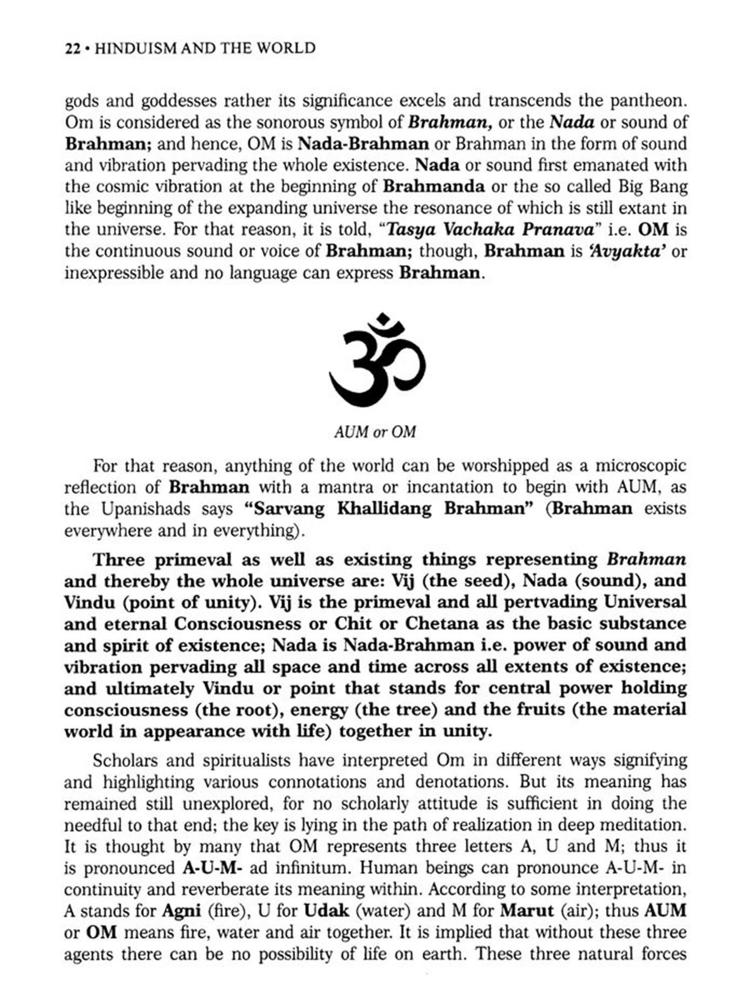 'Hinduism and the World' is a delineation of the inner meaning, essence, scientific foundation and evolution of Sanatana (Dharma), called Hinduism by foreigners, from its genesis in the abyss of time in the past, with distinct progress of Yoga, meditation and the concept of 'Pasupati Siva' in the Indus Valley (Harappan) Civilization and subsequent stages of evolution with the emergence of the Vedas, specifically the in-depth studies of Brahman and Atman in the Upanishads and the Geeta, all through the Vedic Age; the long Buddhist millennium from sixth century B.C. to fourth century C.E.; and then through the Age of Sankara's Vedanta and medieval 'Bhaktivada'. The world-wide impact of the Upanishads and of the Geeta and further proliferation of Hindu view of life, time and the universe in the recent centuries are well explained. The concepts of the Hindu pantheon, symbols of 'Sura and Asura' (like matter and anti-matter), the lotus, Kalpavriksha, Samudra Manthan have seen the light of deeper interpretations.