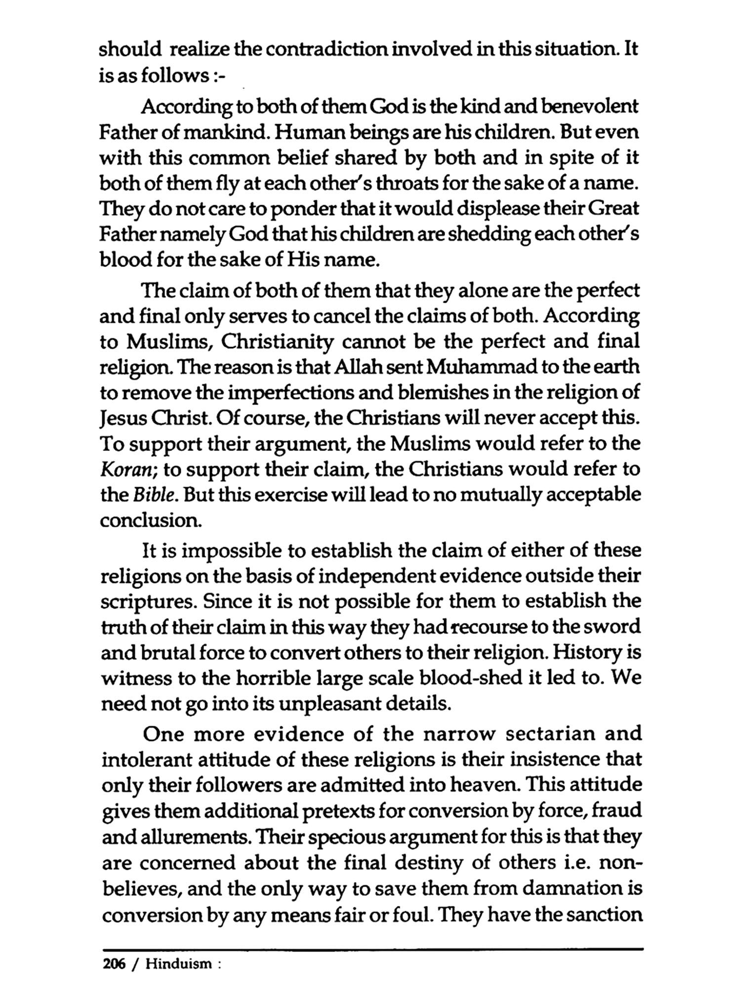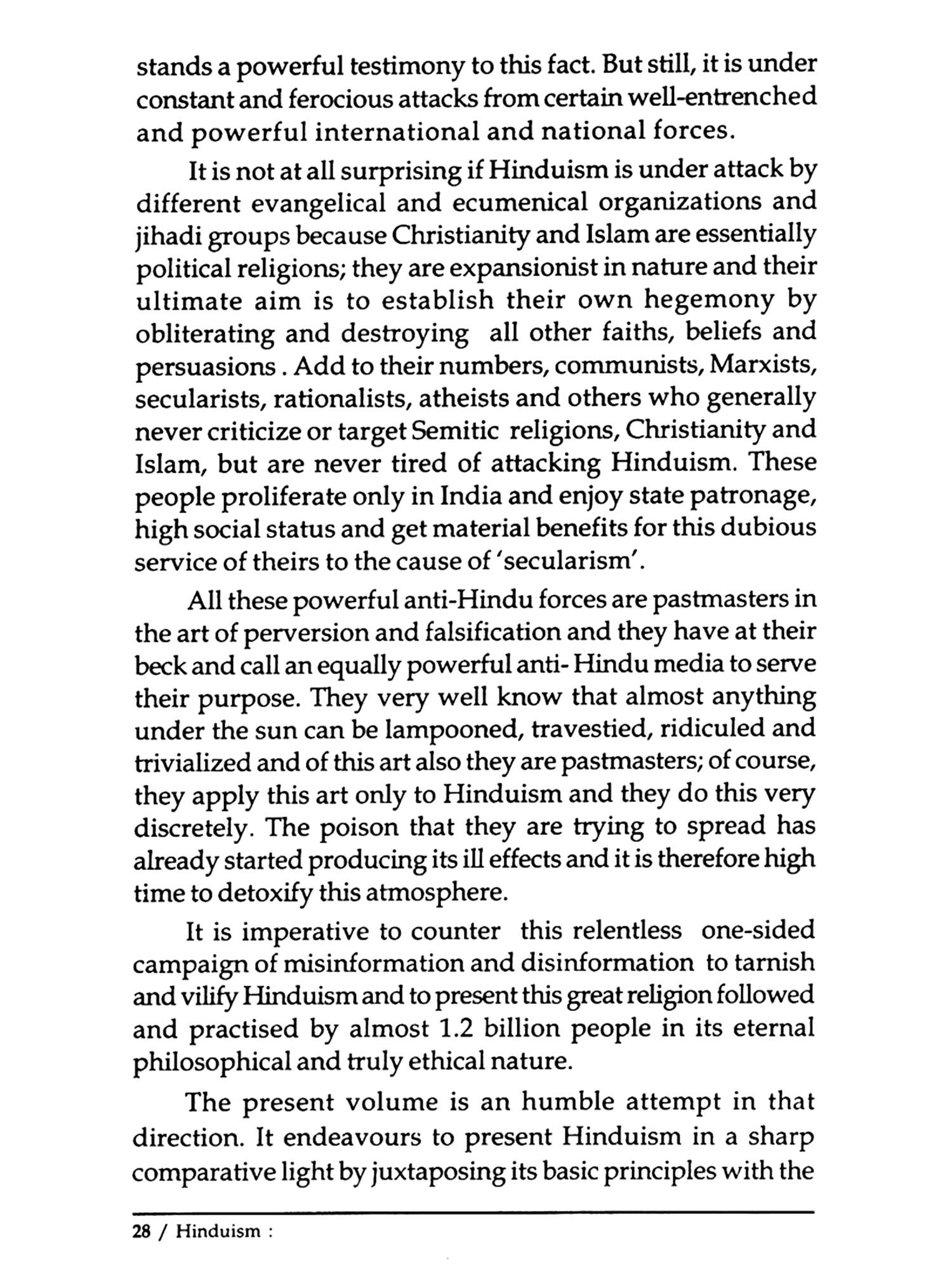 Unlike Abrahamanic faiths, namely, Judaism, Christianity and Islam, Hinduism is not a closed system, stagnant and frozen with a single prophet, a single gospel and a single ever-jealous intolerant God. It is a natural growth from the meditations and philosophical speculations of innumerable vibrant minds who were constantly in search of the Transcendental. It is not averse to questions, however disturbing and full of philosophical implications. It is clearly for this reason that in our modern world of science Hinduism alone can stand high and tall. The basic tenets Abrahamanic faiths have already been disproved by science. This book devotes many of its chapters to the discussion of this subject alone. It throws a valuable comparative light on all these religions by juxtaposing their tenets. No other book has so far done this for reasons not difficult to guess. It is hoped that this book will help both friends and adversaries, followers and critics of Hinduism to understand this great and only philosophical religion better.