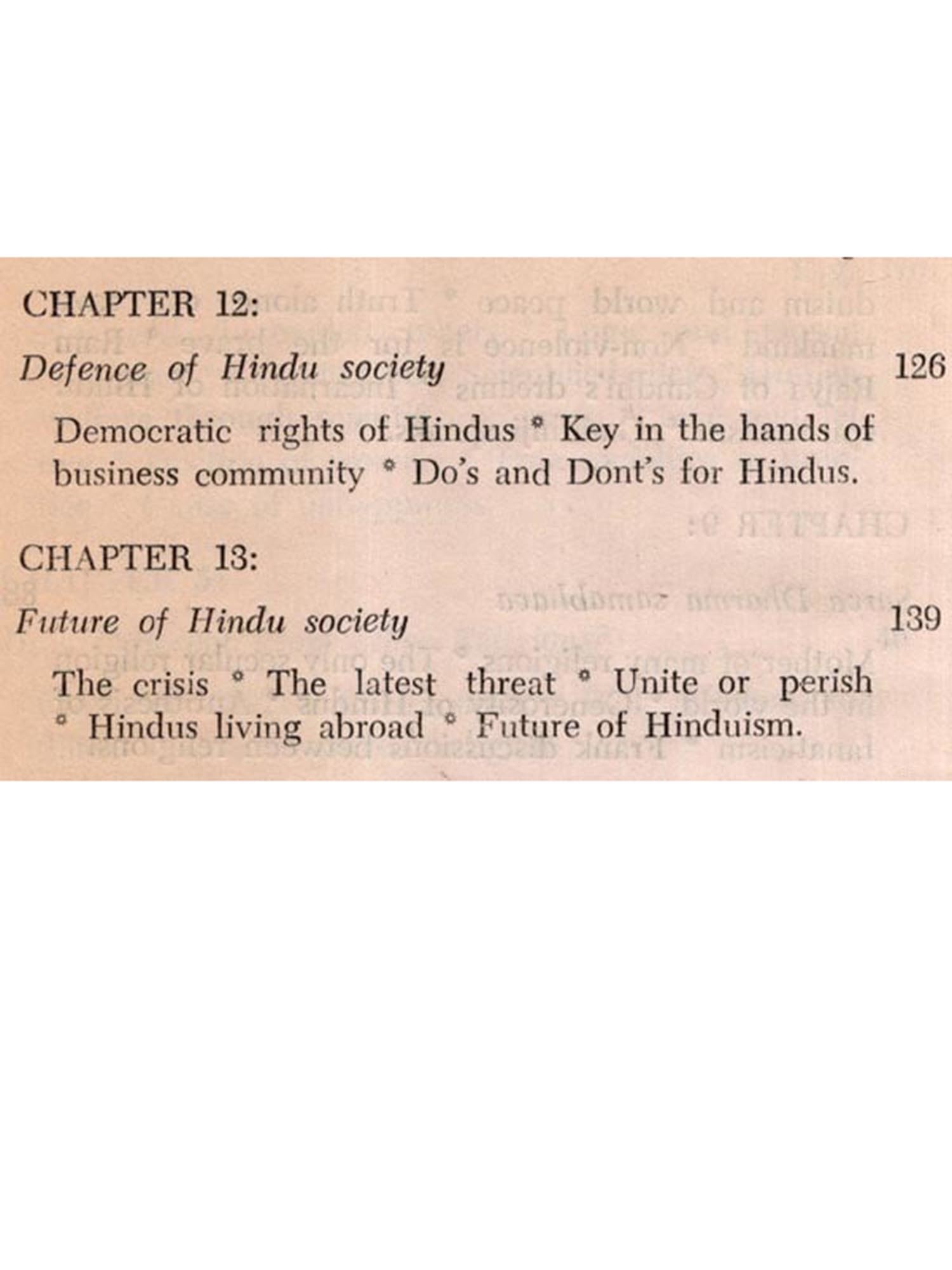 The time has come for all Hindus to become conscious of the part they should play in life if Hinduism and our ancient civilisation and culture are to endure. Every Hindu shares this responsibility. But his responsibility can materialise only if he keeps his faith in the high destiny of Hinduism. This book may help substantiate his faith in his religion by giving it a rational basis, and logically explaining to him why he should defend Hindu-ism.