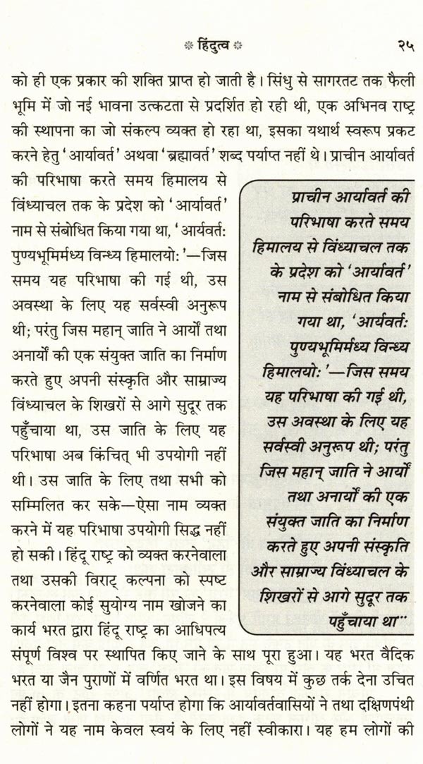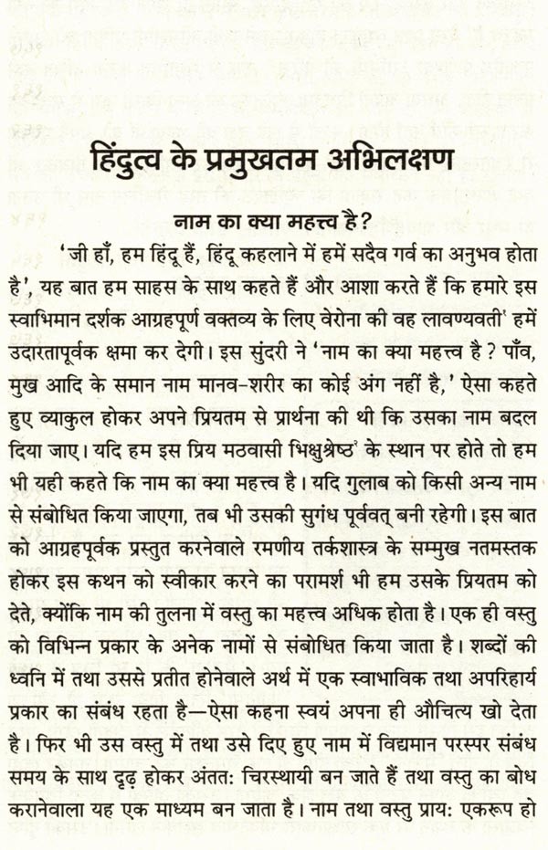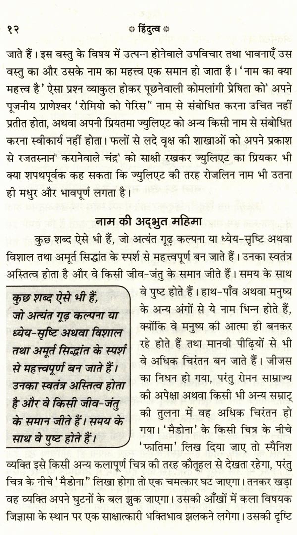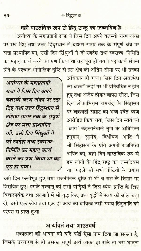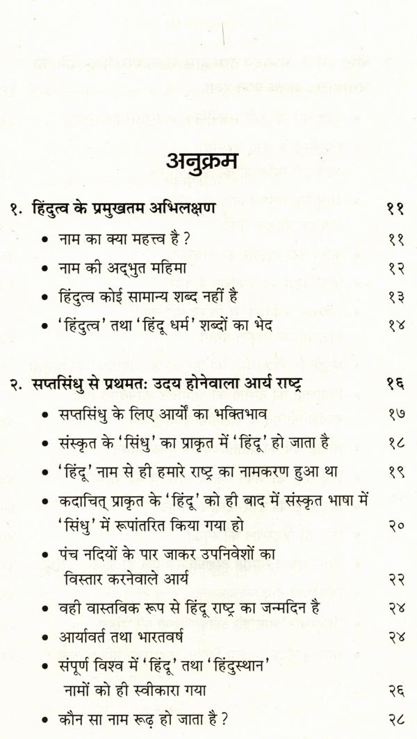 'हिंदुत्व' दुत्व' एक ऐसा शब्द है, जो संपूर्ण मानवजाति के लिए आज भी अपूर्व स्फूर्ति तथा चैतन्य का स्रोत बना हुआ है। इस शब्द से संबद्ध विचार, महान् ध्येय, रीति-रिवाज तथा भावनाएँ कितनी विविध तथा श्रेष्ठ हैं। 'हिंदुत्व' कोई सामान्य शब्द नहीं है। यह एक परंपरा है। एक इतिहास है। यह इतिहास केवल धार्मिक अथवा आध्यात्मिक इतिहास नहीं है। अनेक बार 'हिंदुत्व' शब्द को उसी के समान किसी अन्य शब्द के समतुल्य मानकर बड़ी भूल की जाती है। वैसे यह इतिहास मात्र नहीं है, वरन् एक सर्वसंग्रही इतिहास है। 'हिंदू धर्म', यह शब्द 'हिंदुत्व' से ही उपजा उसी का एक रूप है, उसी का एक अंश है। 'हिंदुत्व' शब्द में एक राष्ट्र, हिंदूजाति के अस्तित्व तथा पराक्रम के सम्मिलित होने का बोध होता है। इसीलिए 'हिंदुत्व' शब्द का निश्चित आशय ज्ञात करने के लिए पहले हम लोगों को यह समझना आवश्यक है कि 'हिंदू' किसे कहते हैं। इस शब्द ने लाखों लोगों के मानस को किस प्रकार प्रभावित किया है तथा समाज के उत्तमोत्तम पुरुषों ने, शूर तथा साहसी वीरों ने इसी नाम के लिए अपनी भक्तिपूर्ण निष्ठा क्यों अर्पित की, इसका रहस्य ज्ञात करना भी आवश्यक है। प्रखर राष्ट्रचिंतक एवं ध्येयनिष्ठ क्रांतिधर्मा वीर सावरकर की लेखनी से निःसृत 'हिंदुत्व' को संपूर्णता में परिभाषित करती अत्यंत चिंतनपरक एवं पठनीय पुस्तक ।