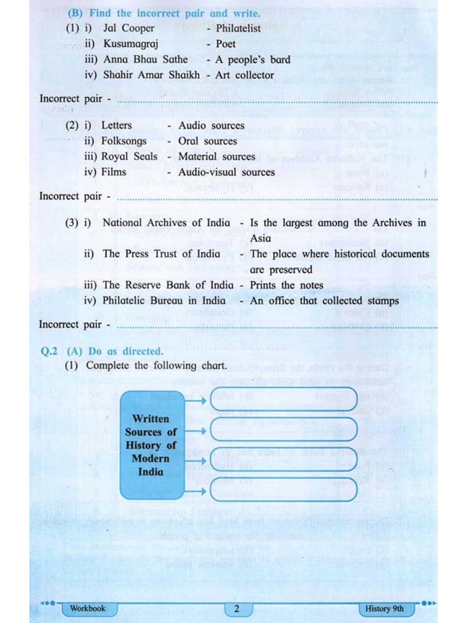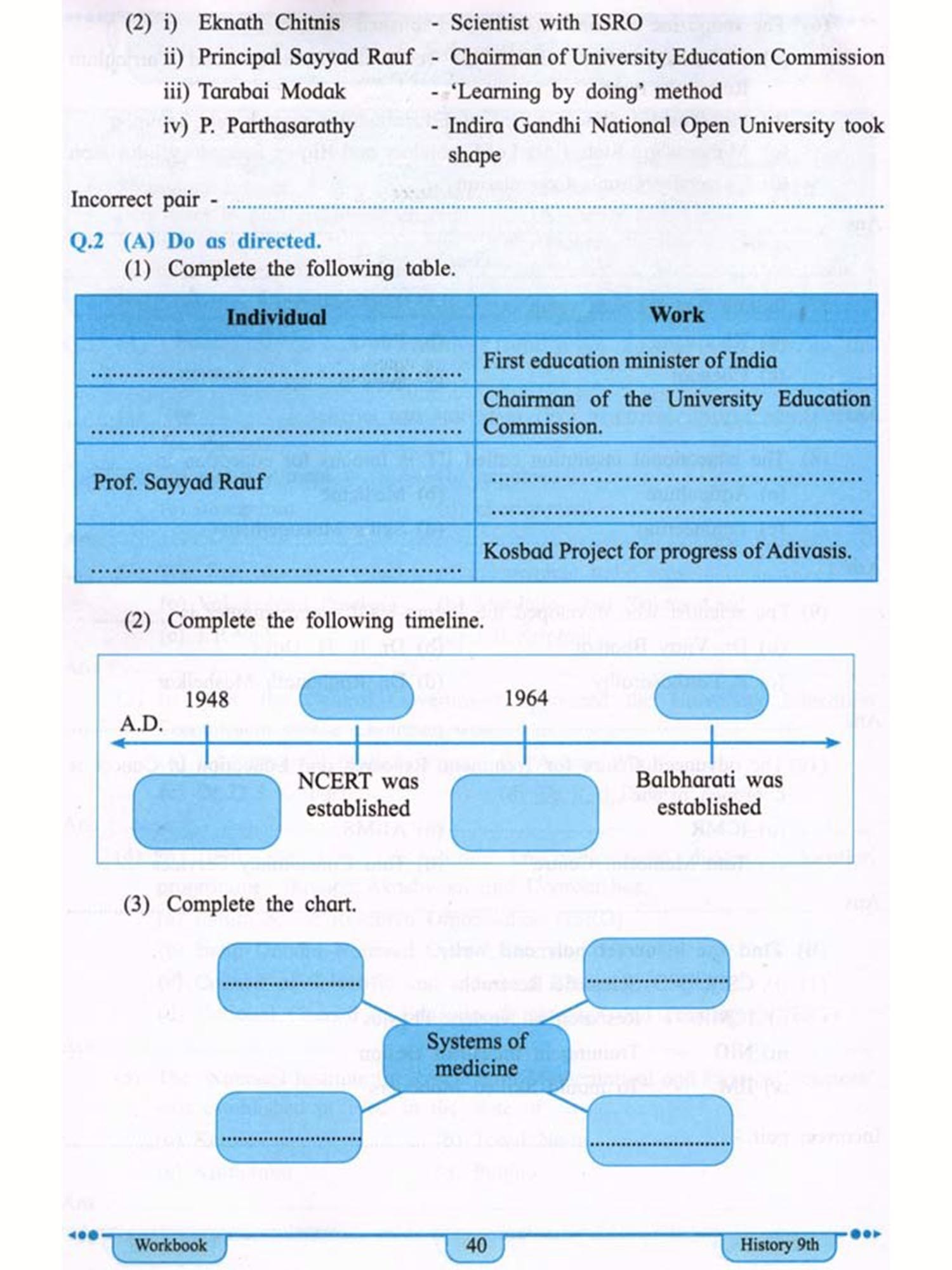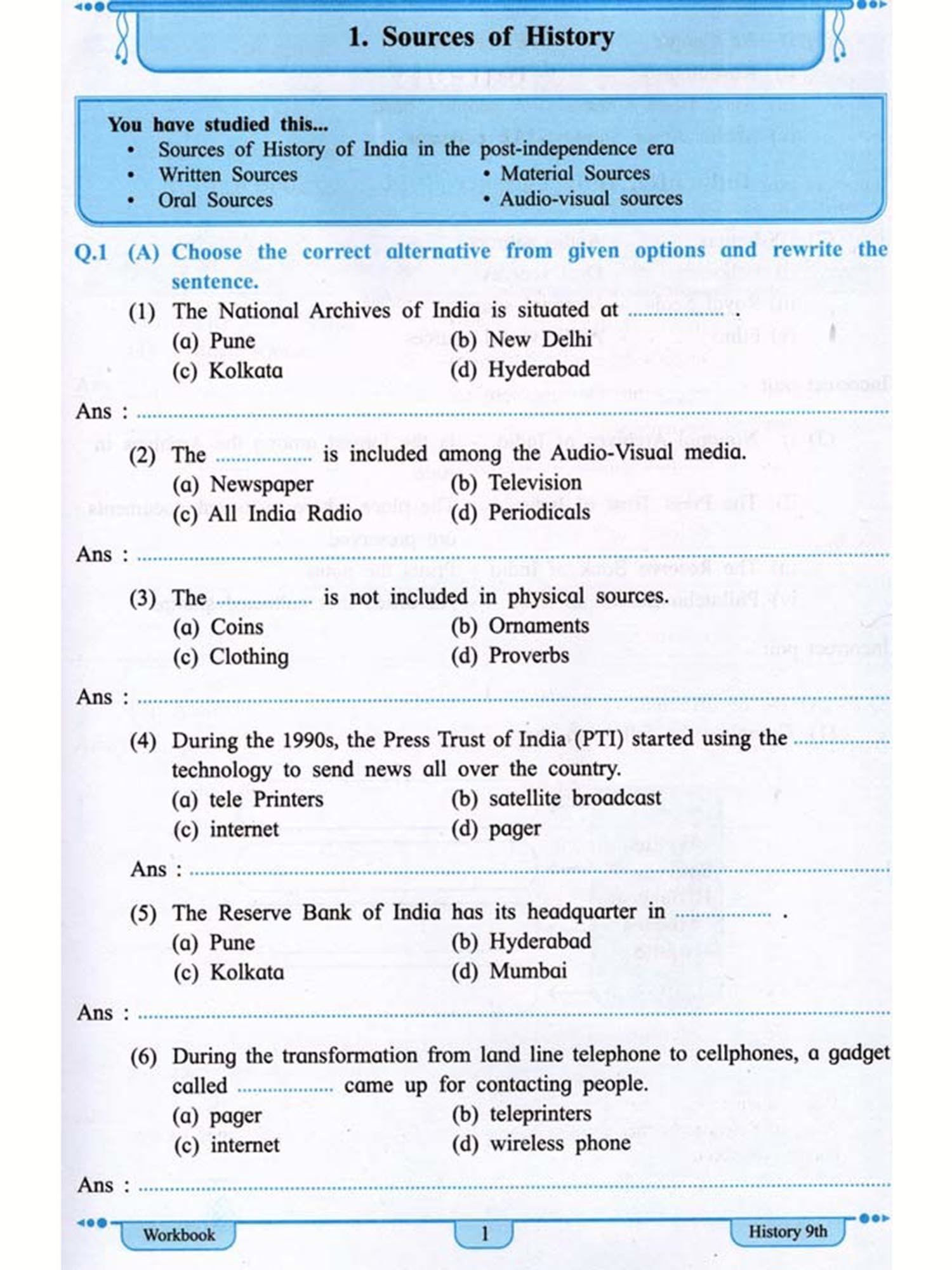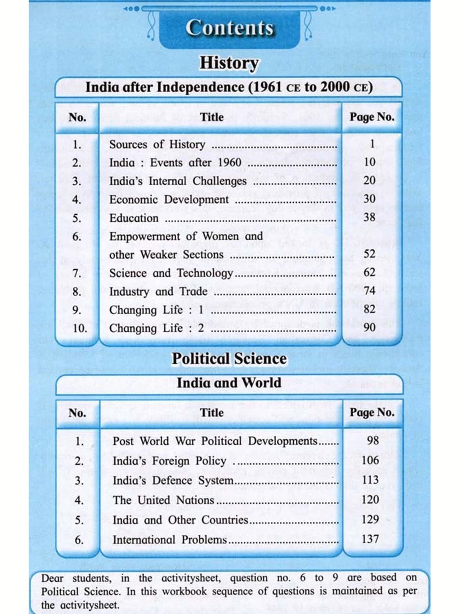 In the History and Political Science textbook of Standard IX, in history section you are studying progress of India in social, cultural and other areas that occurred after 1961. Similarly as a part of Political Science syllabus you have studied main currents in world since 1945, evolutions of India's foreign policy, our security system and challanges before them. Maharashtra State Bureau of Textbook Production and Curriculum Research (Balbharati) is engaged in production of textbooks and other supplementary material. With an objective of providing you with exercises based an activity sheet and to help you in day-to-day learning, this workbook is designed for the first time.