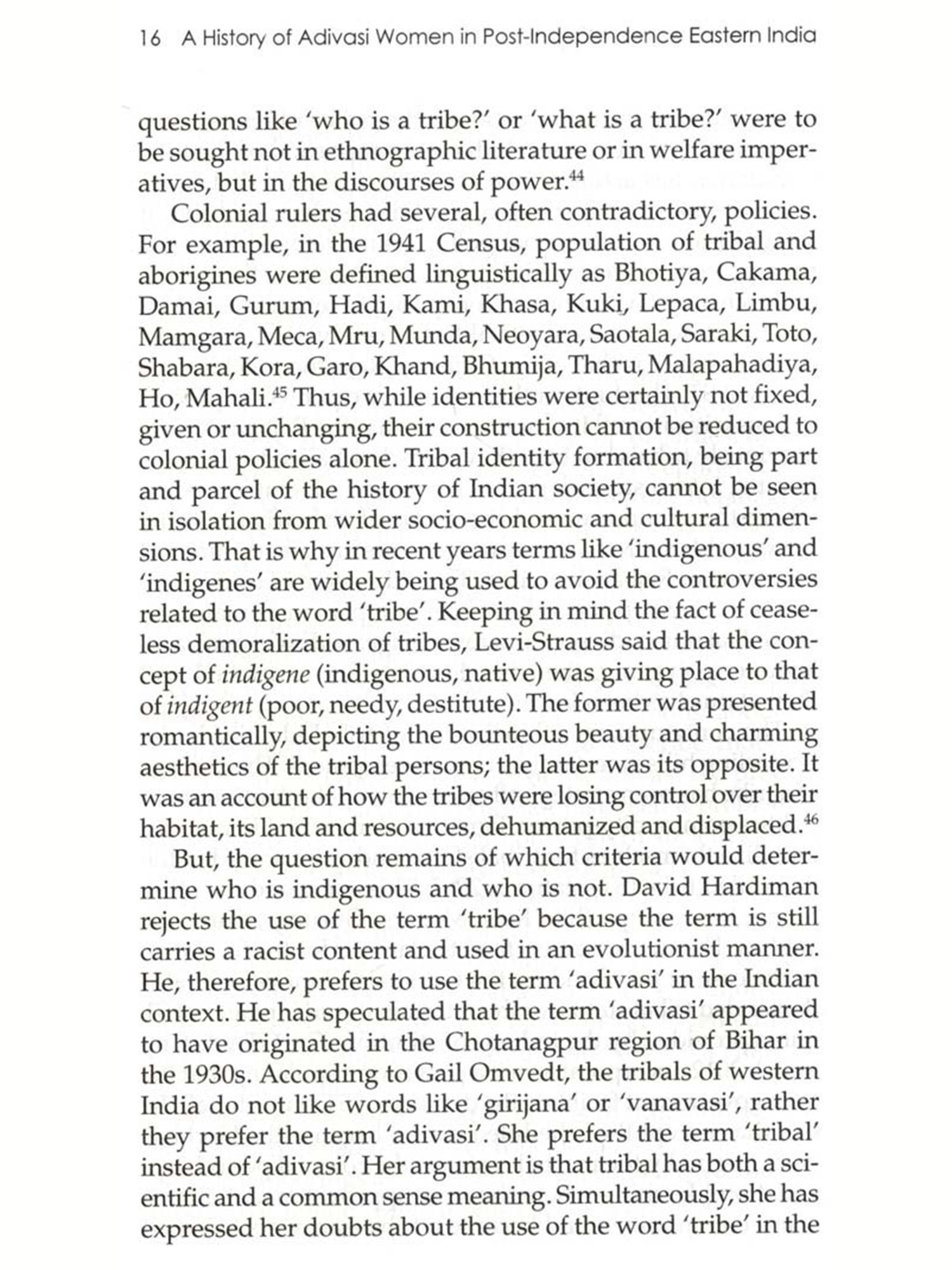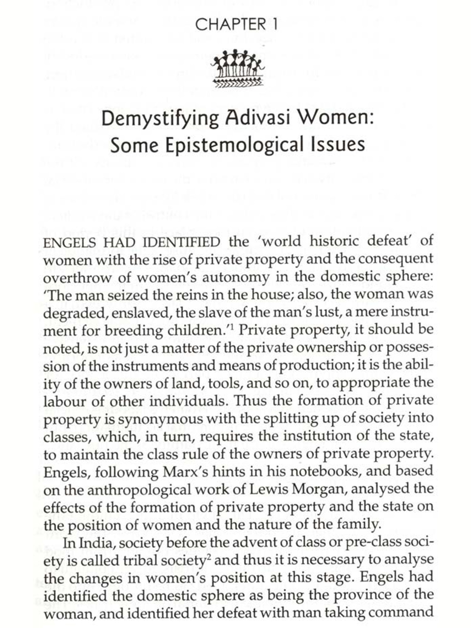 Previously, gender studies was regarded as an addendum and women's movements as a concomitant movement. It is the indigenous women who are leading grassroot democracy. Women have always been doubly colonized. Their stories have always remained at the periphery. Realization of this is evident in the establishment attached to various universities in India. An objective and scientific interpretation of culture from the women's point of view is, however, still lacking. Women scholars have not yet been able to carve out a niche for themselves where their position is secure. There is still a voice in the wilderness; a voice seldom heard even by women themselves. And it is not surprising that not a single woman scholar has ever tried to deal with the status of tribal women. What Begum Rokeya Sakhawat Hossain did on Muslim women, M. Borthswick did on Bengali upper caste bhadramahila and Devaki Jain on working class women; we do not find that extensive research on tribal women by any woman historian.
