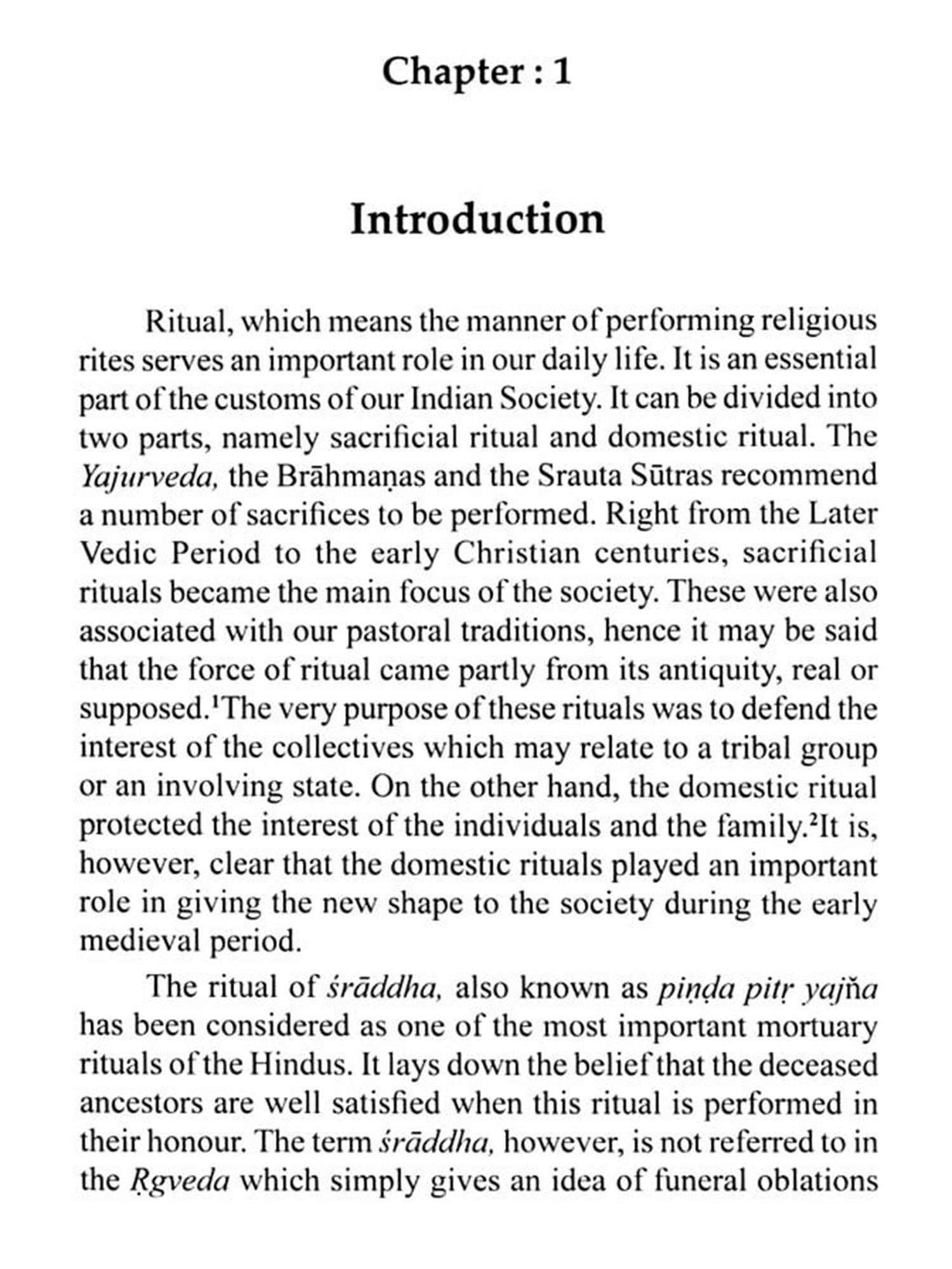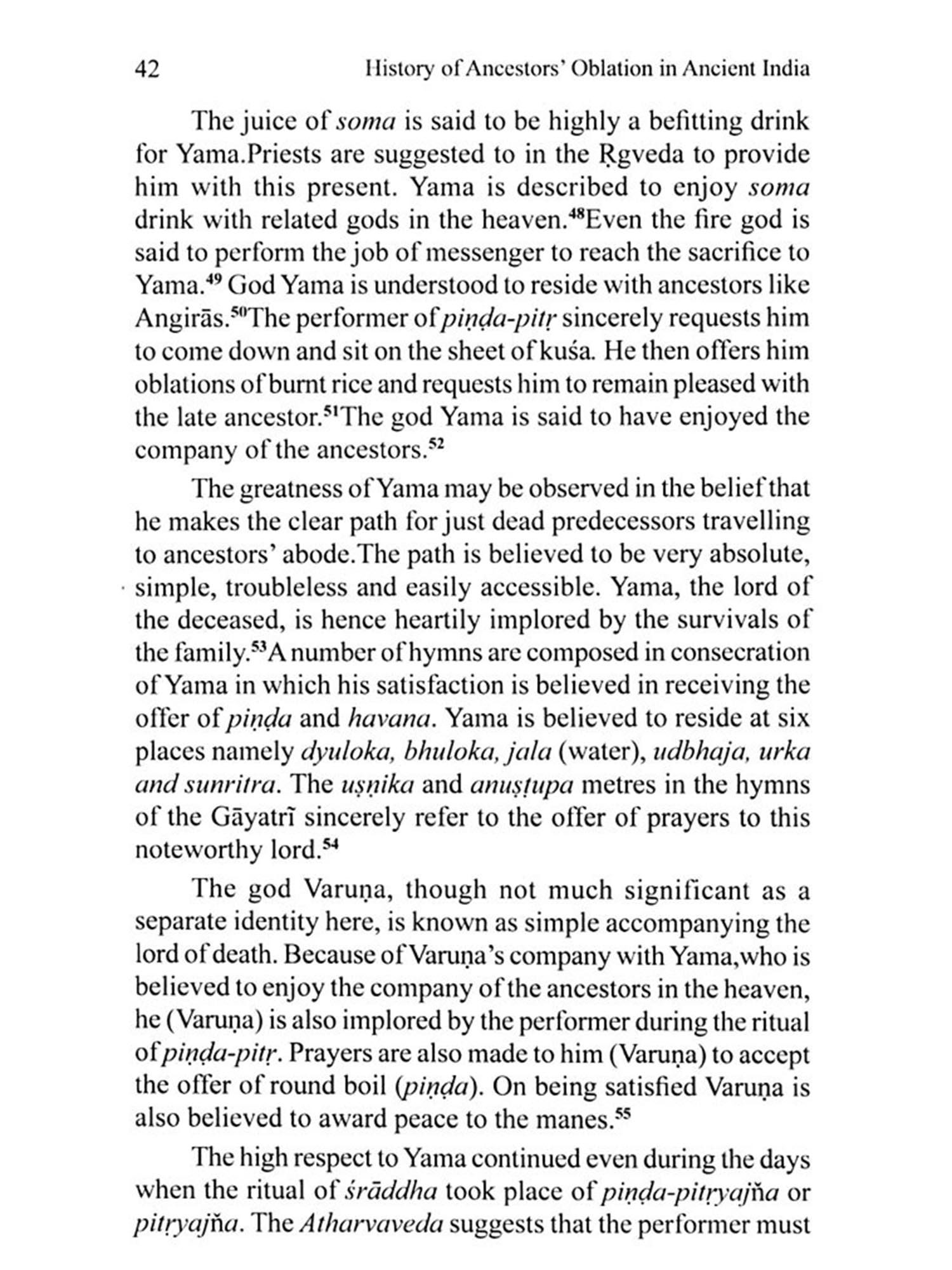 Of all the rituals prevalent in Brāhmaņical socio-religious ethos, the post mortem final ritual or śrāddha occupies a very significant position in ancient Indian literature. Noticeably, the term śrāddha as a ritual does not find mention in the Rgveda. The text, however, refers to terms like pinda pitţ yajña or pittyajňa which concentrates upon ancestors' worship or aims at offerings of pindas to ancestors. Prayers are made in the Rgveda to related gods for their satisfaction and bliss in the heaven. Rta or great universal discipline, the centric guide to whole universe, was believed to point out and highlight its noteworthiness in all aspects of human life and the society. It was also believed that it provided proper guidance in maintaining oblations to ancestors and they were regarded to follow suit the path of rta in the heaven.