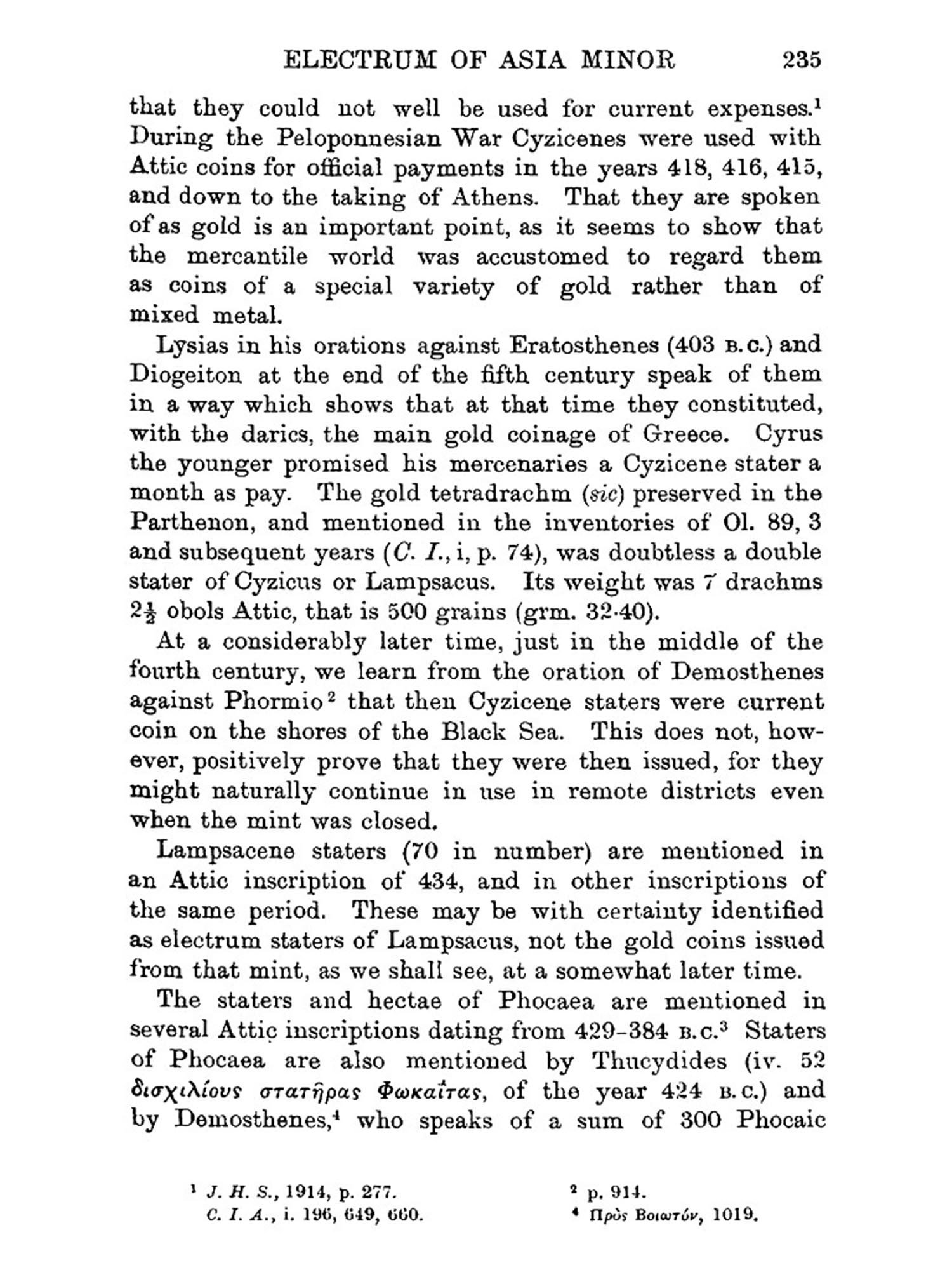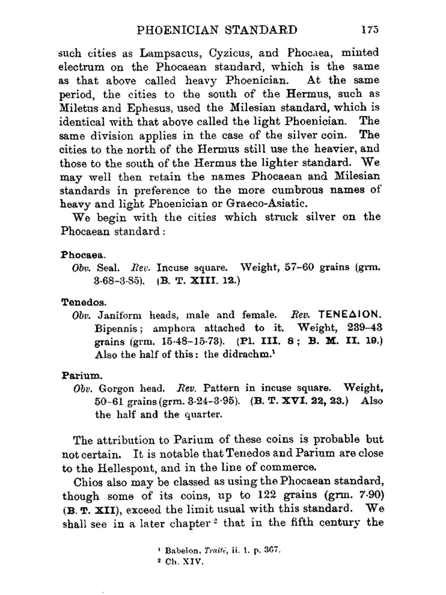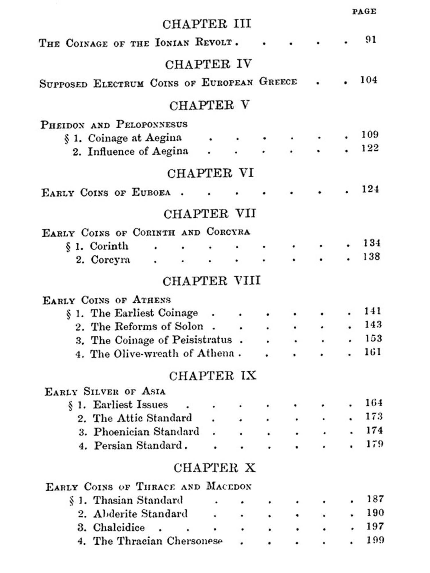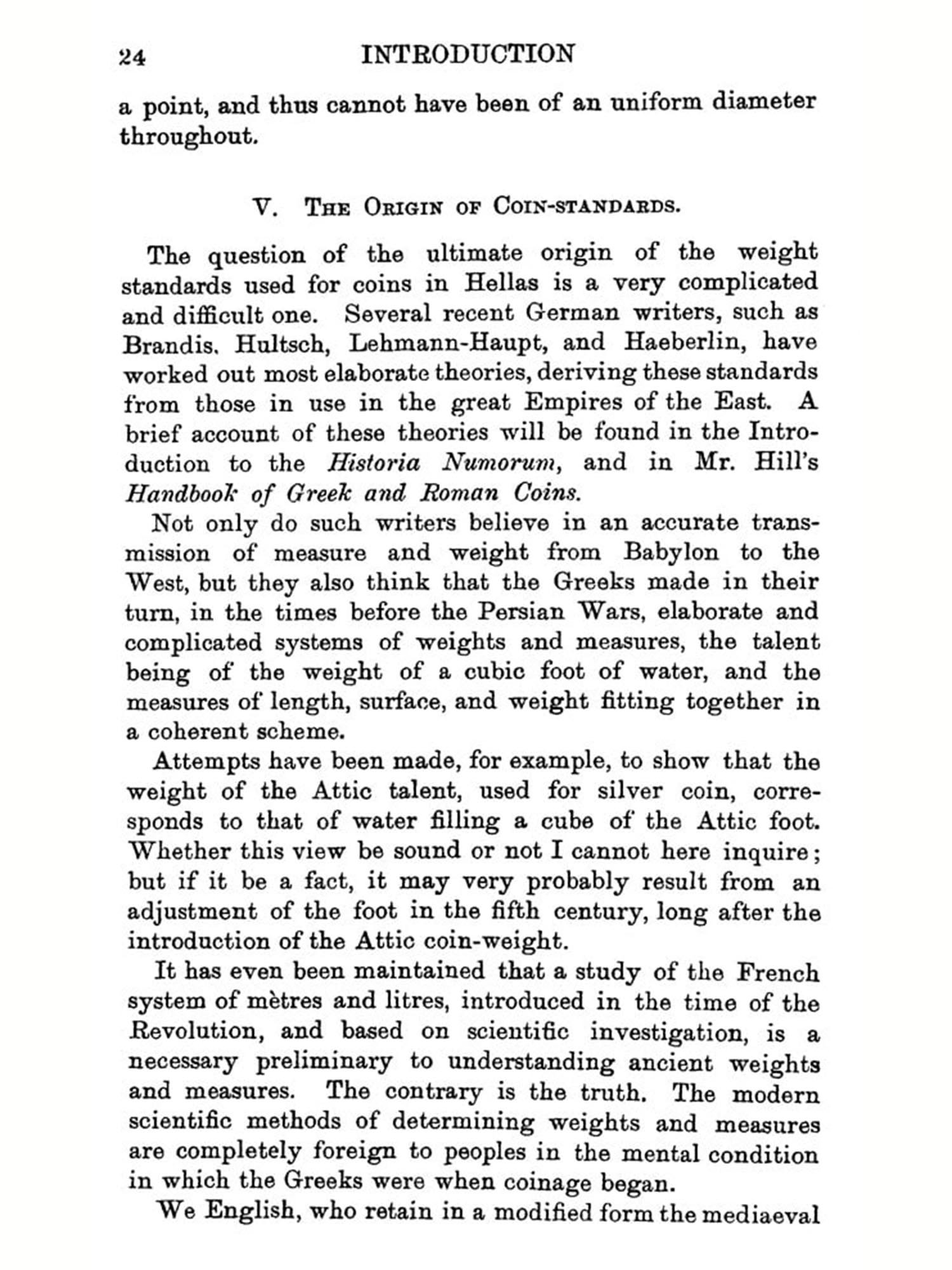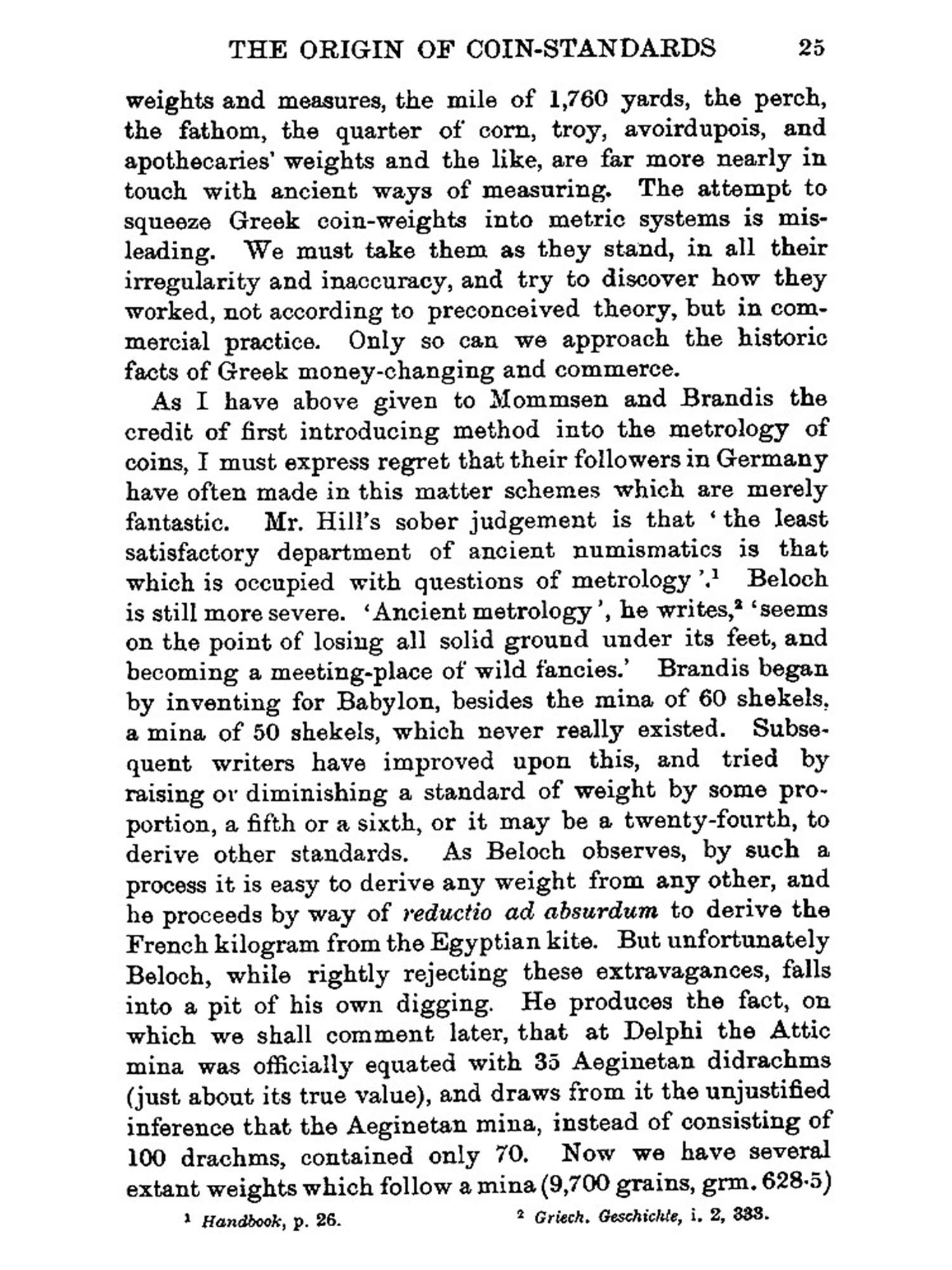 Is the course of the last fifty years the science of Greek coins, ancient numismatics, has undergone great developments. Up to about 1860 the study had been gradually taking shape, and many able scholars and numismatists, such as Sestini, Eckhel, and later Millingen and others, had opened up great fields of study, and showed much penetra-tion and erudition in the discussion of the various classes of coins and their relations to the cities which issued them. Yet these writers had scarcely founded a science of ancient numismatics. Methods had still to be sought out and estab-lished. The pioneers of numismatic method wero Mommsen, in the opening chapters of his Geschichte des römischen Münzwesens (1865), and Brandis, in his Münz-, Muss- und Gewichtswesen in Vorderusien (1866). These writers clearly saw that for the formation of numismatics as a branch of historical science two points were fundamental. First, it was necessary to determine not only the cities which struck each group of coins, but also the date and occasion of each issue. And secondly, as coins were measures of value and a medium of exchange, the one most important fact in regard to them was the quantity of precious metal which each contained; in fact their weight. Eckhel in his great Doctrina Numorum Veterum (1792-8), which is still valuable as a storehouse of learning and a model of good sense, had but a very vague notion of the dates of coins; and their weights had not been seriously considered. The works of Brandis and Mommsen were epoch-making; but they could not carry very far, because the essential point of the dates of issues had not been satisfactorily gone into.