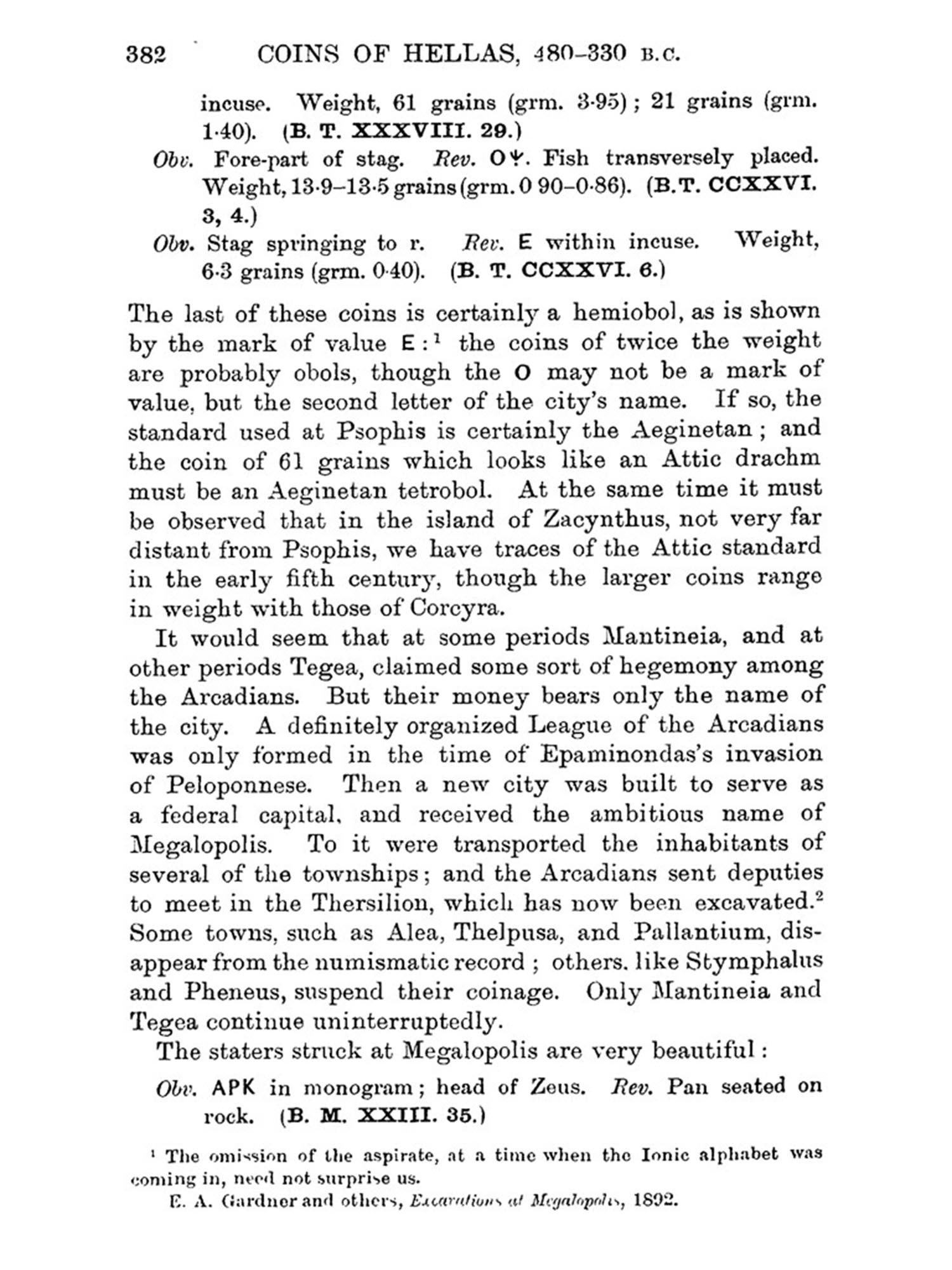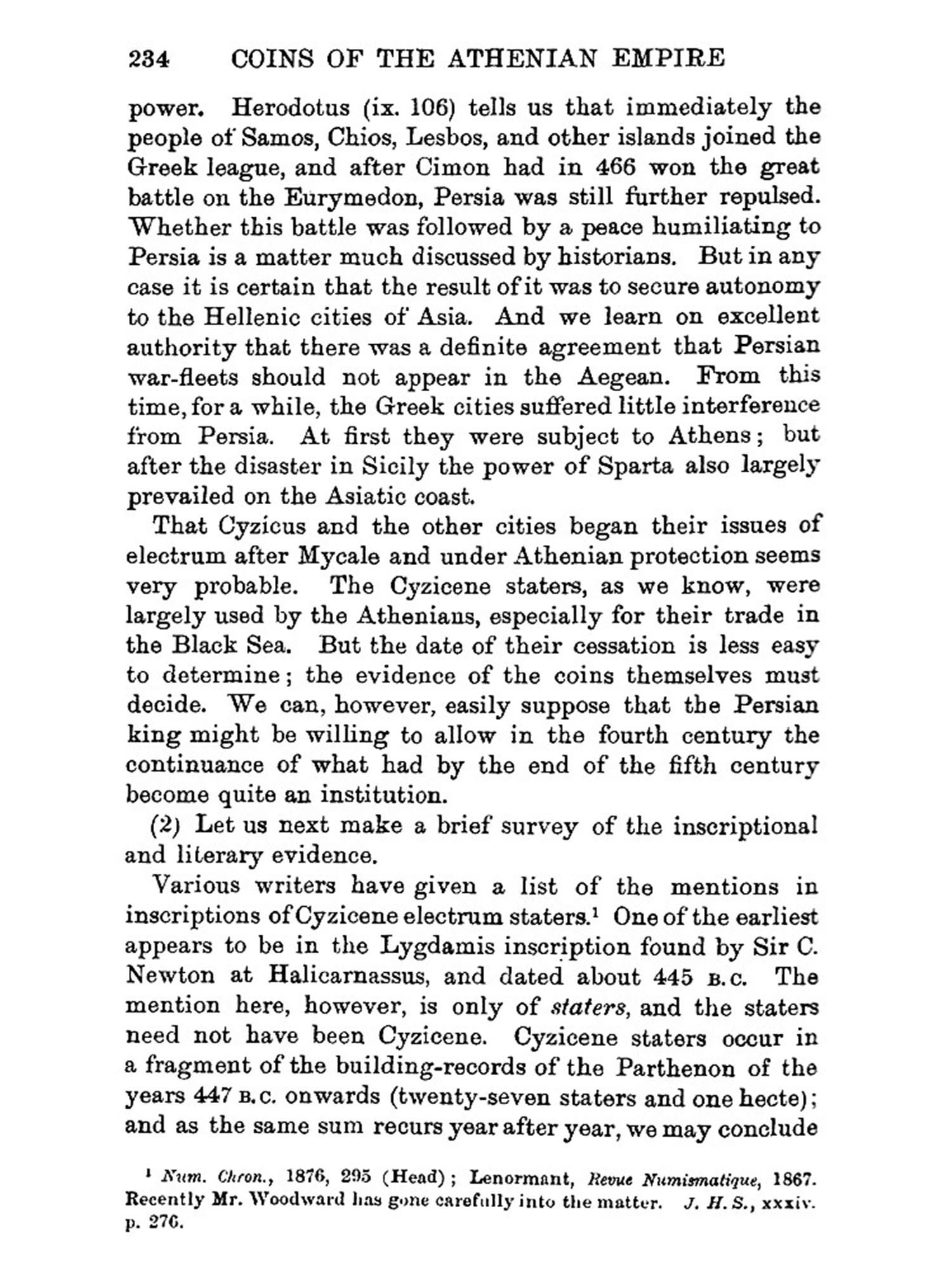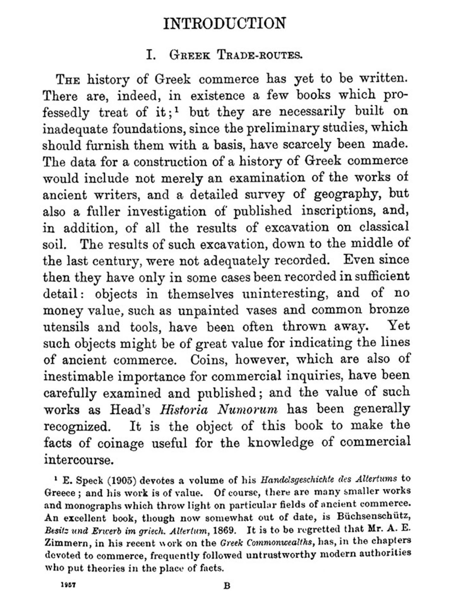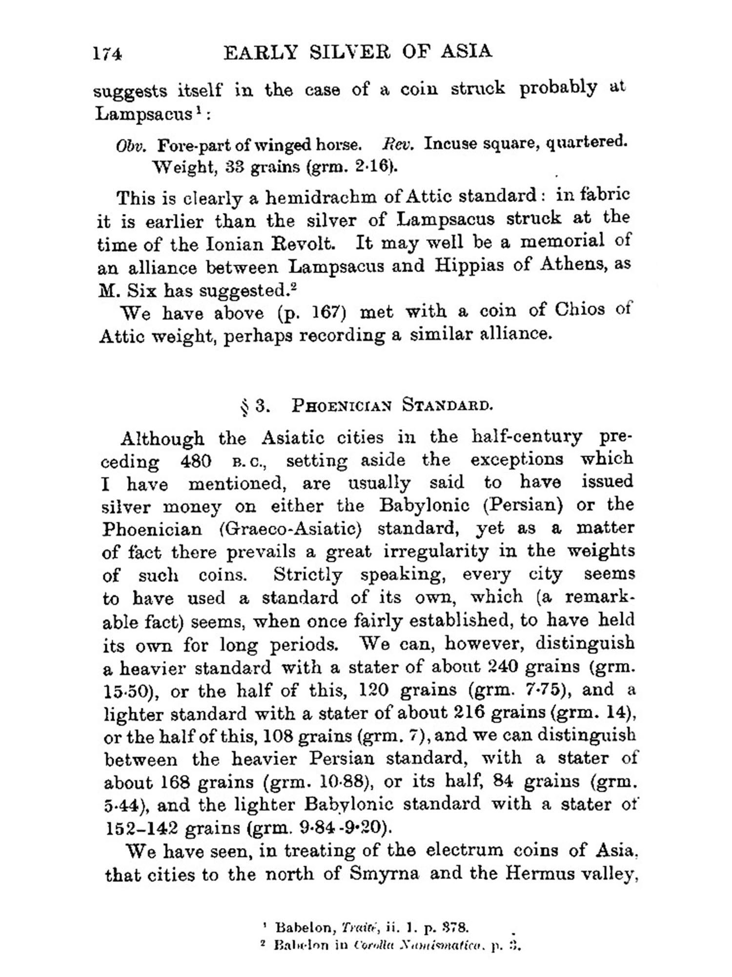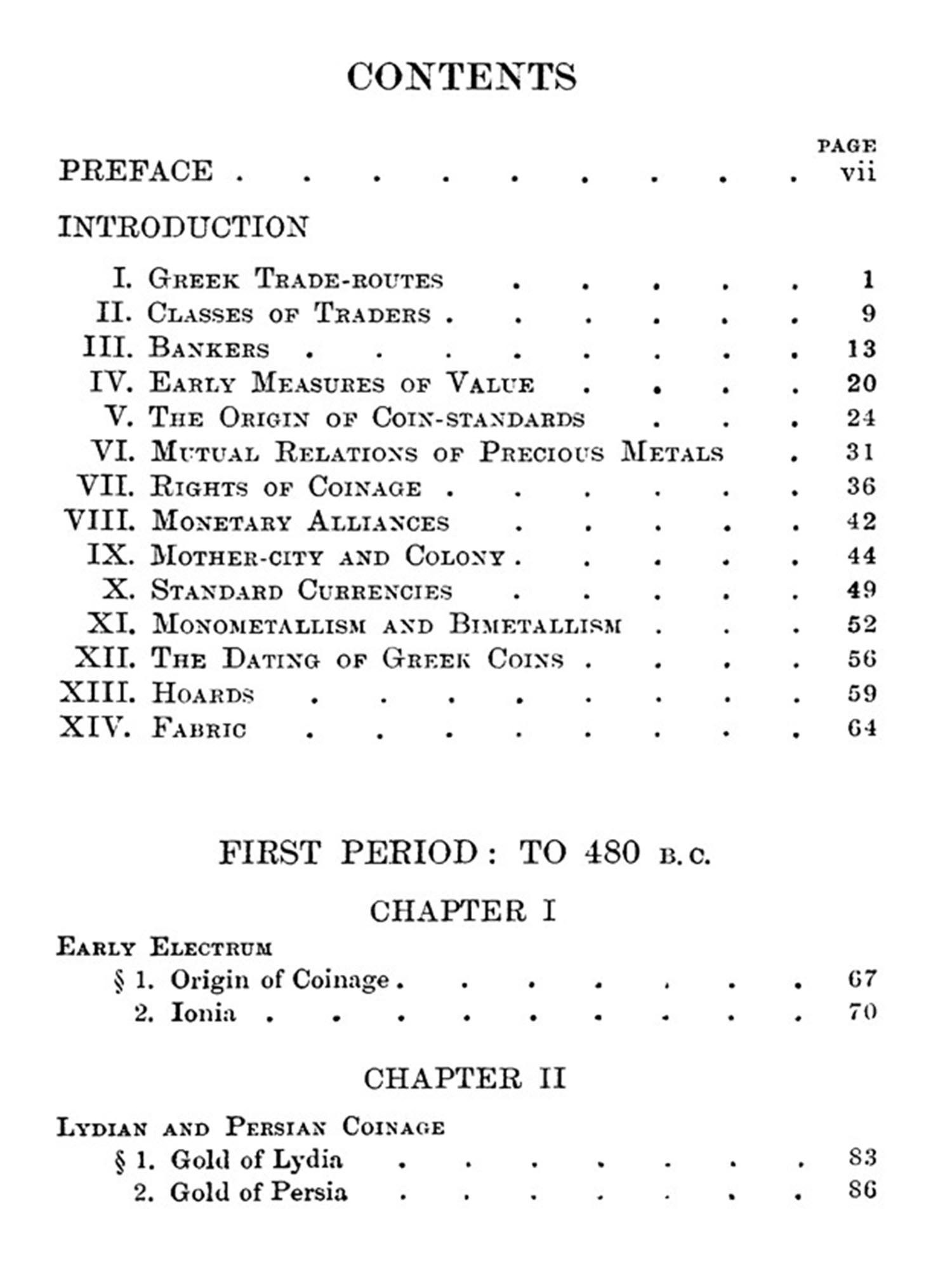 Is the course of the last fifty years the science of Greek coins, ancient numismatics, has undergone great developments. Up to about 1860 the study had been gradually taking shape, and many able scholars and numismatists, such as Sestini, Eckhel, and later Millingen and others, had opened up great fields of study, and showed much penetra-tion and erudition in the discussion of the various classes of coins and their relations to the cities which issued them. Yet these writers had scarcely founded a science of ancient numismatics. Methods had still to be sought out and estab-lished. The pioneers of numismatic method wero Mommsen, in the opening chapters of his Geschichte des römischen Münzwesens (1865), and Brandis, in his Münz-, Muss- und Gewichtswesen in Vorderusien (1866). These writers clearly saw that for the formation of numismatics as a branch of historical science two points were fundamental. First, it was necessary to determine not only the cities which struck each group of coins, but also the date and occasion of each issue. And secondly, as coins were measures of value and a medium of exchange, the one most important fact in regard to them was the quantity of precious metal which each contained; in fact their weight. Eckhel in his great Doctrina Numorum Veterum (1792-8), which is still valuable as a storehouse of learning and a model of good sense, had but a very vague notion of the dates of coins; and their weights had not been seriously considered. The works of Brandis and Mommsen were epoch-making; but they could not carry very far, because the essential point of the dates of issues had not been satisfactorily gone into.