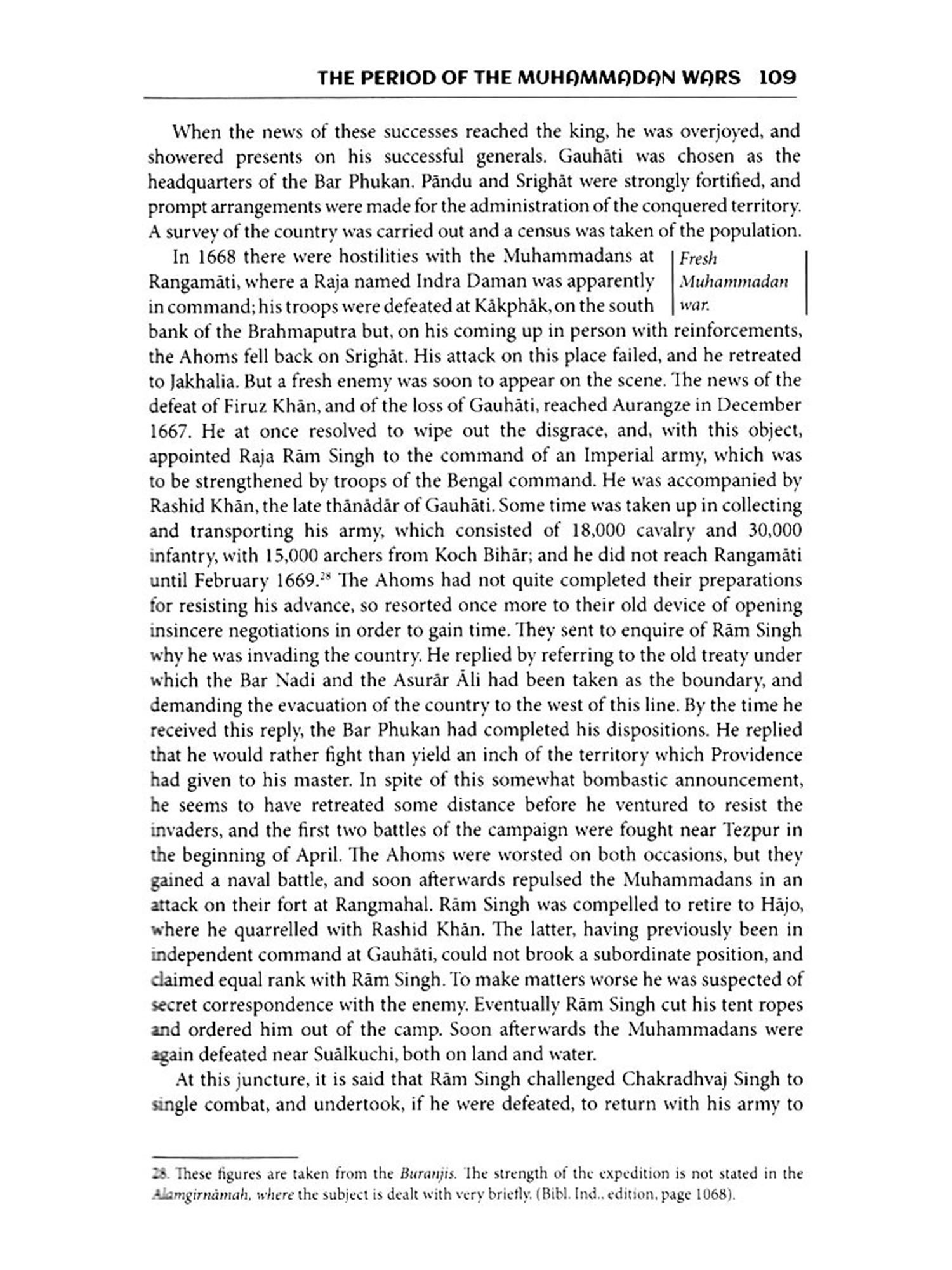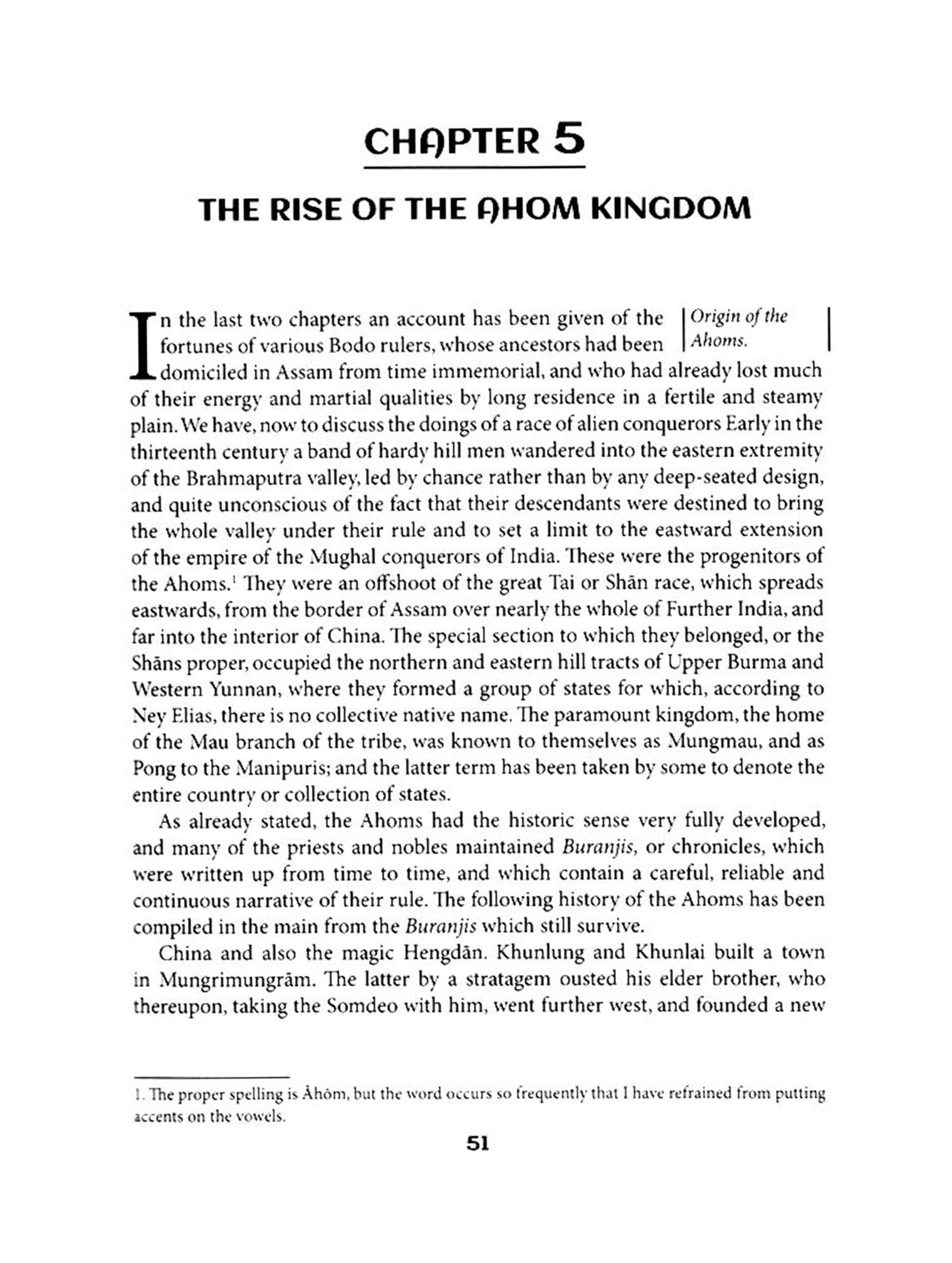 Prior to the advent of the Muhammadans the inhabitants of other parts of India had no idea of history; and our knowledge of them is limited to what can be laboriously pieced together from old inscriptions, the accounts of foreign invaders or travelers, and incidental references in religious writings. On the other hand, the Ahom conquerors of Assam had a keen historical sense, and they have given us a full and detailed account of their rule, which dates from the early part of the thirteenth century.