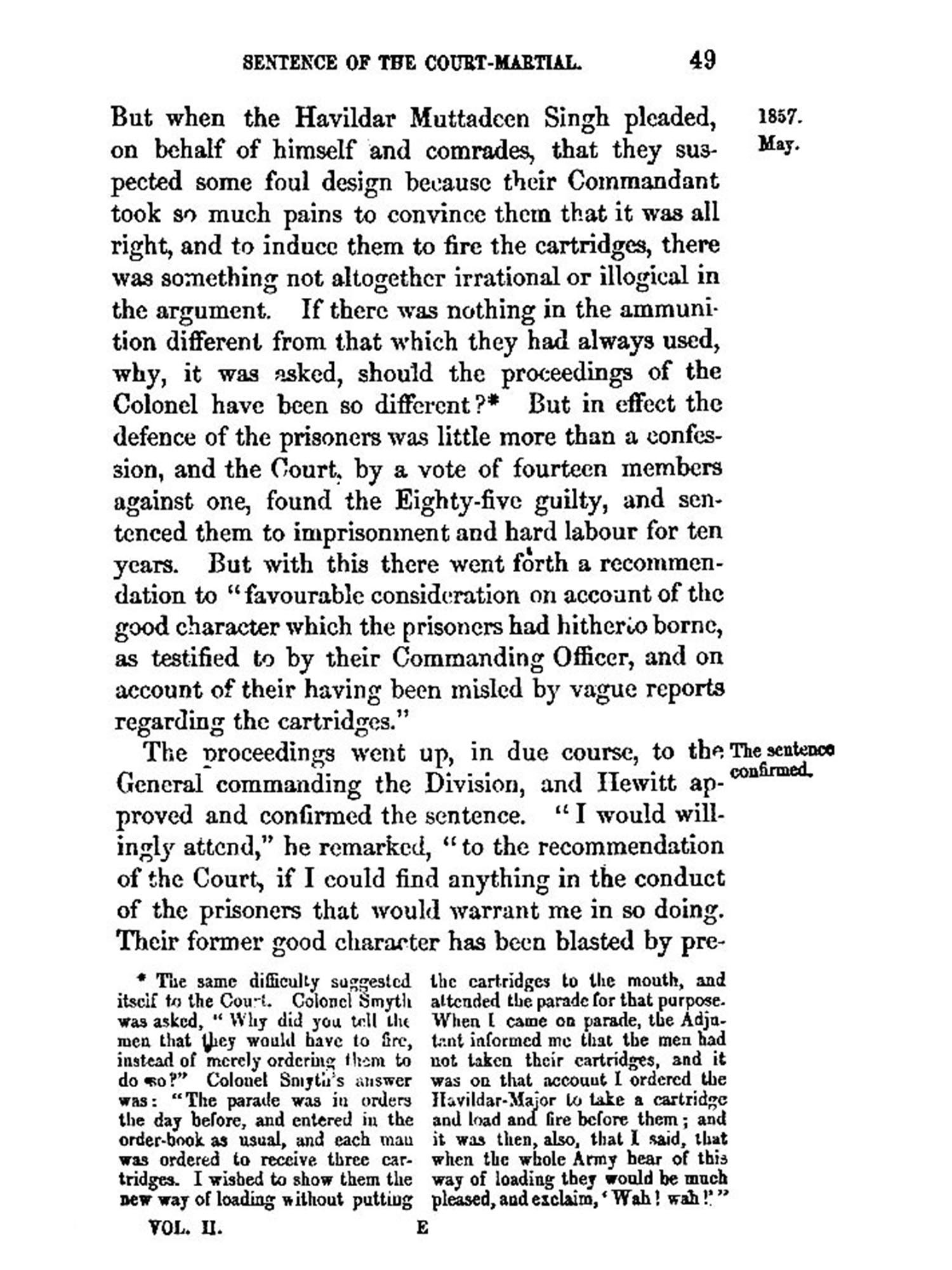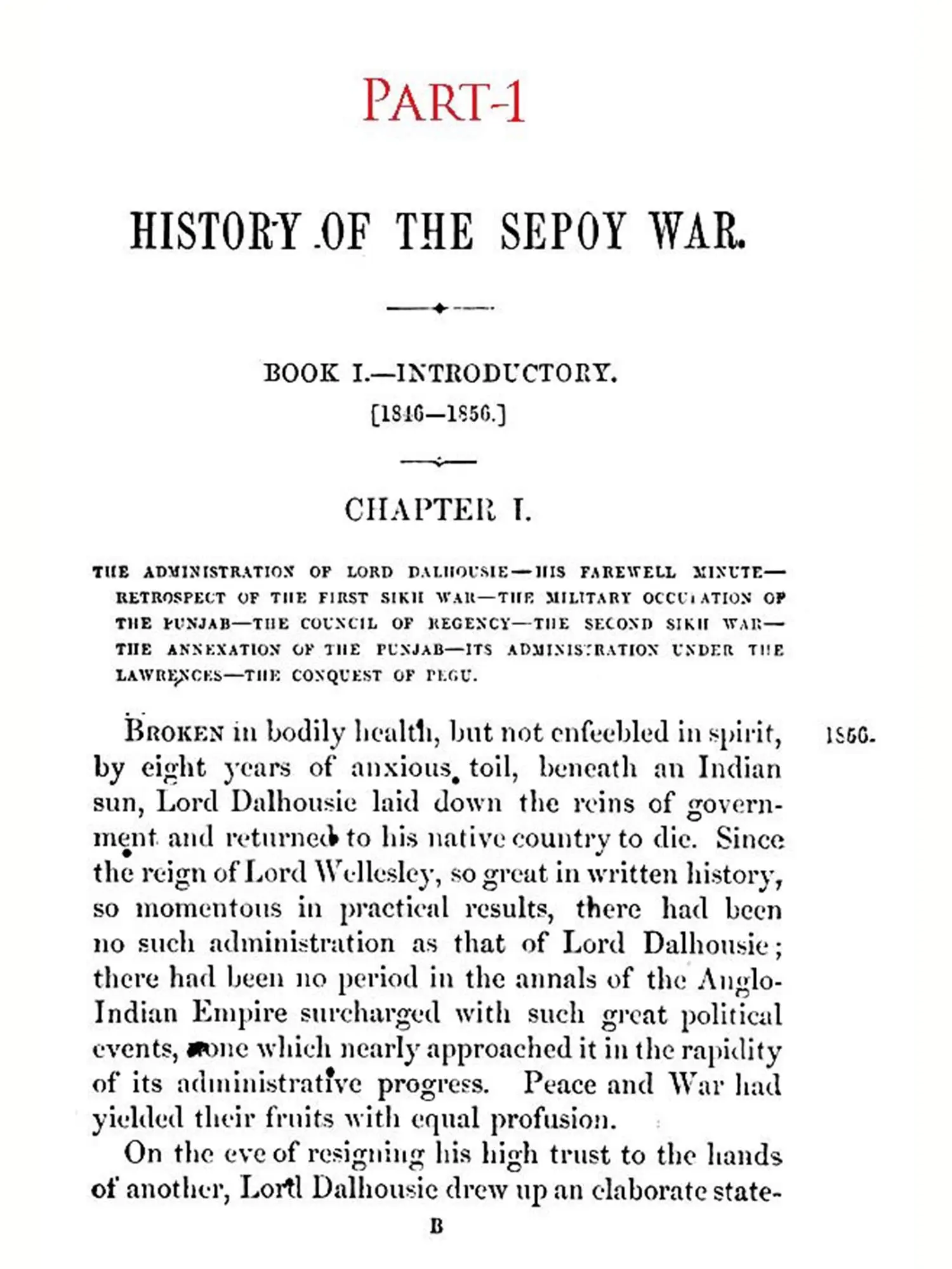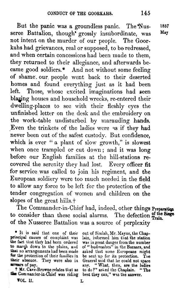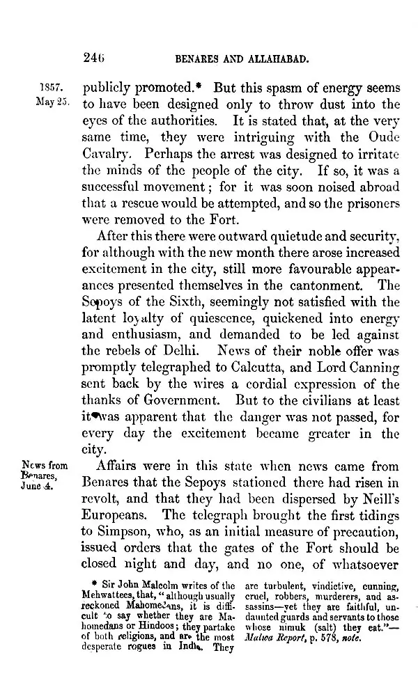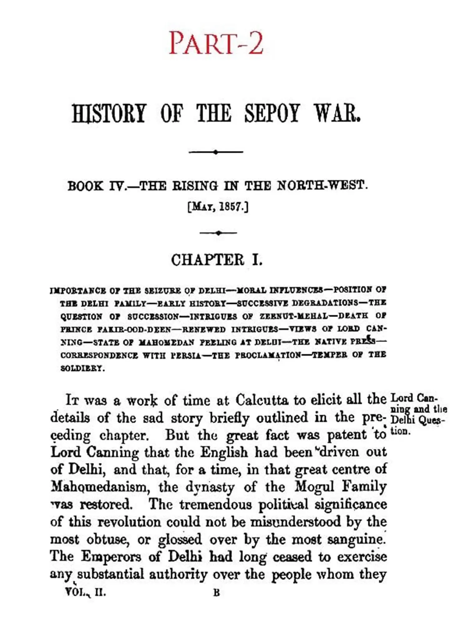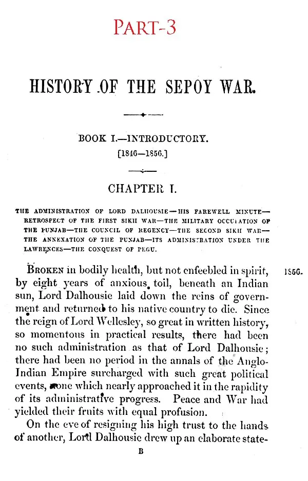 IT was not without much hesitation that I under-took to write this narrative of the events, which have imparted so painful a celebrity to the years 1857-58, and left behind them such terrible remembrances. Publicly and privately I had been frequently urged to do so, before I could consent to take upon myself a responsibility, which could not sit lightly on any one capable of appreciating the magnitude of the events themselves and of the many grave questions which they suggested. If, indeed, it had not been that, in course of time, I found, either actually in my hands or within my reach, materials of history such as it was at least improbable that any other writer could obtain, I should not have ventured upon so difficult a task. But having many important collections of papers in my possession, and having received promises of further assistance from surviving actors in the scenes to be described, I felt that, though many might write a better history of the Sepoy War, no one could write a more truthful one.
