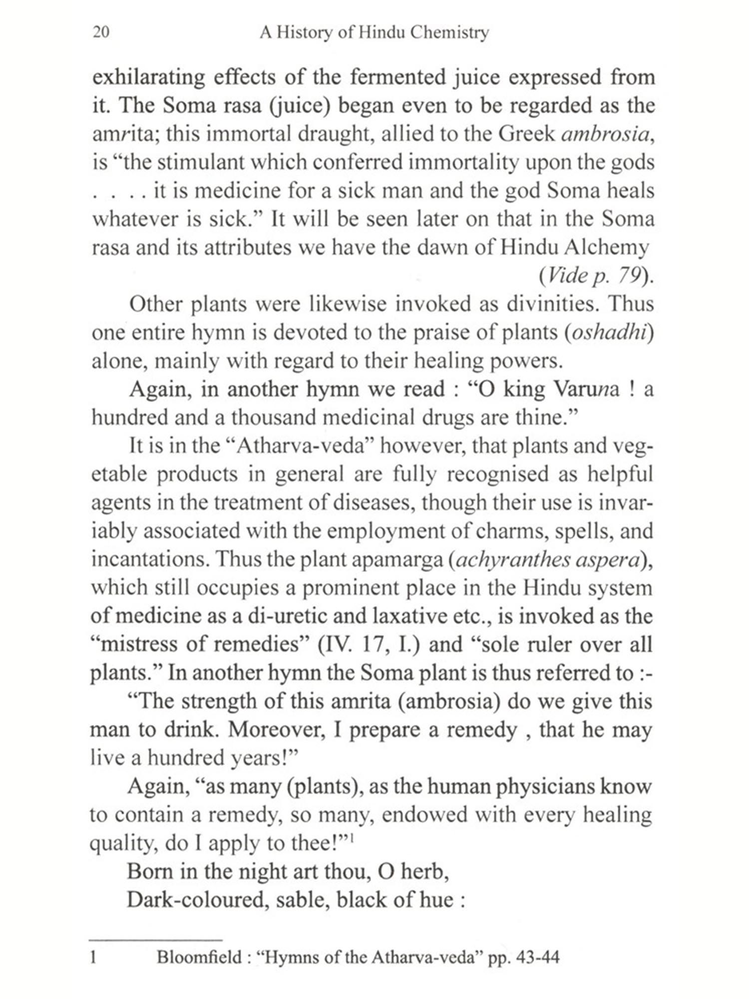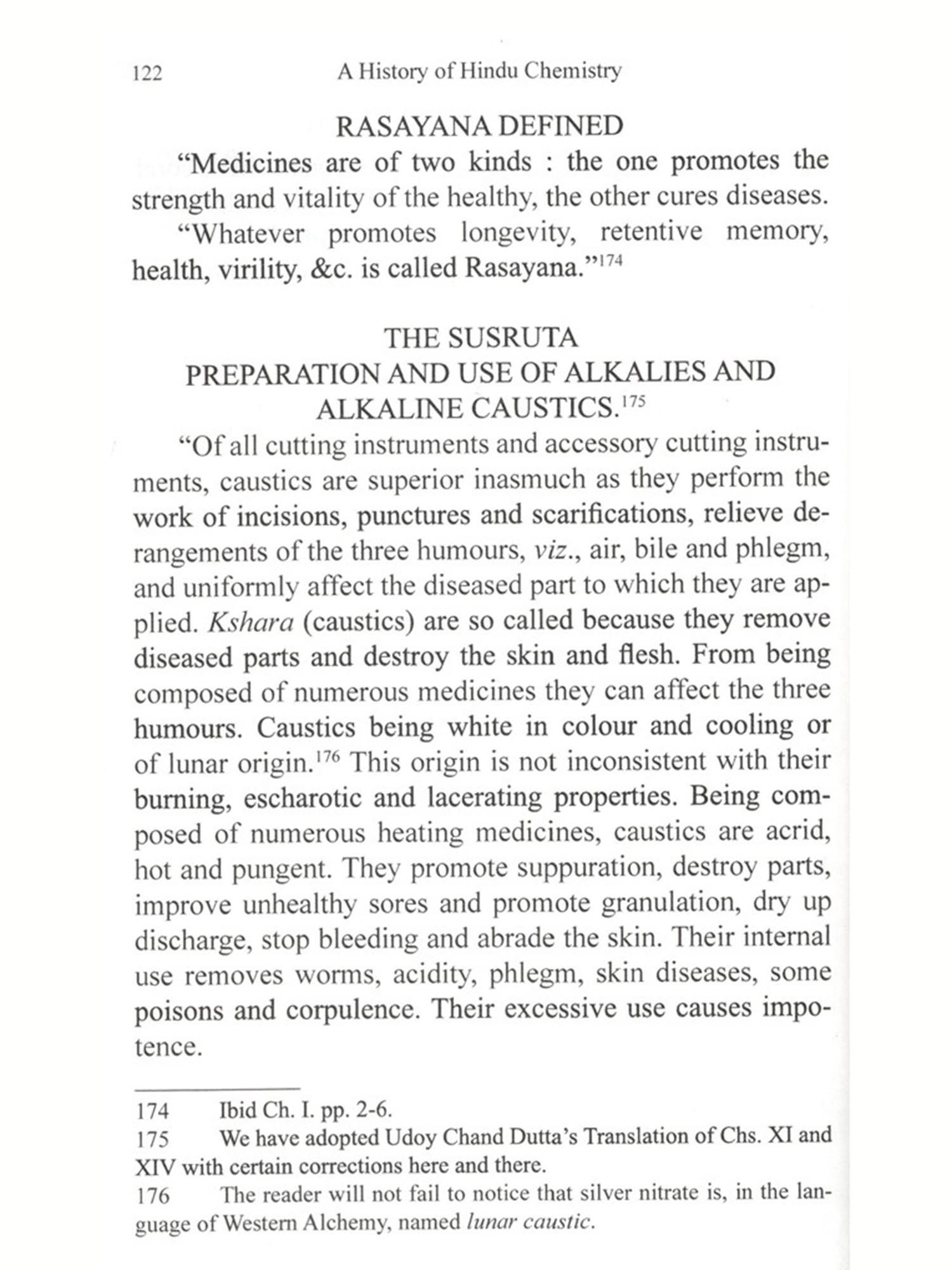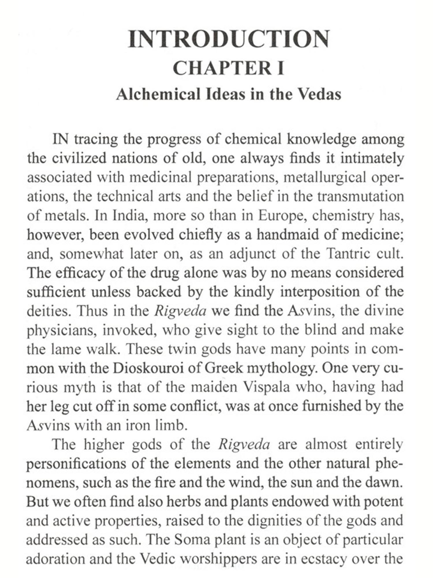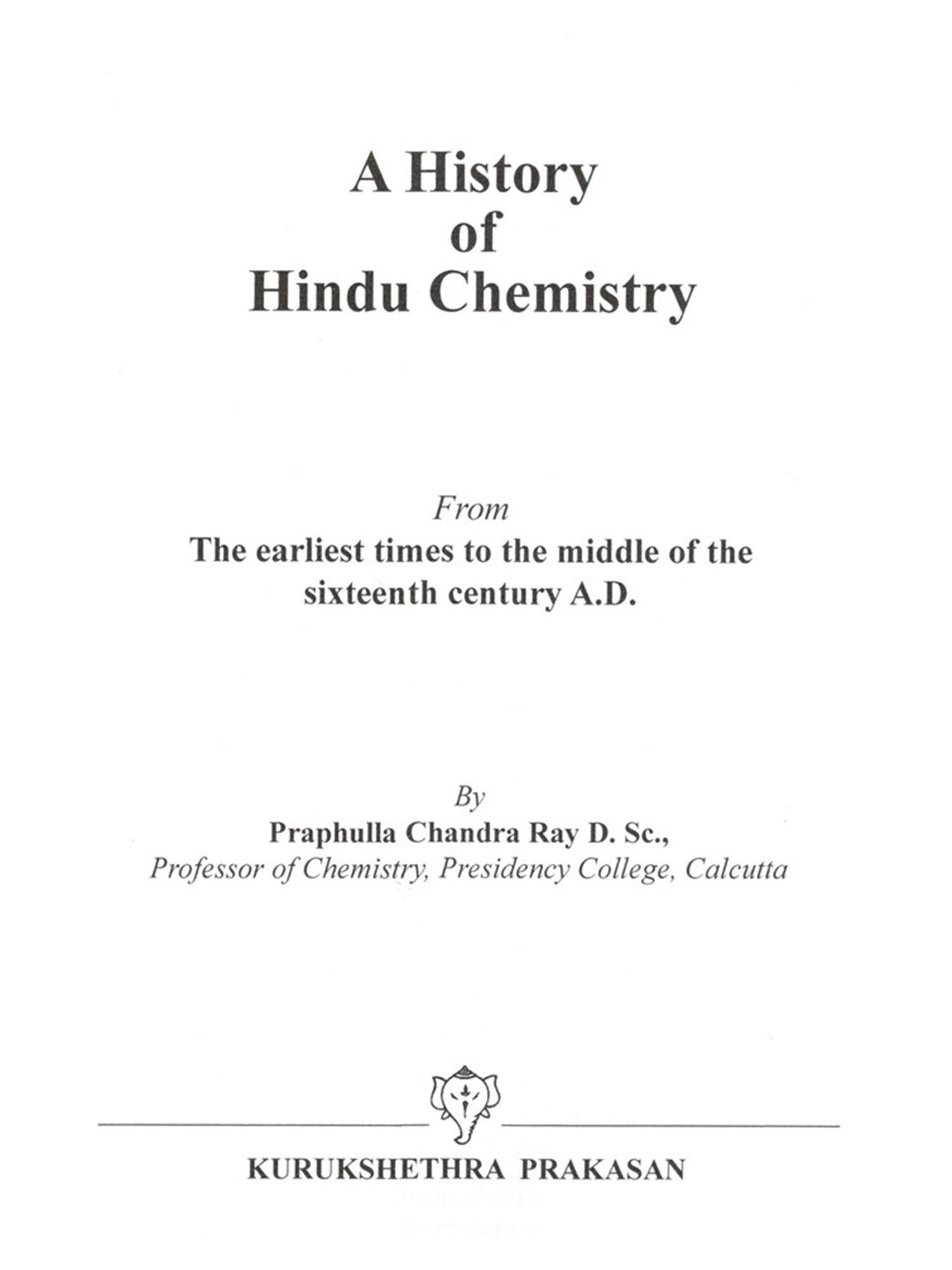 Since the days of Sir W. Jones, Sanskrit literature, in almost every department, has been zealously ransacked by Scholars, both European and Indian. As the results of their labours we are now in possession of ample facts and data, which enable us to form some idea of the knowledge of the Hindus of old in the fields of Philosophy and Mathematics including Astronomy, Arithmetic, Algebra, Trigonometry and Geometry. Even Medicine has received some share of attention. Wilson in a series of essays published in the Oriental Magazine (1823). Royle in his Antiquity of Hindu Medicine (1837), and Wise in his commentary on the Hindu System of Medicine (1845), were amongst the first to bring to the notice of the European world the contents of the ancient medical works of the Hindus, and recently the Thakur Sahib of Gondal has added his quota. These contributions are, however, of a fragmentary nature. A comprehensive history of Hindu medicine has yet to be written. Materia Medica has also found, in Udoy Chand Dutt, an able exponent. One branch has, however, up till this time, remained entirely neglected- namely, Chemistry. Indeed, it may be assumed that on account of its complex and technical nature it has hitherto repelled investigators.
