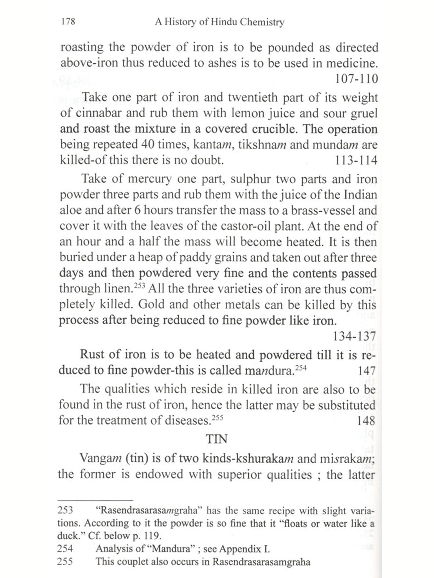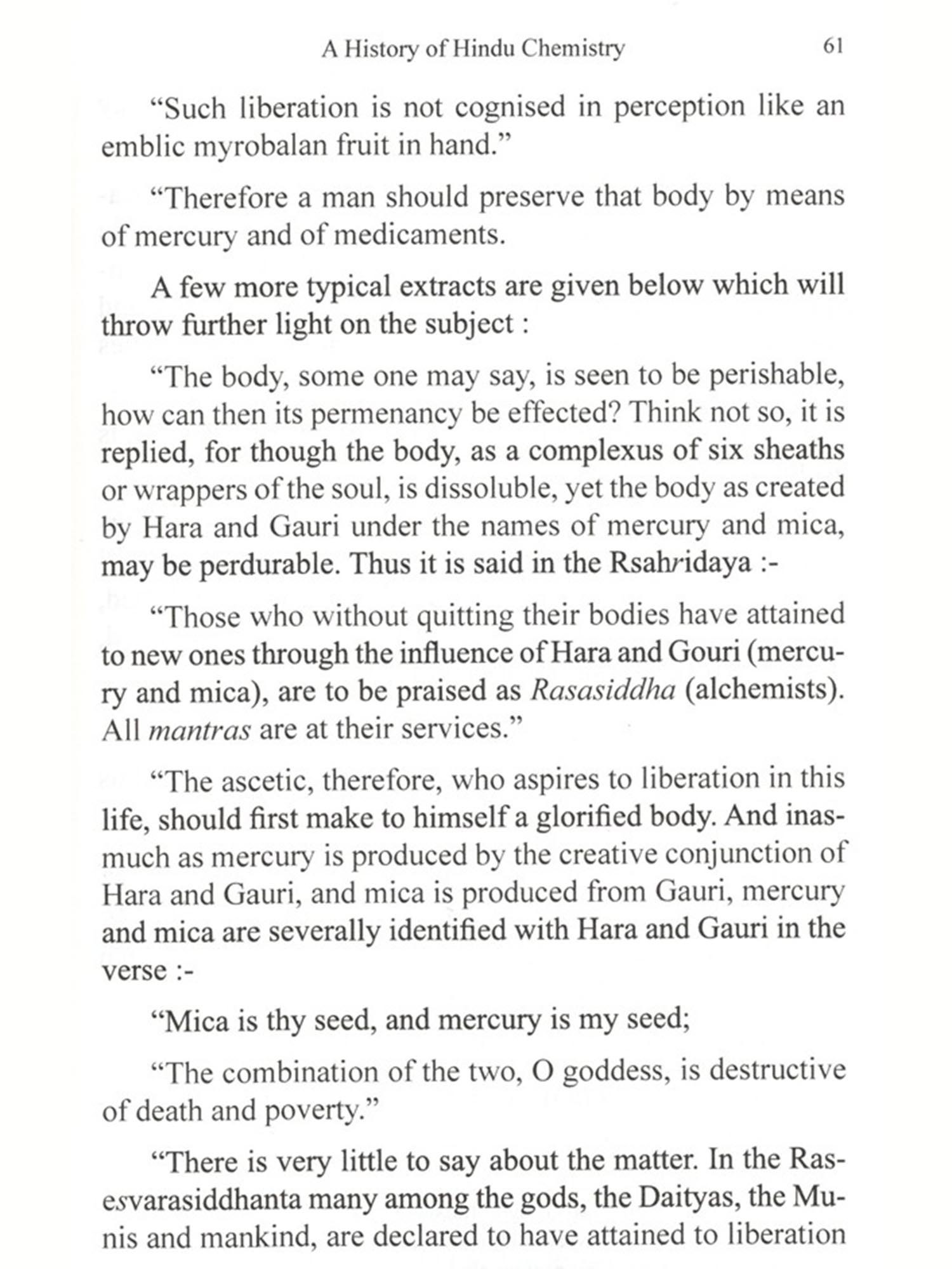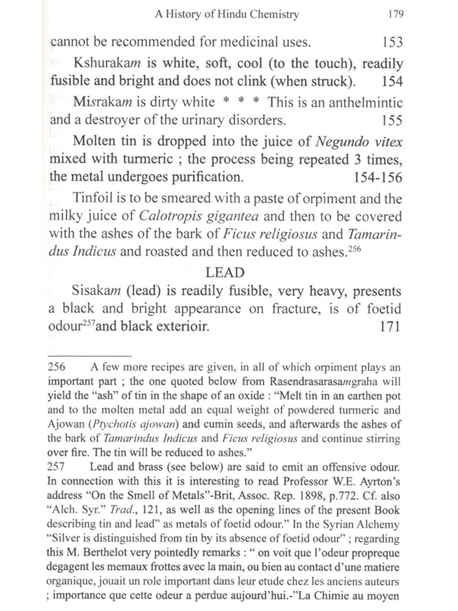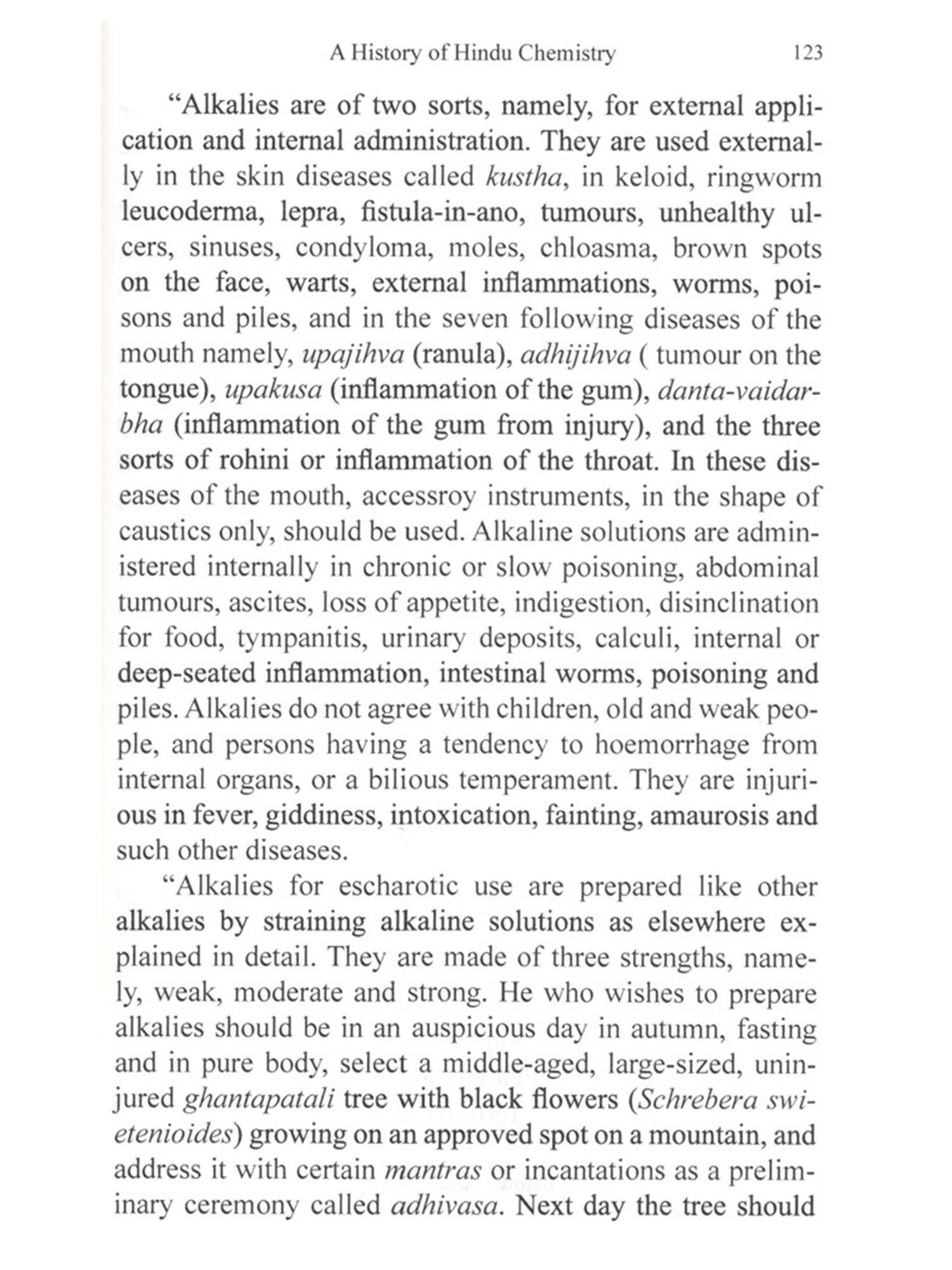 Since the days of Sir W. Jones, Sanskrit literature, in almost every department, has been zealously ransacked by Scholars, both European and Indian. As the results of their labours we are now in possession of ample facts and data, which enable us to form some idea of the knowledge of the Hindus of old in the fields of Philosophy and Mathematics including Astronomy, Arithmetic, Algebra, Trigonometry and Geometry. Even Medicine has received some share of attention. Wilson in a series of essays published in the Oriental Magazine (1823). Royle in his Antiquity of Hindu Medicine (1837), and Wise in his commentary on the Hindu System of Medicine (1845), were amongst the first to bring to the notice of the European world the contents of the ancient medical works of the Hindus, and recently the Thakur Sahib of Gondal has added his quota. These contributions are, however, of a fragmentary nature. A comprehensive history of Hindu medicine has yet to be written. Materia Medica has also found, in Udoy Chand Dutt, an able exponent. One branch has, however, up till this time, remained entirely neglected- namely, Chemistry. Indeed, it may be assumed that on account of its complex and technical nature it has hitherto repelled investigators.