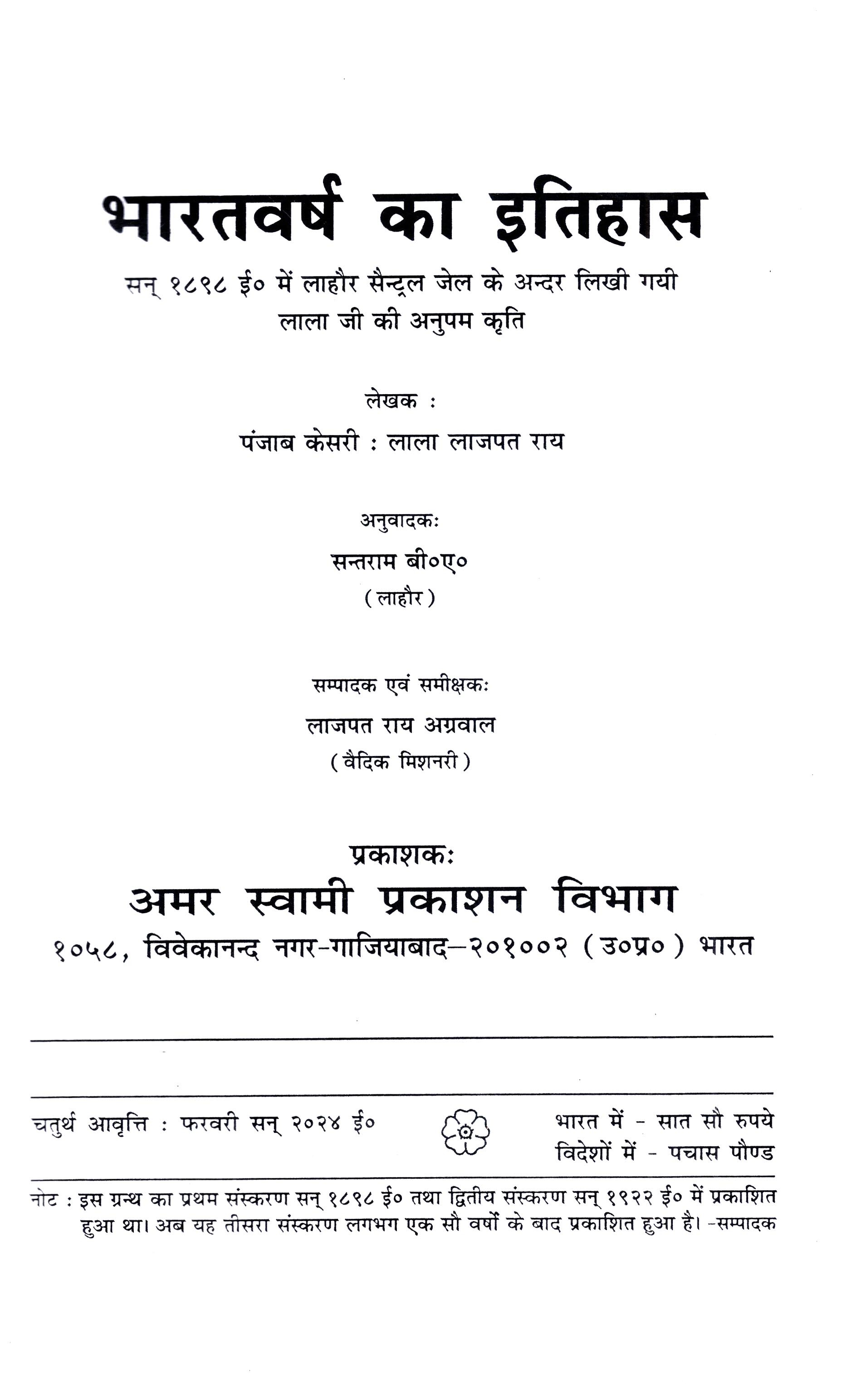 भारतवर्ष का इतिहास: History of India (Lalaji's Unique Work, Written in 1898 Inside Lahore Central Jail)