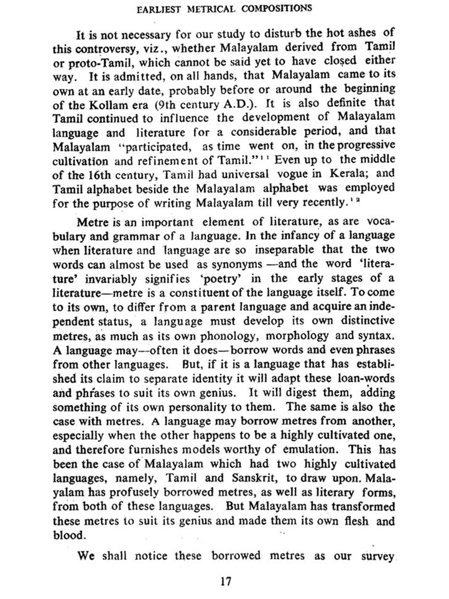 This book embodies mainly the results of the work done by me as a Senior Fellow of the Dravidian Linguistics Association at the University of Madurai during the period of one year from the Ist May, 1975. The problem which I was required to investigate was the Commonness in the Metre of the Dravidian Languages with particular reference to Malayalam. Another Senior Fellow of the Association, Dr. S. Subrahmaniam of the S. T. Hindu College, Nagercoil, bad already been engaged there in the study of the same problem with special reference to Tamil.