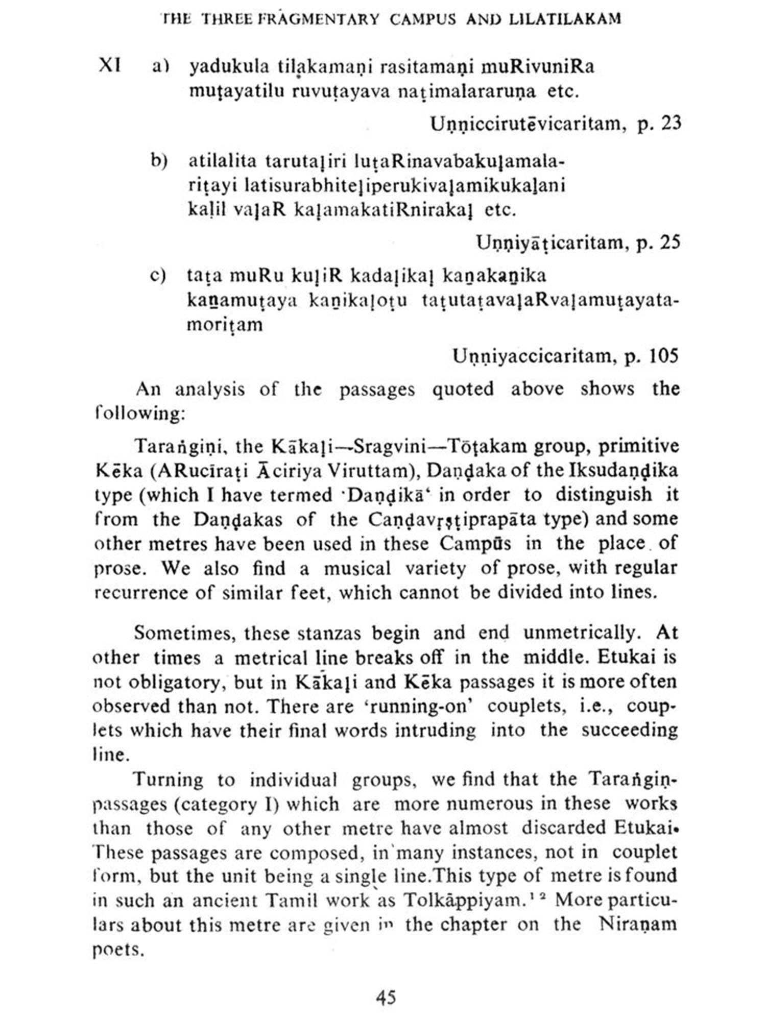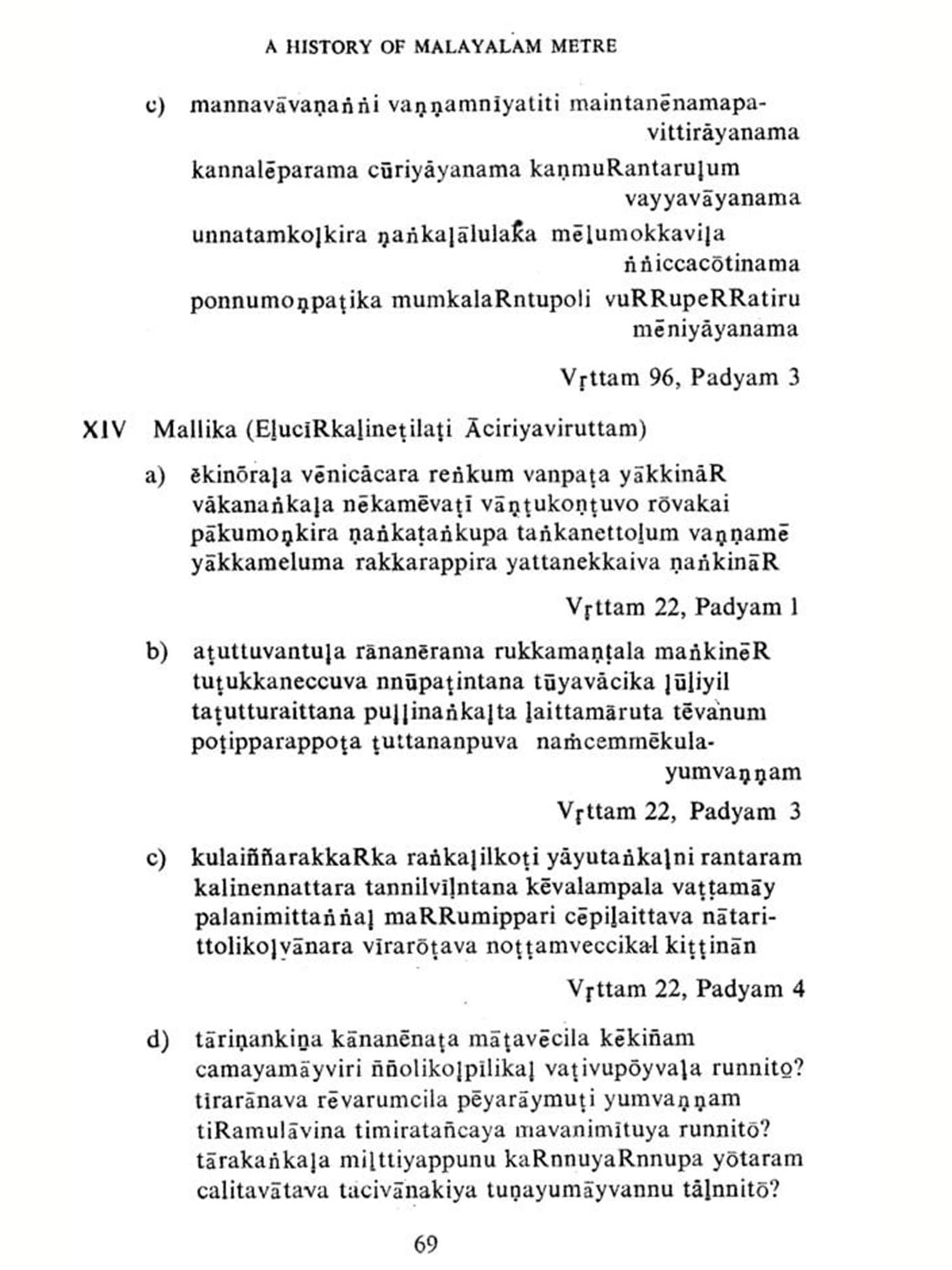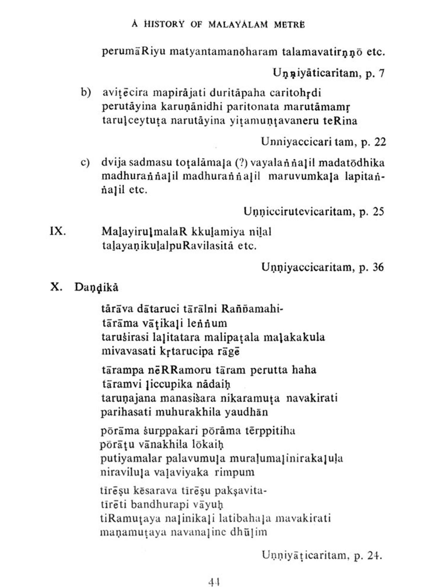 Though this study has only confirmed the main conclusions reached by me three decades ago, I have extensively revised and practically rewritten my earlier thesis, incorporating a lot of new material including one chapter on the metre of Ramakathappattu, a work which became available in print only in the year 1970. My approach in this study has been historical and comparative. In each chapter I have selected material in verse belonging to a particular era or a particular genre, discussed the date of the composition of such material and then gone into a detailed analysis of the metres employed therein. I have quoted in each chapter passages from the literary material thus studied, to illustrate the different metres and have adduced, wherever available, passages of comparable metres from other Dravidian languages, mainly from Tamil. In the survey of a period or genre which covers a wide range of works, it has been possible to take into consideration only those works that are the most representative of that period or genre. I have examined, for instance, only the works of Eluttacchan to shed light on the metres of the genre Kilippattu.