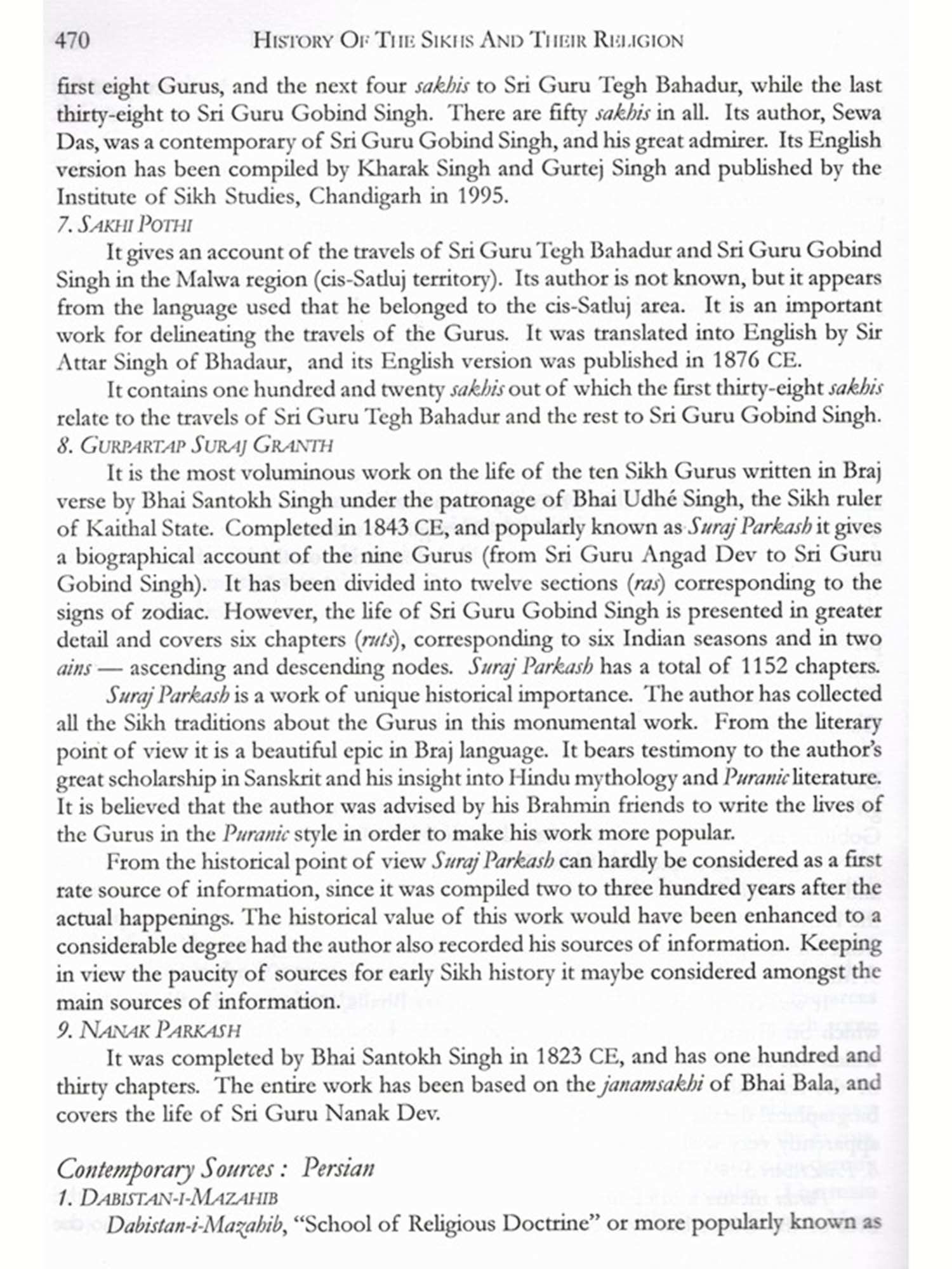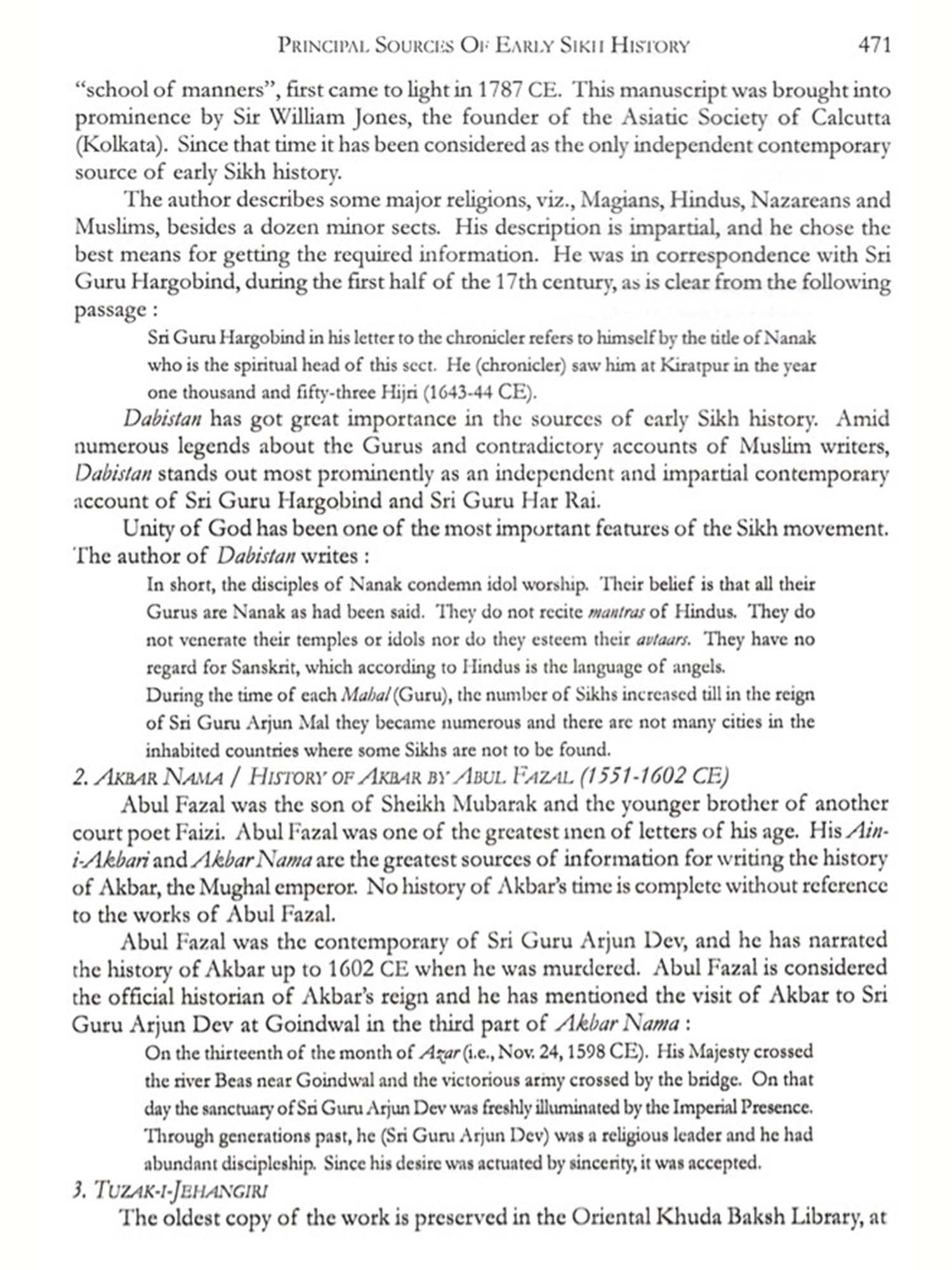 Another great difficulty in the study of this period is the paucity of contemporary source material. Perhaps the only independent work which is contemporary is the Dabistan discovered by Sir William Jones, the founder of Asiatic Society, Calcutta. Besides this, we get stray references in the contemporary Persian sources like Akbar Nama, Tuzaki Jebangiri, Abkami-Alamgiri, etc. Similarly, some contemporary references area available in Gurmukhi-Punjabi literature. Sri Guru Granth Sahib provides significant information relating to Babar's invasion, and socio-religious life of the people. Similarly, Varun of Bhai Gurdas, a Gurmukhi source, refers to some important events of the Gurus' lives. For life history of the ninth and tenth Guru we have to depend on Bachittar Natak and Sainapat's Gursobba which are contemporary works. Mostly, we have to depend on the tradition for reconstructing lives of the Gurus. Perhaps no religious prophet has left any written record of his life. The major sources of information are the legends preserved in the hearts of the people on which lives of the prophets are constructed. It will not, therefore, be out of place to emphasize the historical significance of tradition as source of history.