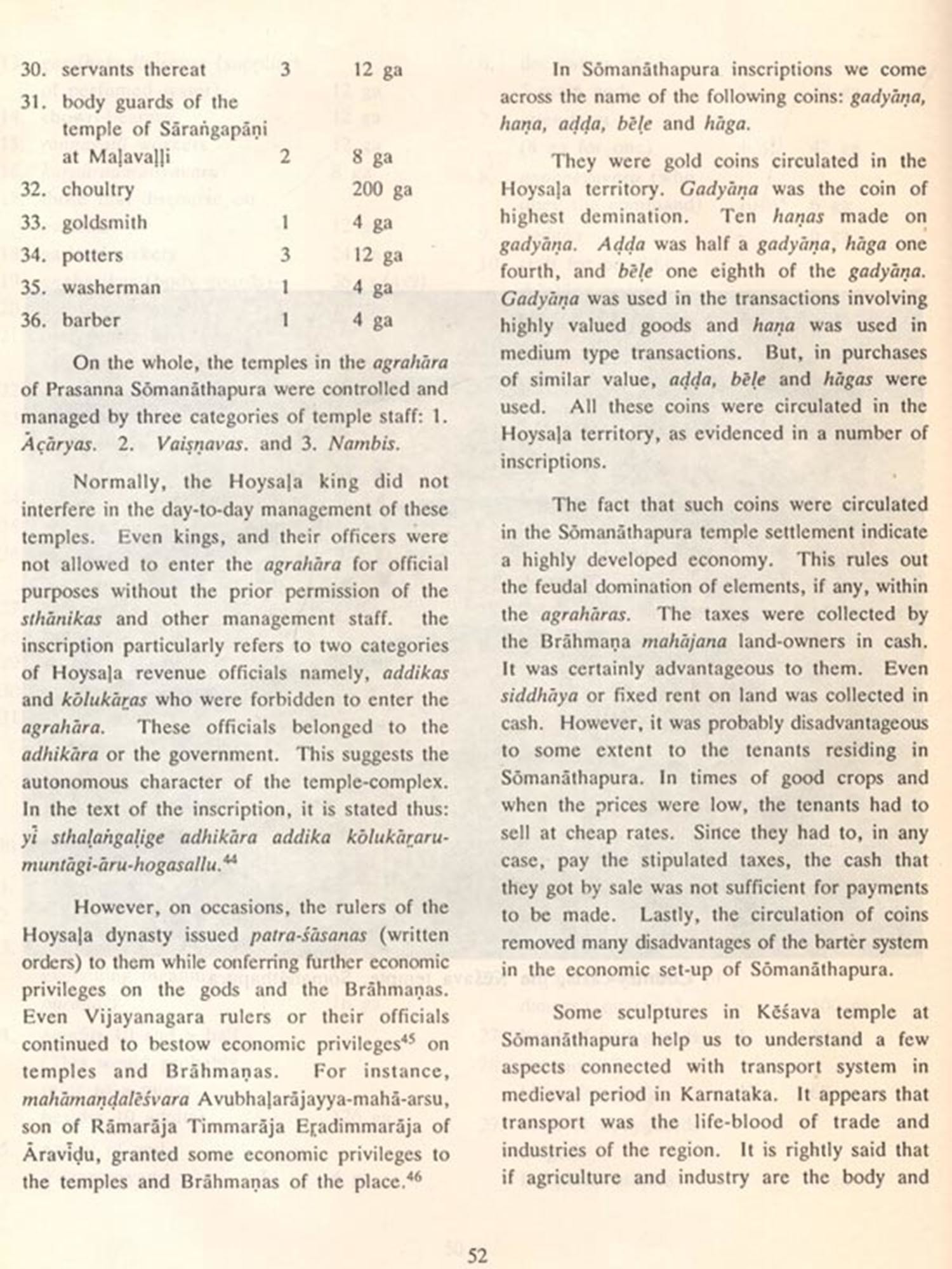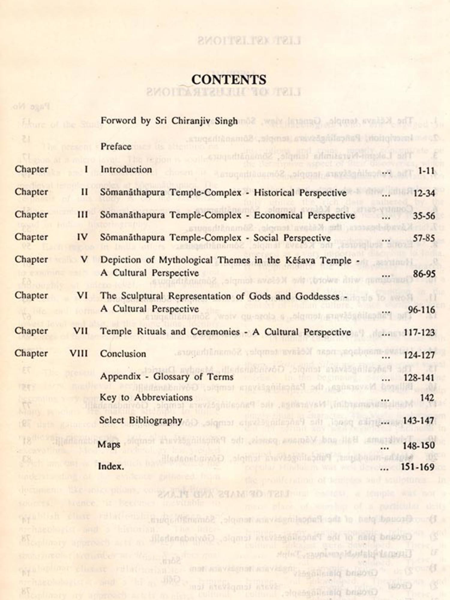 The present work is a revised version of my thesis entitled History of the Somanathapura Temple-Complex, in Socio-Economic and Cultural Perspectives for the Ph.D. Degree in History of the University of Mysore. Right from 1917 when R.Narasimhachar published a monograph on the Kēšava temple at Sömanāthapura, several scholars have subjected this temple for greater scrutiny and from different angles. Mine is a non-conventional approach to the study of the Temple-Complex of the place, not necessarily the Kešava temple. Besides a historical perspective, it examines the development of agrarian economy leading to the rise of small-scale industries and the consequent socialisation which led to liberalisation of caste rigidity. The existence of Saiva and Srivaisņava temples side by side and the icons of both sections reflected on the walls and friezes point to religious integration. Through the sculptural, architectural, epigraphical, mythological and literary data, it has been possible to underline the peaceful coexistence, religious harmony and the basic cultural unity of Hinduism in the 13th century Karnataka.