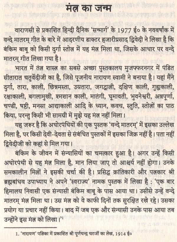 सन् 1914 के दिनों एक बार कलकत्ता से बंकिम बाबू की जन्मभूमि कांटालपाड़ा तक लोग पदयाला करते हुए उनके प्रति श्रद्धा प्रकट करने के उद्देश्य से गए थे। इन लोगों में अनेक बुद्धिजीवी थे। बंकिम बाबू के अनन्य मित्र श्री दीनबंधु मित्न के पुत्न श्री ललितकुमार मित्र भी गए हुए थे। वहां जाकर श्री मित्रन ने 'बंग दर्शन पत्निका' के प्रेस-व्यवस्थापक श्री रामचन्द्र बनर्जी से भेंट कर यह पूछा कि वन्दे मातरम् गीत कब लिखा गया था। उन्होंने जो कुछ कहा, उस बयान को श्री मिल ने श्री चित्तरंजन दास द्वारा संपादित 'नारायण' पत्रिका में प्रकाशित कराया। इस लेख के प्रकाशन के बाद बंकिम बाबू के छोटे भाई ने भी उसीसे संबंधित लेख छपवाया। वन्दे मातरम् और बंकिम बाबू से संबंधित कई लेखों का संकलन करके 'साहित्य' पत्रिका के संपादक तथा वन्दे मातरम् सम्प्रदाय के मंत्री श्री सुरेश समाजपति ने छपवाया। स्वतंत्र रूप से किसीने पुस्तक नहीं लिखा था। ऐसी हालत में उन लेखकों की पुस्तकें कहां मिलतीं?