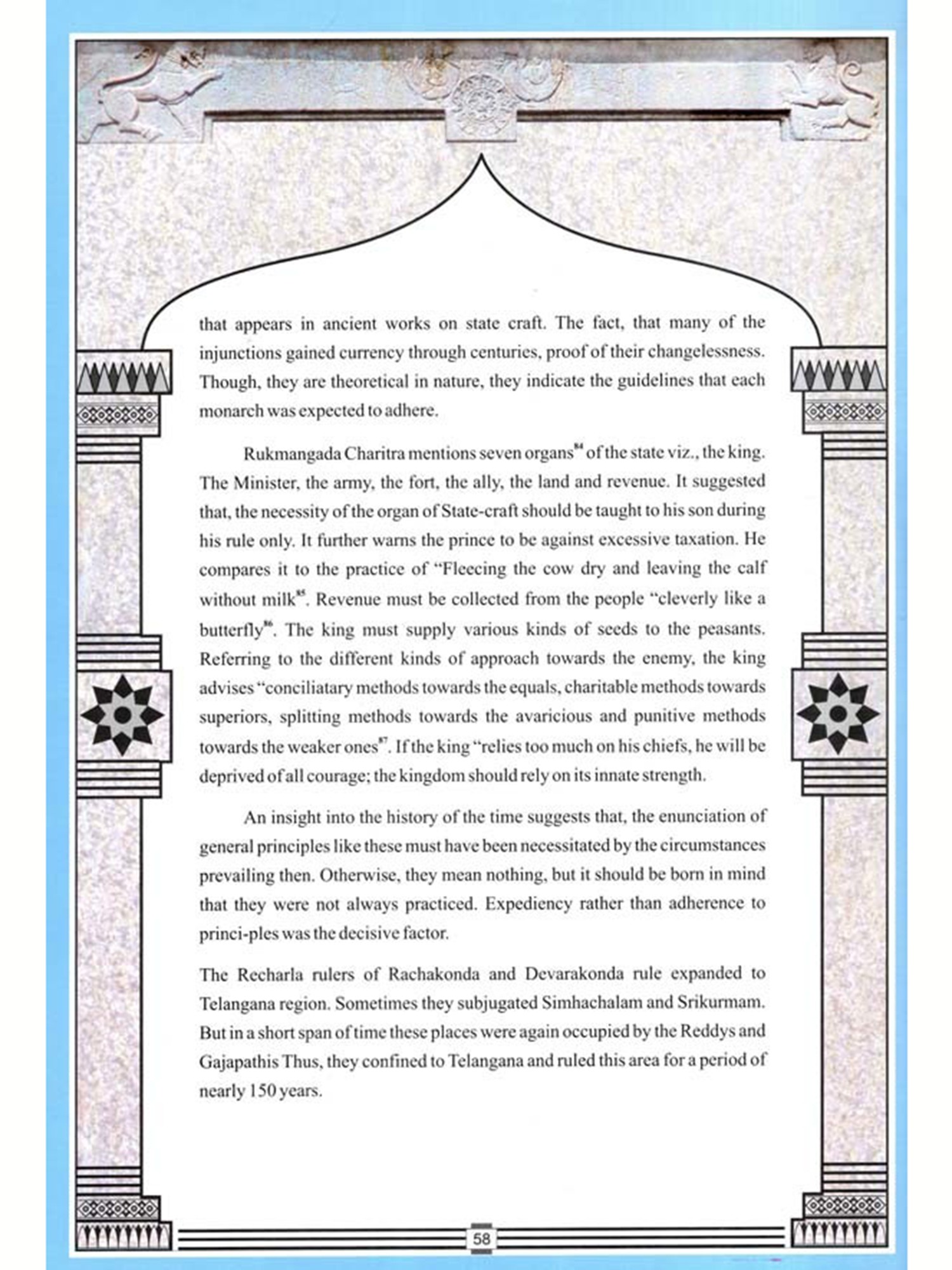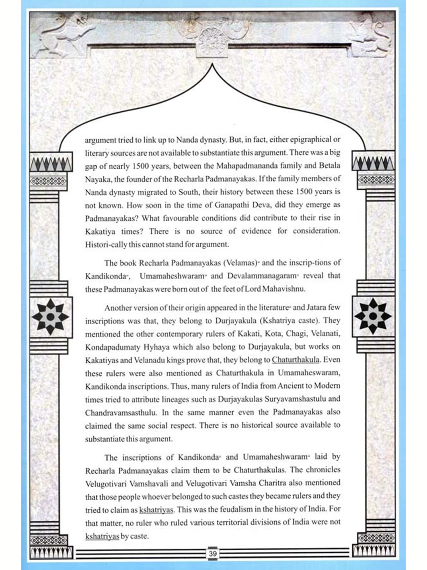 As scholars and commoners know it were Kakatiyas that brought all the Telugu people of Telangana and Andhra Pradesh under one umbrella for over one and half century. Thereafter the Telugu regions fell into chaos -politically and hence socially. Then came the dynasty called Recharla Padmanayakas who were subsequently called Velamas in Telangana. They not only protected Telangana people from the political dangers caused by Delhi Sultans and Bahamanis of Gulbarga but also strived their best for the socio-economic development of Telangana for over a century during the post Kakatiyan 14th and 15th centuries.