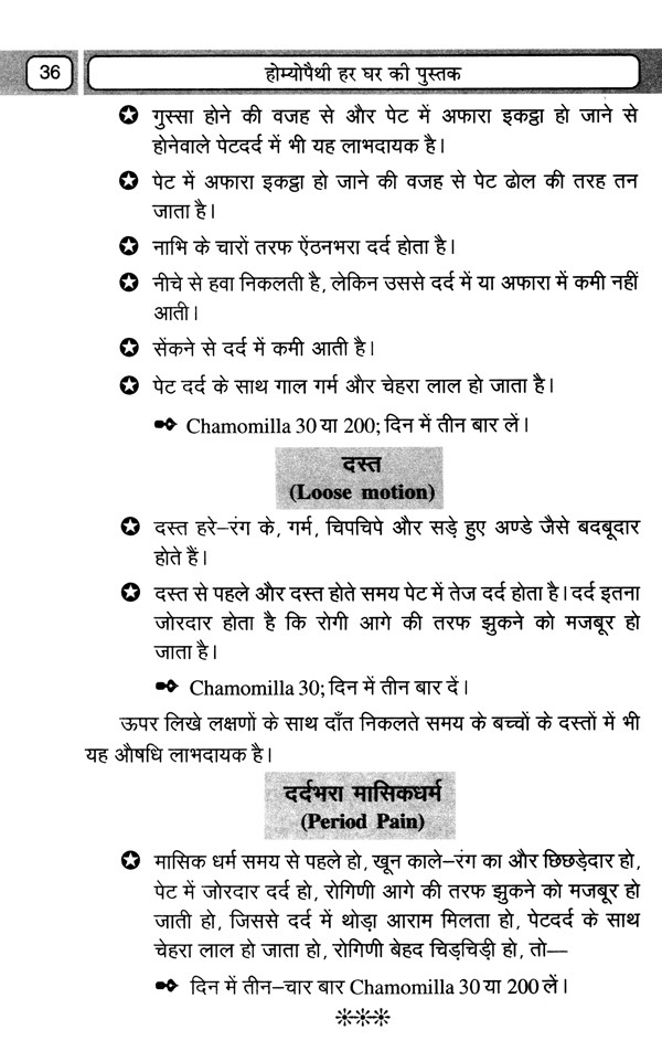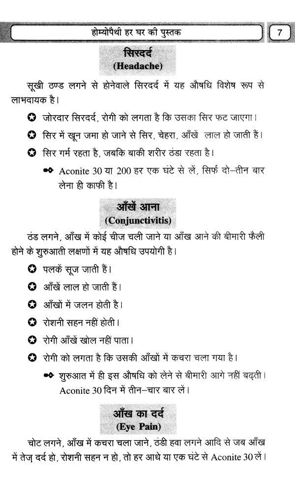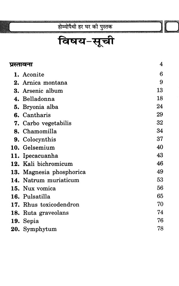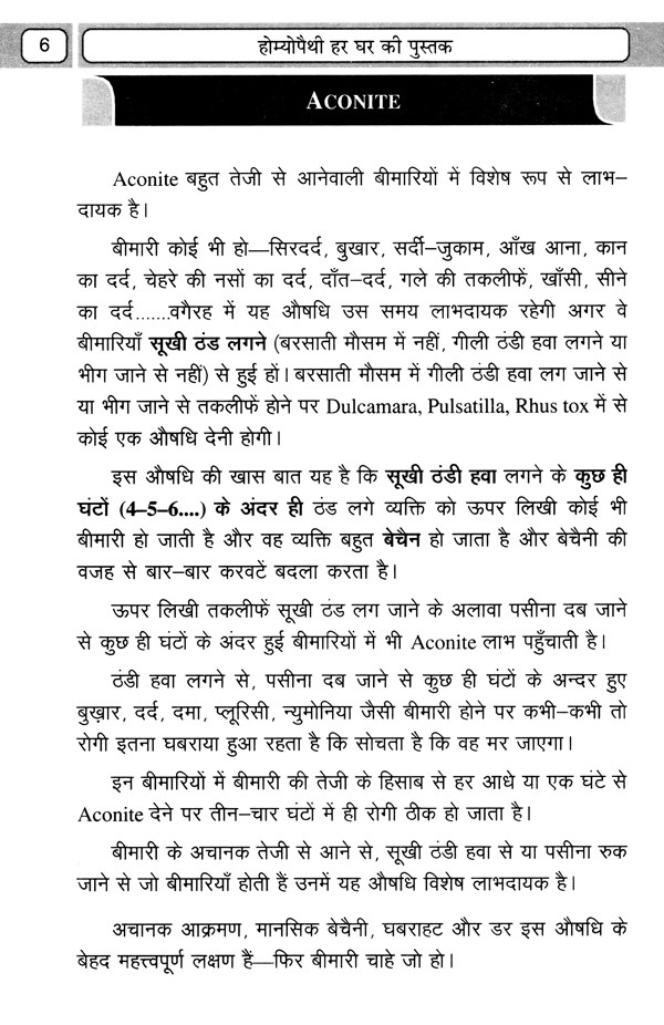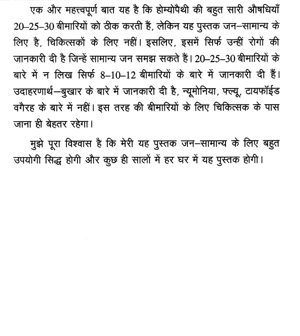 एक और महत्त्वपूर्ण बात यह है कि होम्योपैथी की बहुत सारी औषधियाँ 20-25-30 बीमारियों को ठीक करती हैं, लेकिन यह पुस्तक जन-सामान्य के लिए है, चिकित्सकों के लिए नहीं। इसलिए, इसमें सिर्फ उन्हीं रोगों की जानकारी दी है जिन्हें सामान्य जन समझ सकते हैं। 20-25-30 बीमारियों के बारे में न लिख सिर्फ 8-10-12 बीमारियों के बारे में जानकारी दी हैं। उदाहरणार्थ-बुखार के बारे में जानकारी दी है, न्यूमोनिया, फ्ल्यू, टायफॉईड वगैरह के बारे में नहीं। इस तरह की बीमारियों के लिए चिकित्सक के पास जाना ही बेहतर रहेगा।