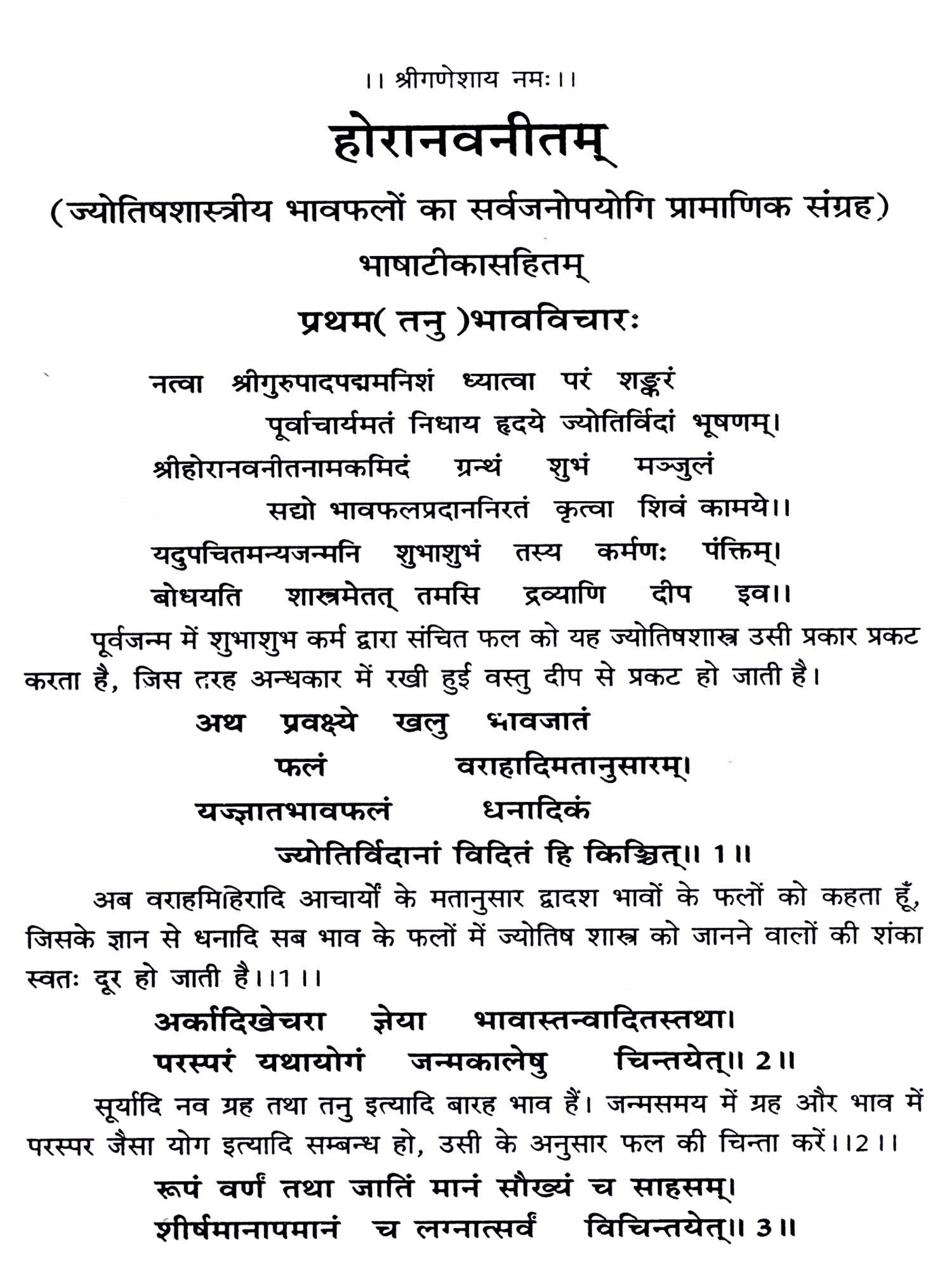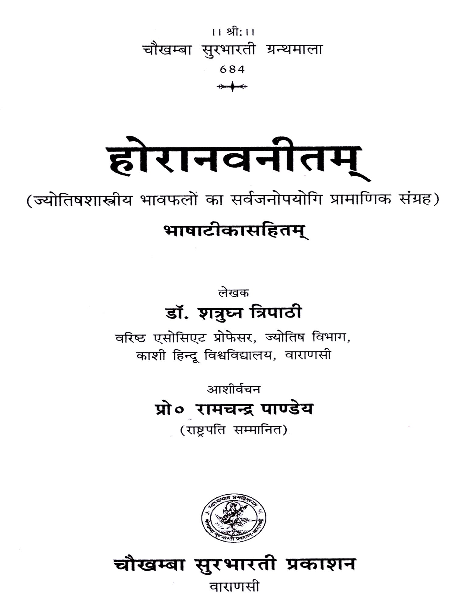 त्रिस्कन्ध ज्योतिष में होराशास्त्र की परम्परान्तर्गत निर्मित प्रस्तुत पुस्तक 'होरानवनीतम्' ज्योतिष शास्त्र के मूल सिद्धान्तों पर आधारित है। बृहज्जातक से प्रारम्भ कर नूतन परम्परा के ग्रन्थों से संगृहीत श्लोकों के आधार पर निर्मित यह पुस्तक गागर में सागर भरने के समान है। प्रामाणिक श्लोकों के संग्रह से इसका कलेवर प्रासंगिक परिस्थितियों के लिए भी महत्त्वपूर्ण है। आशा है कि फलितशास्त्र के लिए अतीव लोकोपयोगी यह पुस्तक पाठकों की ज्ञानपिपासा-हेतु अत्यन्त लोकोपकारक होगी।