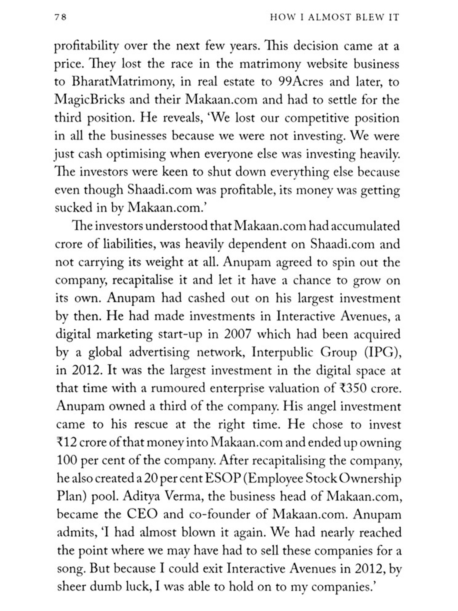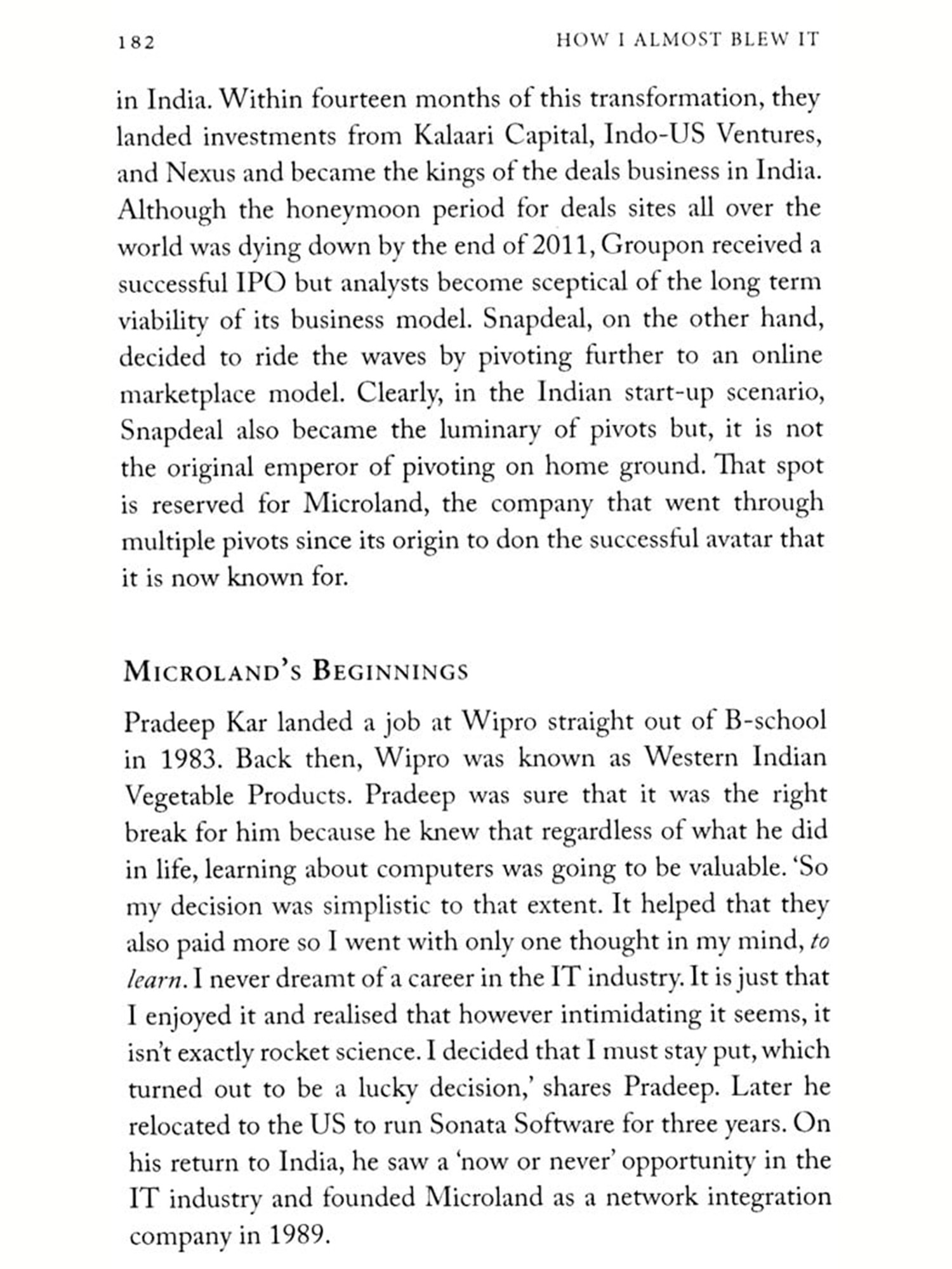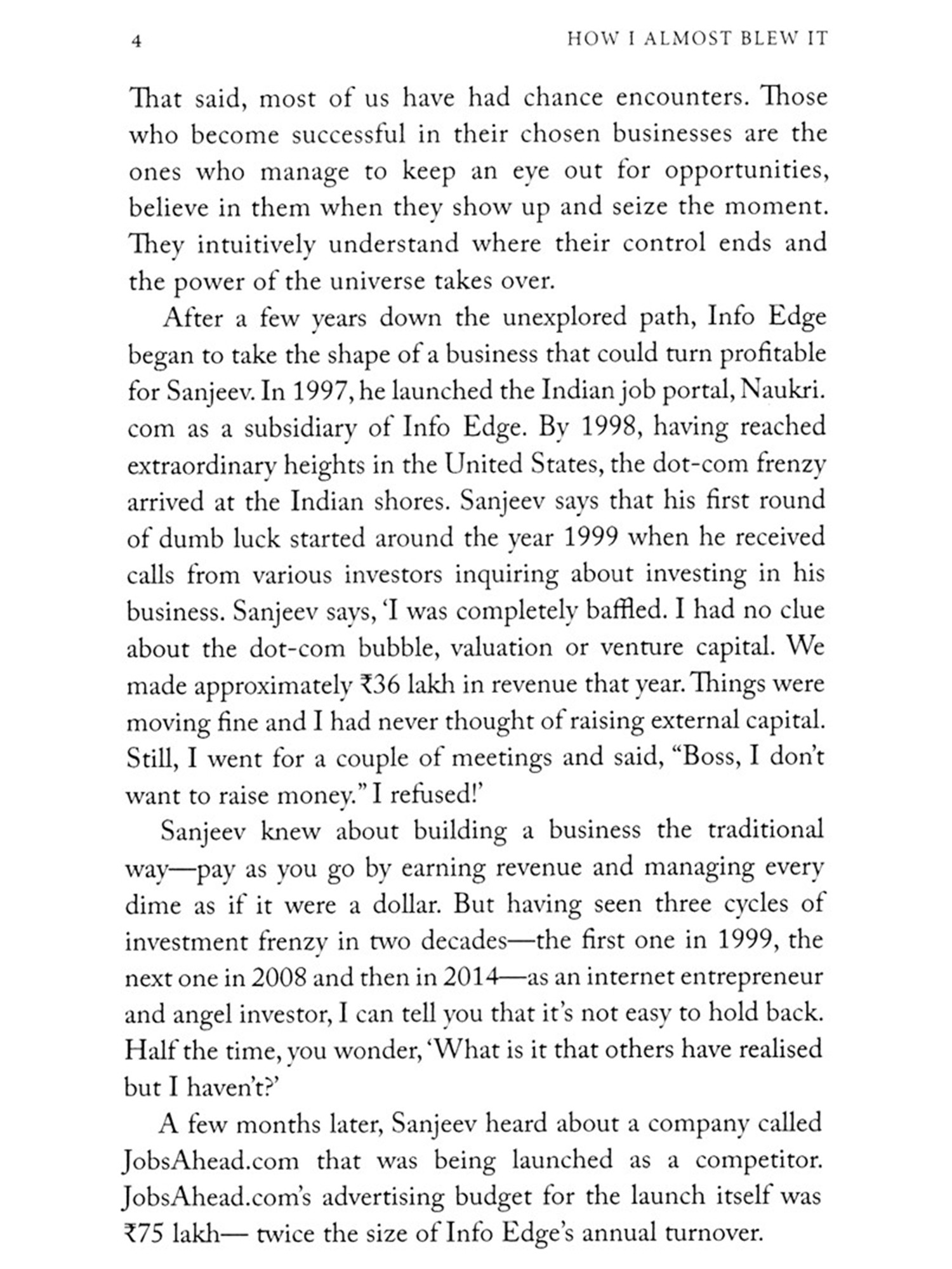 How I Almost Blew It talks to some of India's biggest entrepreneurs-Sanjeev Bikhchandani (Info Edge and Naukri.com). Deep Kalra (MakeMyTrip), Deepinder Goyal (Zomato). Ashish Hemrajani (BookMyShow), Sahil Barua (Delhivery). Girish Mathrubootham (Freshworks) and others-to tell stories that shock, reveal and inspire. Quick thinking, astute decision-making and-occasionally-sheer dumb luck is what stood between them and the abyss. These heart-stopping stories of near-fiascos are industry wisdom, yes, but also critical life lessons.