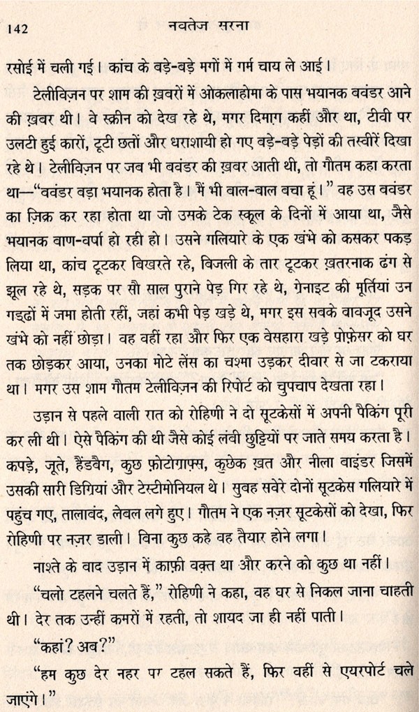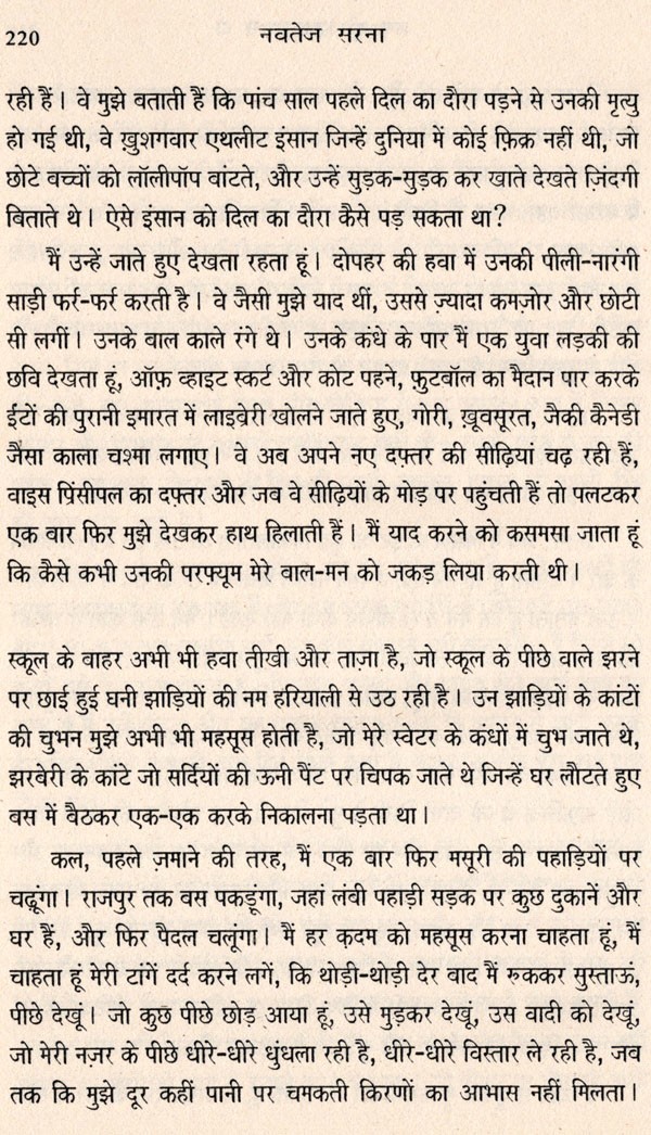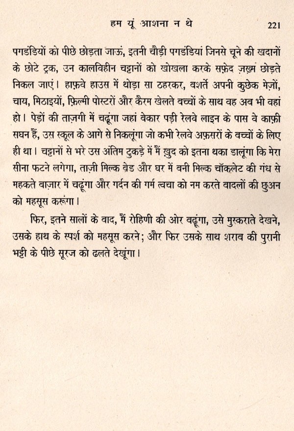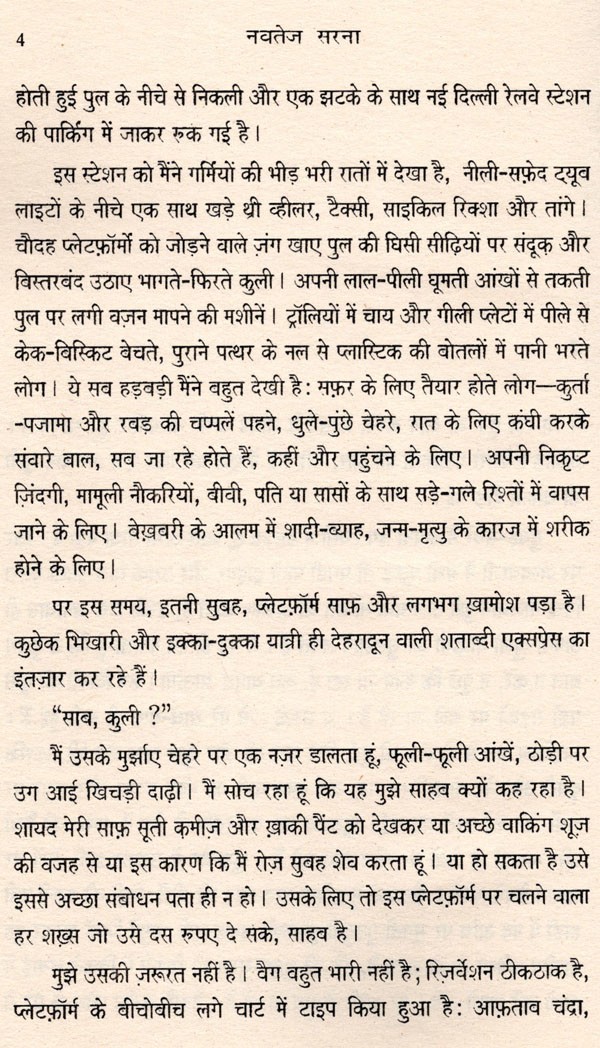 मैं जा रहा हूं। वो काम करने, जिसमें मैं शायद अभी भी माहिर हूं: भागने में। अल्हड़ हरीभरी पहाड़ियों की ओर, मेरी रगों में एक बार फिर एक अनजान भूली सी चाहना दौड़ गई है। सहस्राब्दी का प्रारंभ होते ही आफ़ताब का जीवन यकायक बिखर गया। वह चालीस साल का था। चौदह साल के वैवाहिक जीवन के बाद उसकी पत्नी, उनके इकलौते बेटे को लेकर किसी दूसरे व्यक्ति के साथ चली गई थी। वह देहरादून जानेवाली रेलगाड़ी में बैठा है। देहरादून, जहां उसका बचपन बीता था। निजी और व्यावसायिक समझौतों से भरे अधूरे अतीत में देखते हुए उसे आशा की केवल एक घुघली सी किरण ही नज़र आती है, जो उसे निराशा के गर्त में गिरने से बचा सकती है। शायद यह पलायन उसे बहुत पहले खो गई अपनी मोहब्बत को दोबारा पाने का मौका दे दे और वह फिर एक नई शुरुआत कर सके। इंसानी जज़्बात पर गहरी पकड़ और विलक्षण संवेदनशीलता के साथ नवतेज सरना ने खोए हुए मौक़ों और अनकही मोहब्बत की एक अनूठी दास्तान बयान की है।