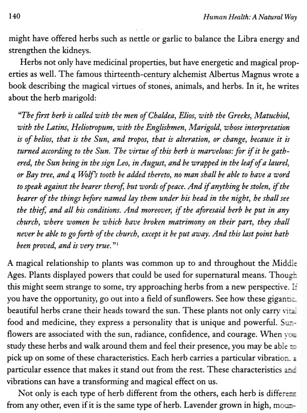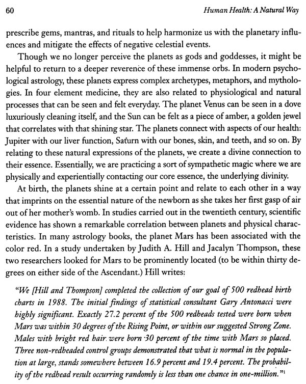 Human Health: A Natural Way Human Health: A Natural Way merges astrological, shamanic, pagan, and healing concepts into an easy-to-read book that will help you understand the relationship between your health, the natural world, and astrology. You will learn how to assess your energetic profile by looking at the elements, modalities, planets, and signs in your astrological birth chart. You will find out how to address imbalances in each of these areas using simple therapies based on the four elements-earth, air, fire, and water. By working with tools such as herbs, diet, stones, and animal and bird totems, you will discover how to harmonize your horoscope for optimal mental, emotional, spiritual, and physical health.