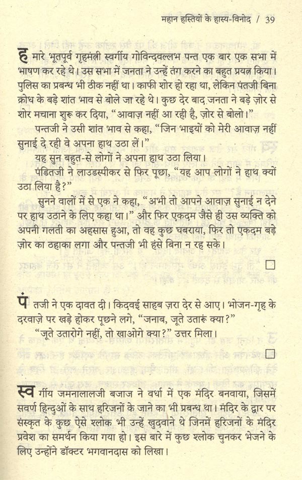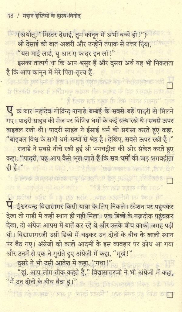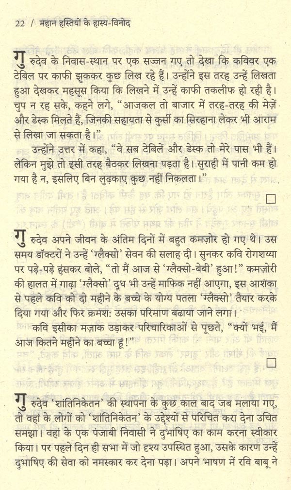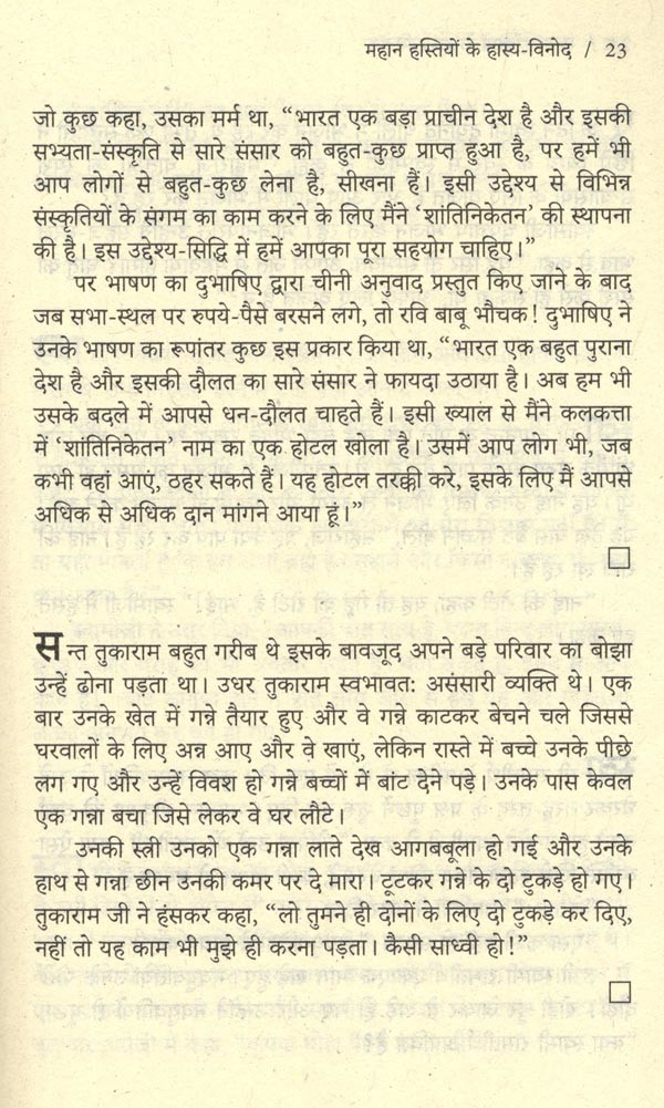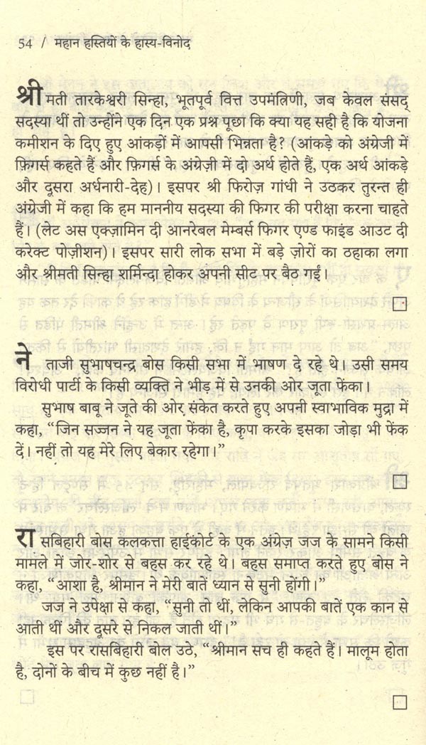गांधी, नेहरू, टैगोर, तिलक, गोखले, विनोबा भावे, सरदार पटेल, गालिब, सुकरात, टॉल्सटॉय, शेक्सपियर, वर्नार्ड शॉ, नेपोलियन, हिटलर, स्टालिन, अब्राहम लिंकन, चर्चिल, पिकासो, चार्ली चैपलिन, बर्द्रड रसल, मार्क ट्रेन, डार्विन, आइन्सटाइन जैसों के मुख से छल-छलाती मीठी-तीखी चुटकियों के दर्शन आपको इस पुस्तक में पढ़ने को मिलेंगे।
