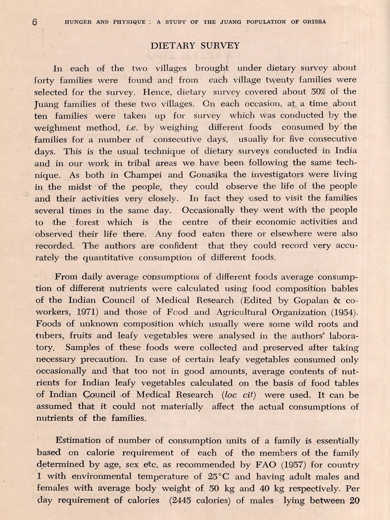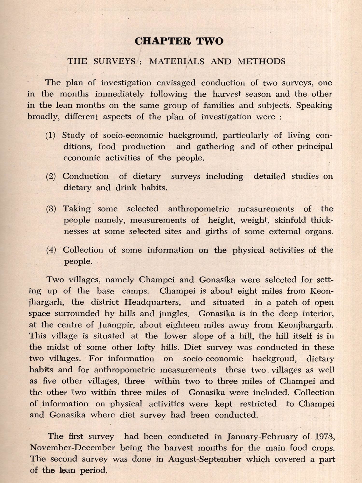 Though some observations have been made on the seasonal variation of body weight (which however was not always correlated with actual consumption of foods) it appears virtually no attempt has been made on the seasonal variation in some other anthropometric dimensions and characters that are likely to result from the seasonal fluctuation in the quantitative intakes of foods. Of particular interest would be changes in skinfold thicknesses at various sites and circumferences of limbs such as upper arm, thigh and thorax. How the response of the body to the situation created by varying degrees of food scarcity that are present in the lean months in food deficit areas of developing countries affect the anthropometric dimensions and skinfold thicknesses remains practically unknown. Not to mention about studies on seasonal changes in body weight and other body measurements along with studies on quantitative changes in food consumption, in India, not much attention has been paid to investigate problem of the seasonal changes in diet itself though considerable amount of work on the diet of various Indian communities have been done. The only workers, as far as the authors are aware, who worked in the line are Aykroyd and Krishnan (1937) and Roy and Rao (1963). While the former workers, working in some villages of South India in two different seasons, one in July-August and the other in February failed to find any basic difference between the diets of the two seasons, the latter workers working in a village of West Bengal found considerable differences, even difference in the calorie consumption. However, the authors made no observation on the body weights and other physical measurements of the people surveyed. The Anthropological Survey for the last twentyfive years or so have been conducting dietary and some allied nutritional investigation in the principal tribal zones of India. The work done before 1970 has been summarised by Roy (1970). Partly because the forest-clad hilly regions inhabited by the tribal people become almost inaccessible in the rainy season which are usually the lean months and partly due to certain advantages, surveys have been usually conducted in November-March. Still enquiry on diet-ary habits showed that tribal people, at least in some areas, are subjected to periodic fluctuation in food consumption. In some remote tribal areas where even in the harvest months and in months immediately following the harvest enough food for all cannot be obtained, people, at least a major part of them, have to depend in the lean months to a considerable extent on roots, tubers, and wild fruits for sustenance (Roy 1969, Roy & Roy, 1970), Sometimes to starve off hunger they eat wild fruits and other things which may not be normally considered foods (Roy, Roy & Roy, loc cit). How far the dietary position deteriorates in the lean months and what are the consequent physical deterioration are not however known. Considering that investigation on the seasonal fall in food consumption and consequent physical deterioration of a primitive people living rather in isolation and entirely dependent on local produce and gathering would be highly interesting and important from nutritional point of view and would be linked with health and happiness of the people, the present investigation had been undertaken. Apart from this, studying morphological response of human body to seasonal hunger, it was thought, would provide some information on an interesting aspect of biology of man in relation to its environment.