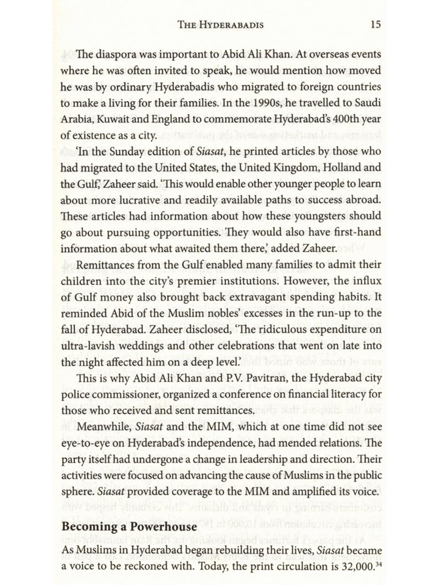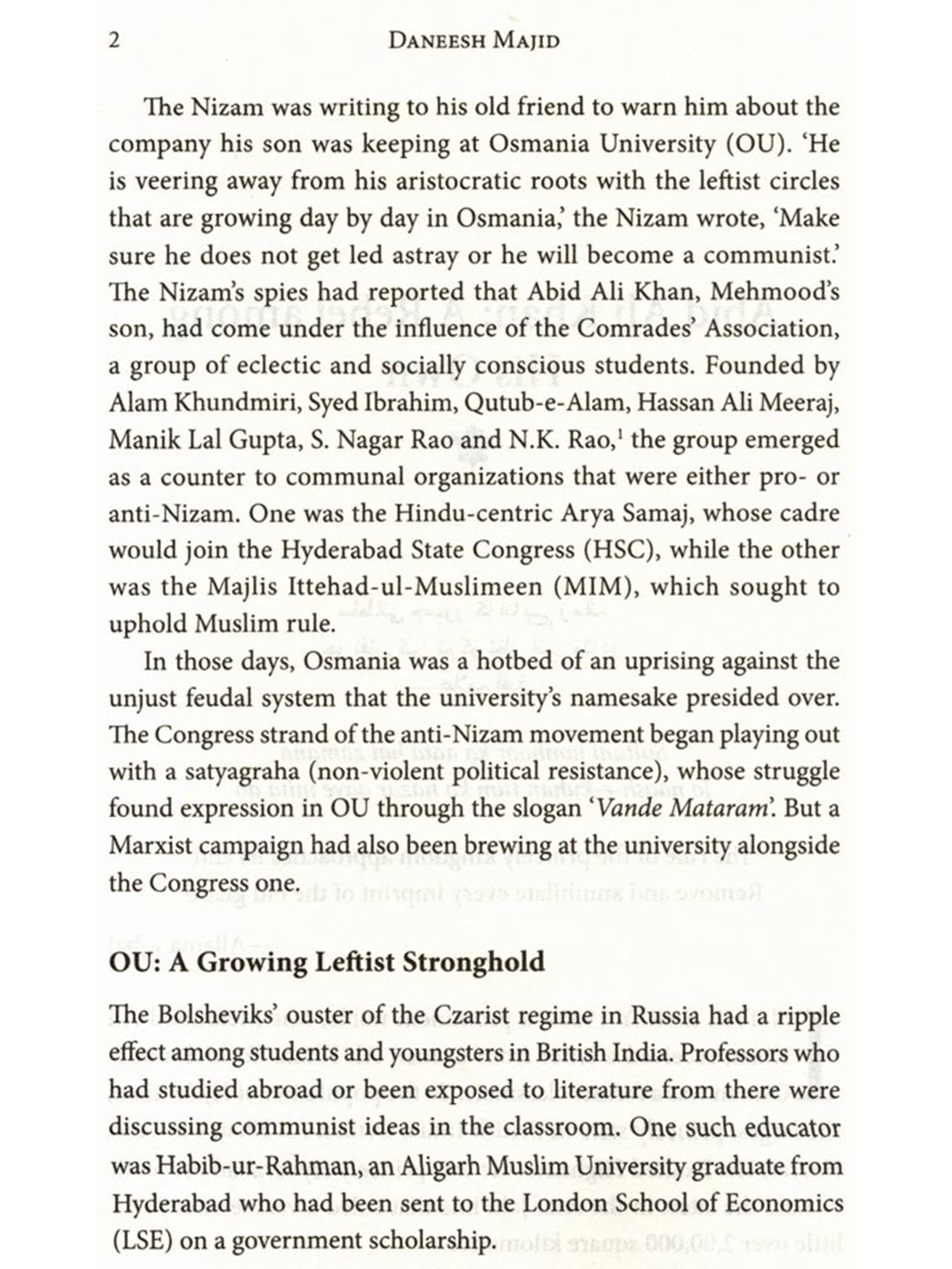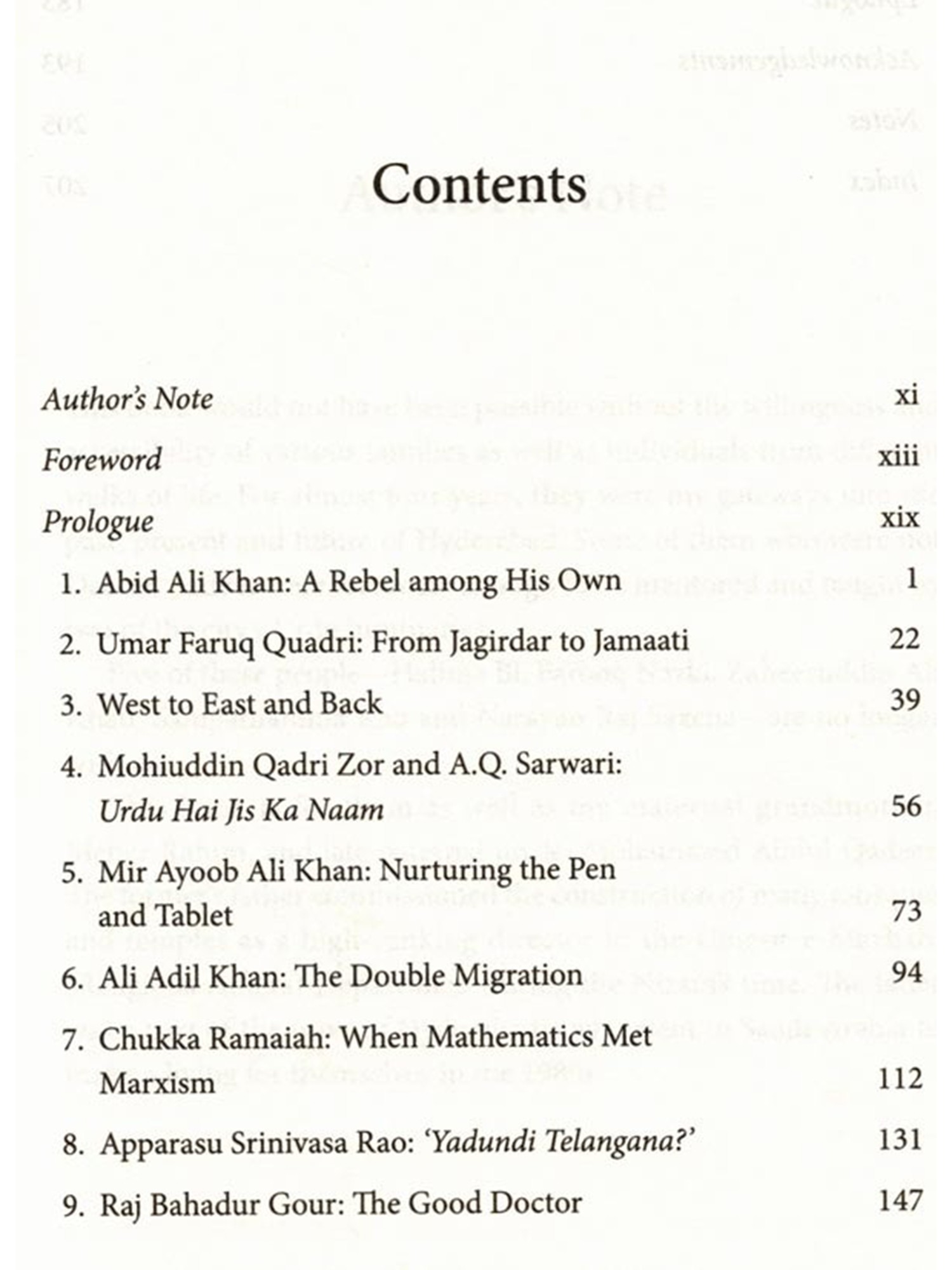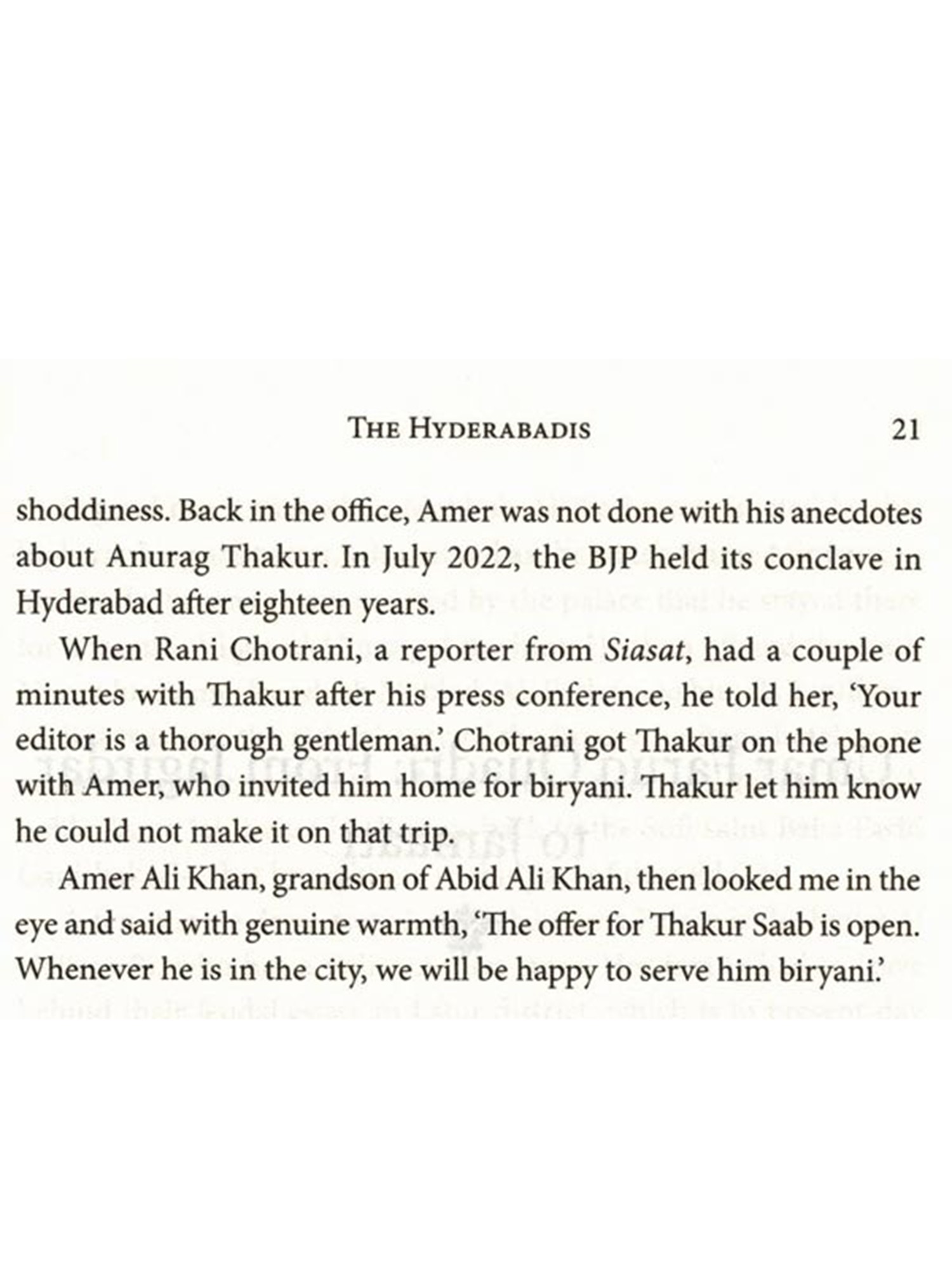 THE HYDERABAD I grew up in may have struck the outsider as provincial. For one, it was spatially compact. Abids was the glittering city centre, to be visited on special occasions. Mir Alam Mandi was a veritable cornucopia of fresh produce and exotic spices. The dawasaaz shops of Purani Haveli were the bases of apothecaries who occasionally doubled up as physicians, diagnosing as they dispensed. Anyone who needed anything printed came to the tightly clustered group of print shops in Chhatta Bazar. The automobile dealers of Osman Ganj, the bangle sellers of Lad Bazaar, even the hooch joints of Dhoolpet-there appeared to be tightly knit networks of commercial communities that made up hubs of economic activity. Residential areas acquired their own economic character. The uber-rich had begun moving to Banjara Hills, while middle-class enclaves like Himayat Nagar and Vijaynagar Colony were preferred by the office-going class. Festivals were defined by their rituals, many of them non-religious. Kite-flying on Makar Sankranti, dessert-consumption on Eid. The city had a rhythm that was distinctly different from the bustle of Bombay, the sarkari stuffiness of New Delhi, the orderliness of Madras and the chaos of Calcutta Scratch the provincial facade of Hyderabad however, and a palimpsest of a cosmopolis emerges. What was an Arab community doing in Barkas? How did the Kayasthas and Bilgramis of north India migrate here? Why did Hyderabad have an Iranian consulate even though it was not a national capital? Did it have anything to do with those famous cafes? The Marwaris from Rajasthan, the agriculturists. turned-industrialists from Andhra, the refugees of sectarian violence from Marathwada and the Indori migrants from Madhya Pradesh-all of them had found a seamless welcome in this city, enriching its culture. Daagh Dehlvi was buried here, as was Monsieur Raymond. a French adventurer whose grave was named 'Moosarambagh. This was the city where James Achilles Kirkpatrick had romanced Khair-un-Nissa Begum, where the ethereal Turkish beauties Niloufer and Durr-e-Shehwar had reigned as princesses. Nestled in the history of harmonious life were the scars of violent pasts and presents. The elders spoke of the 'Police Action' in hushed tones, and the folklore of many families-including mine-was replete with trauma from that genocidal week in September 1948. Periodic communal bloodletting in the form of 'riots' punctured the aura of inter-religious coexistence. The degradation of urban inequality was visible in the open drains of Dabirpura and Yaqutpura, contrasting against the wide avenues of Raj Bhavan and Begumpet. But overall, the atmosphere of Hyderabad veered towards the middle. We were more peaceful than violent, more tolerant than xenophobic, and more economically equal than unequal. Ye bajaa, zeest pa-piyaada thi; dhoop se phir bhi chhaaon zyaada thi. Even if we walked barefooted through life, there was more shade than sun. One aspect of Hyderabad that made me especially proud was its revolutionary ethos.