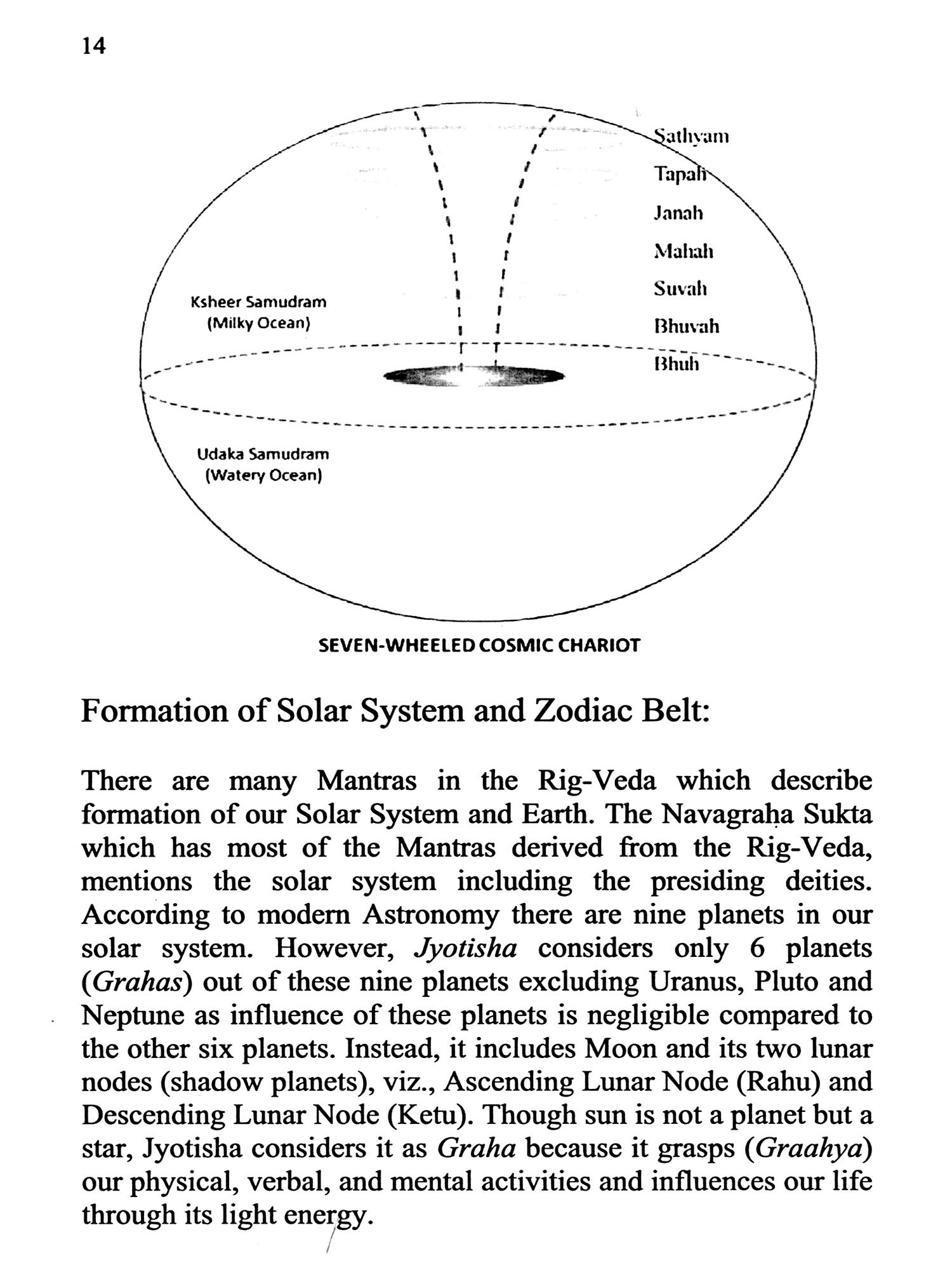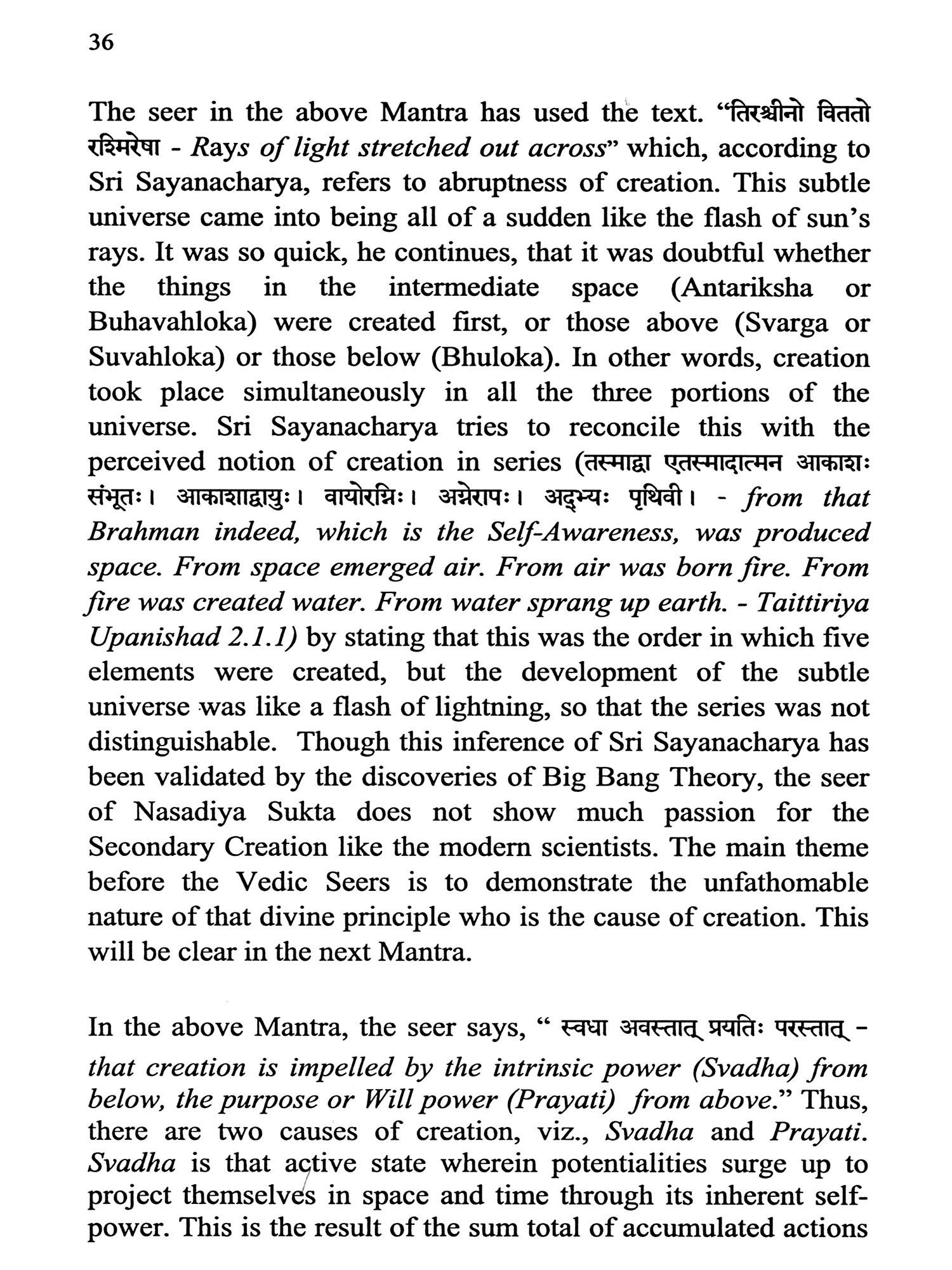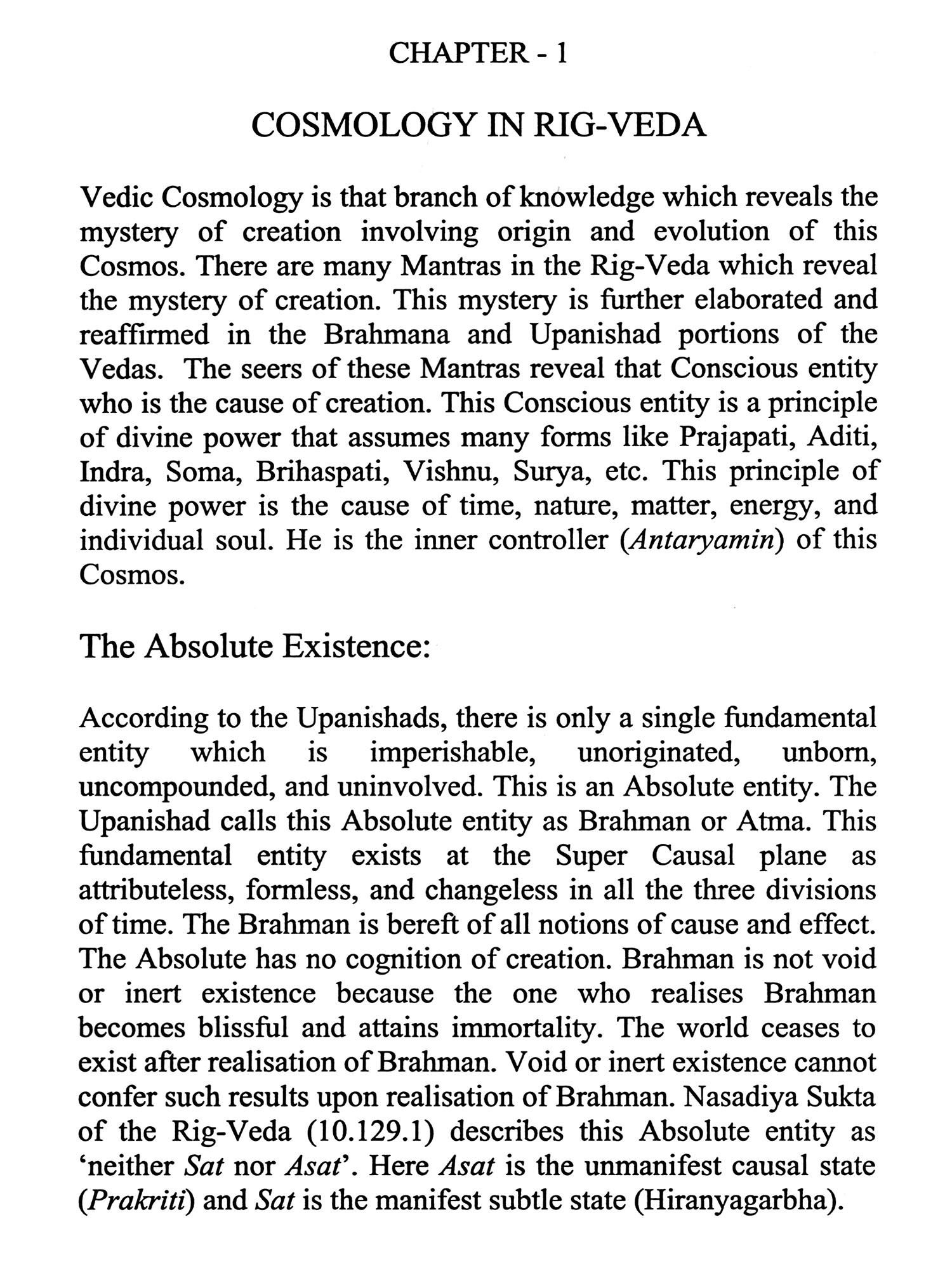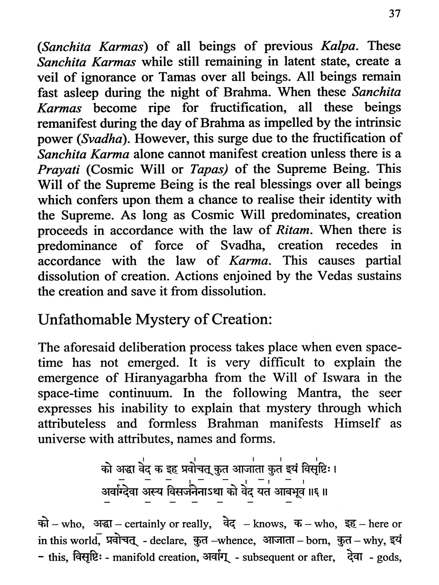 The Rig-Veda Samhita is considered as a repository of spiritual knowledge. The mystery of creation is more lucidly revealed in the Rig-Veda than any other system of knowledge. This entire creation emerges from one Supreme Being called Purusha (Consciousness). This is the irrefutable doctrine of Rig-Veda. The Aghamarsan Sukta of the Rig-Veda (10.190) affirms that Ritam and Sathyam are the fundamental basis of this creation. According to the Vedic Theory of Creation, this creation passes through three states, viz., Causal, Subtle and Gross. The Consciousness which presides over these three states is called Iswara (Prajna), Hiranyagarbha (Brahma, Taijasa), and Virat (Prajapati, Vaishvanara) respectively.