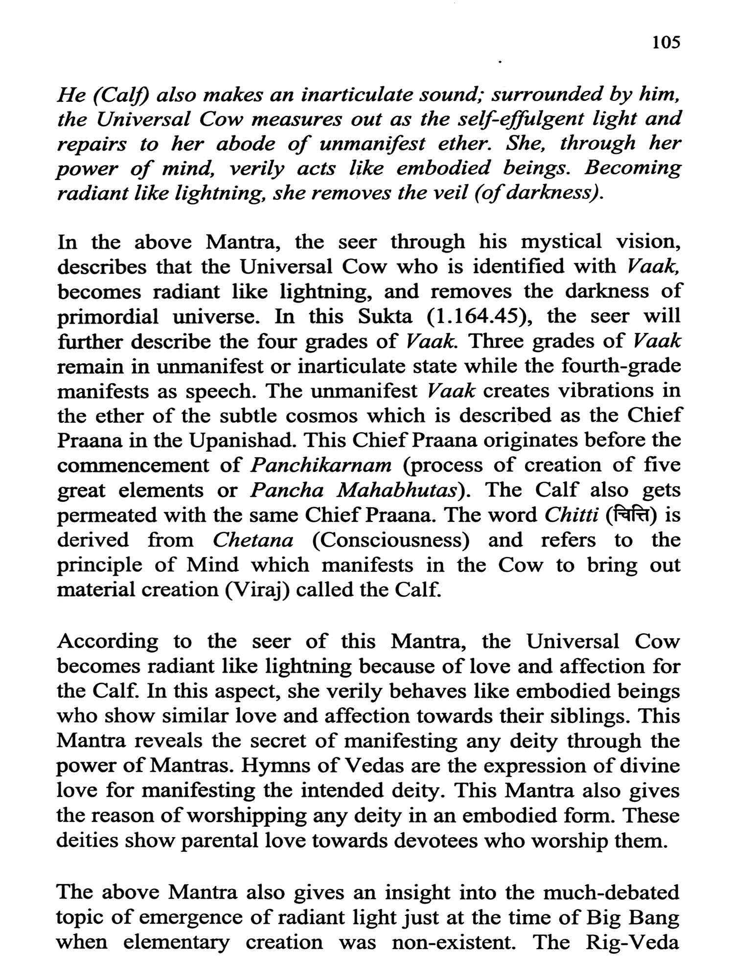 This Consciousness becomes manifest because of the Real Idea of creation and takes the form of Hiranyagarbha. This is the Age of Radiation wherein intelligence becomes radiant because of the Power of Vaak. This state is also called Supraketam Salil which is pervaded by Agni. The Asya Vamiya Sukta of the Rig-Veda (1.164) vividly describes this process of manifestation of the unmanifest. The Hiranyagarbha Sukta of the Rig-Veda (10.121) describes the various powers of this mighty deity called.