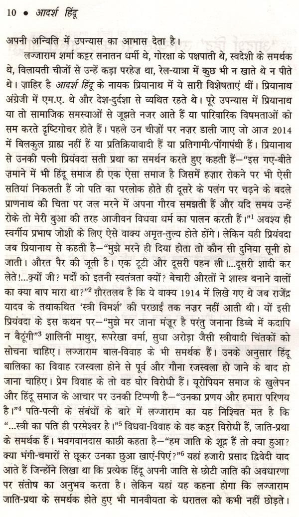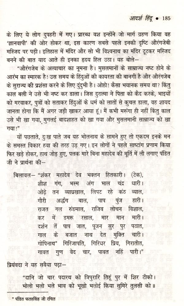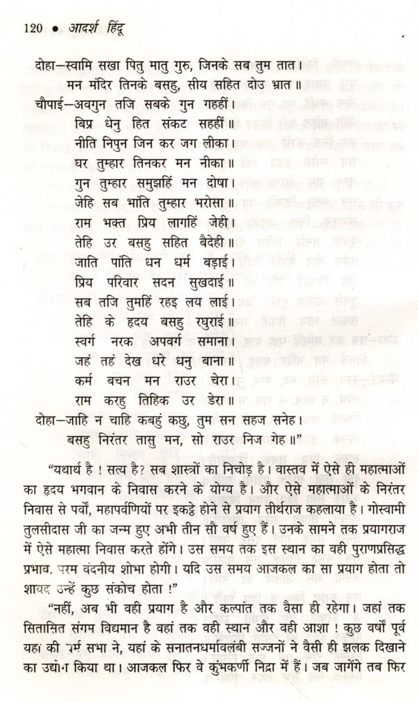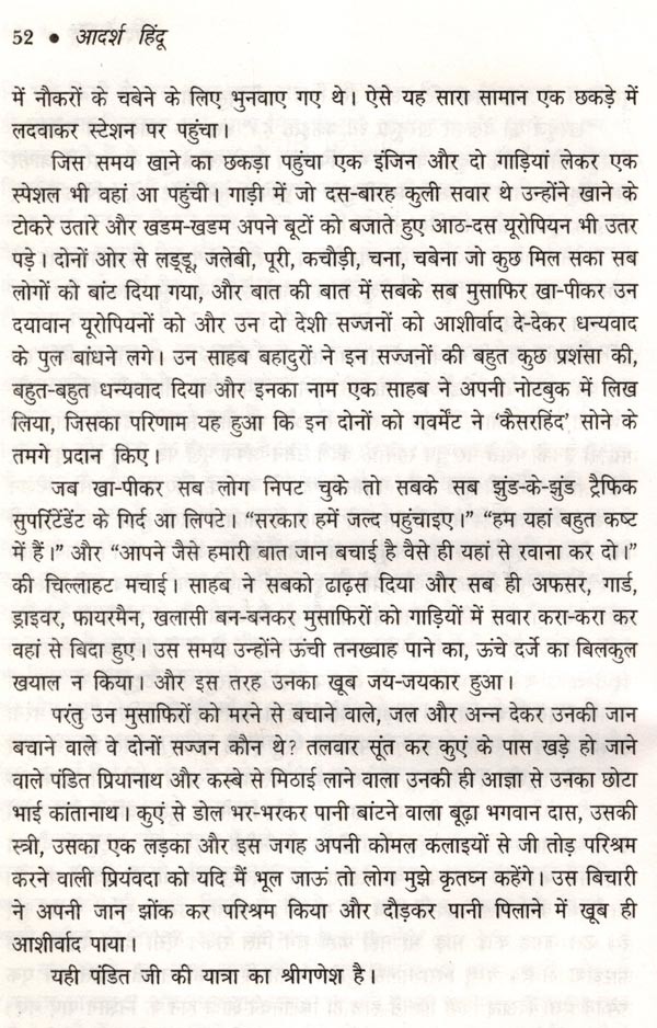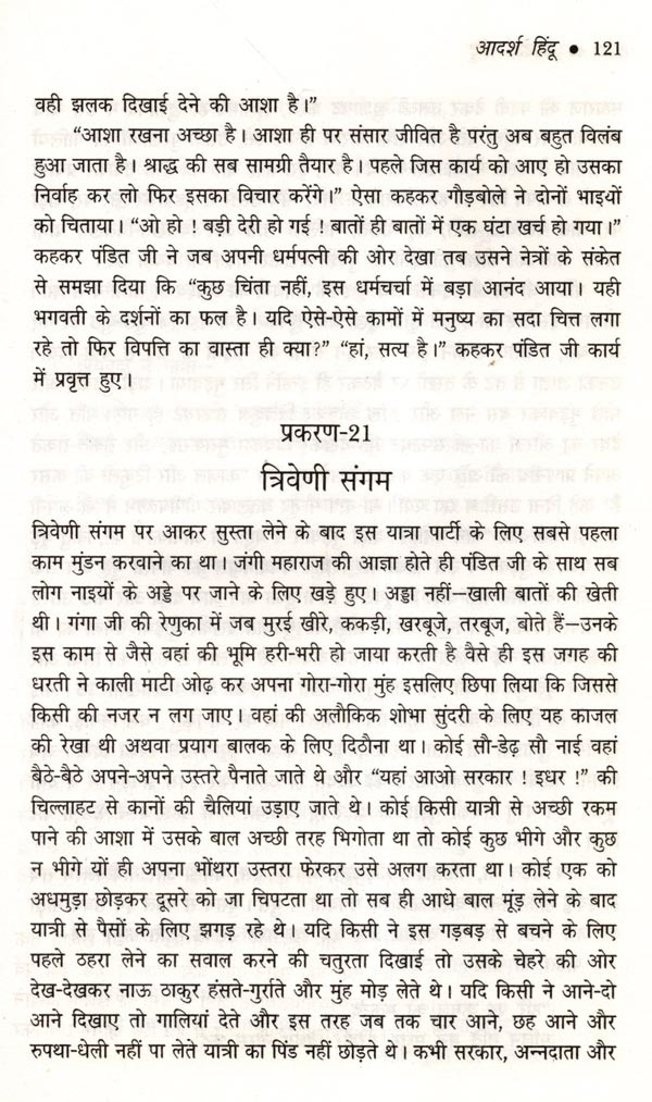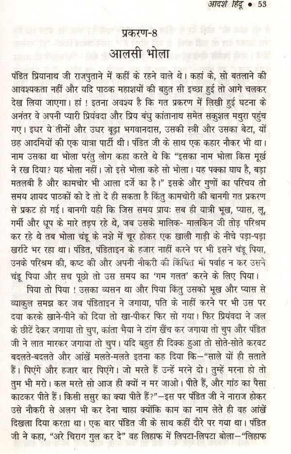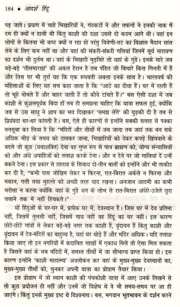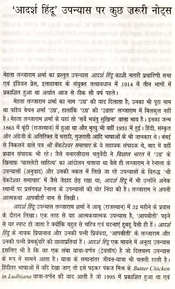 अब बुरी और भली जैसी कुछ है-यह पोथी प्यारे पाठक-पठिकाओं के सामने है तब इसमें क्या है सो बतलाने की आवश्यकता ही क्या है? हां! इतना में कह सकता हूं कि जिस उद्देश्य से मैंने अब तक और उपन्यास लिखे हैं उसी से यह आदर्श हिंदू भी लिखा है। इसमें तीर्थयात्रा के व्याज से, एक ब्राह्मणकुटुंब में सनातन धर्म का दिग्दर्शन, हिंदूपन का नमूना, आजकल की त्रुटियां, राजभक्ति का स्वरूप, परमेश्वर की भक्ति का आदर्श और अपने विचारों की बानगी प्रकाशित करने का प्रयत्न किया गया है। यदि इस पुस्तक में मैं आदर्श हिंदू का अच्छा खाका तैयार कर सका तो मेरा सौभाग्य और पाठकों की उदारता और यदि मैं फेल हो गया तो मेरा यह प्रयत्न धरती में पड़े-पड़े आकाशग्रहण करने के समान है ही। हां! मेरी नम्र प्रार्थना है कि जो महानुभाव मेरी पुस्तकों को पसंद करते हैं वे इसे भी निज जन की जान अपनायें और जो हंसबुद्धि से समालोचना करने वाले महाशय हैं वे इसकी त्रुटियां दिखलाकर मेरे लिए पथप्रदर्शक बनने का अनुग्रह करें।