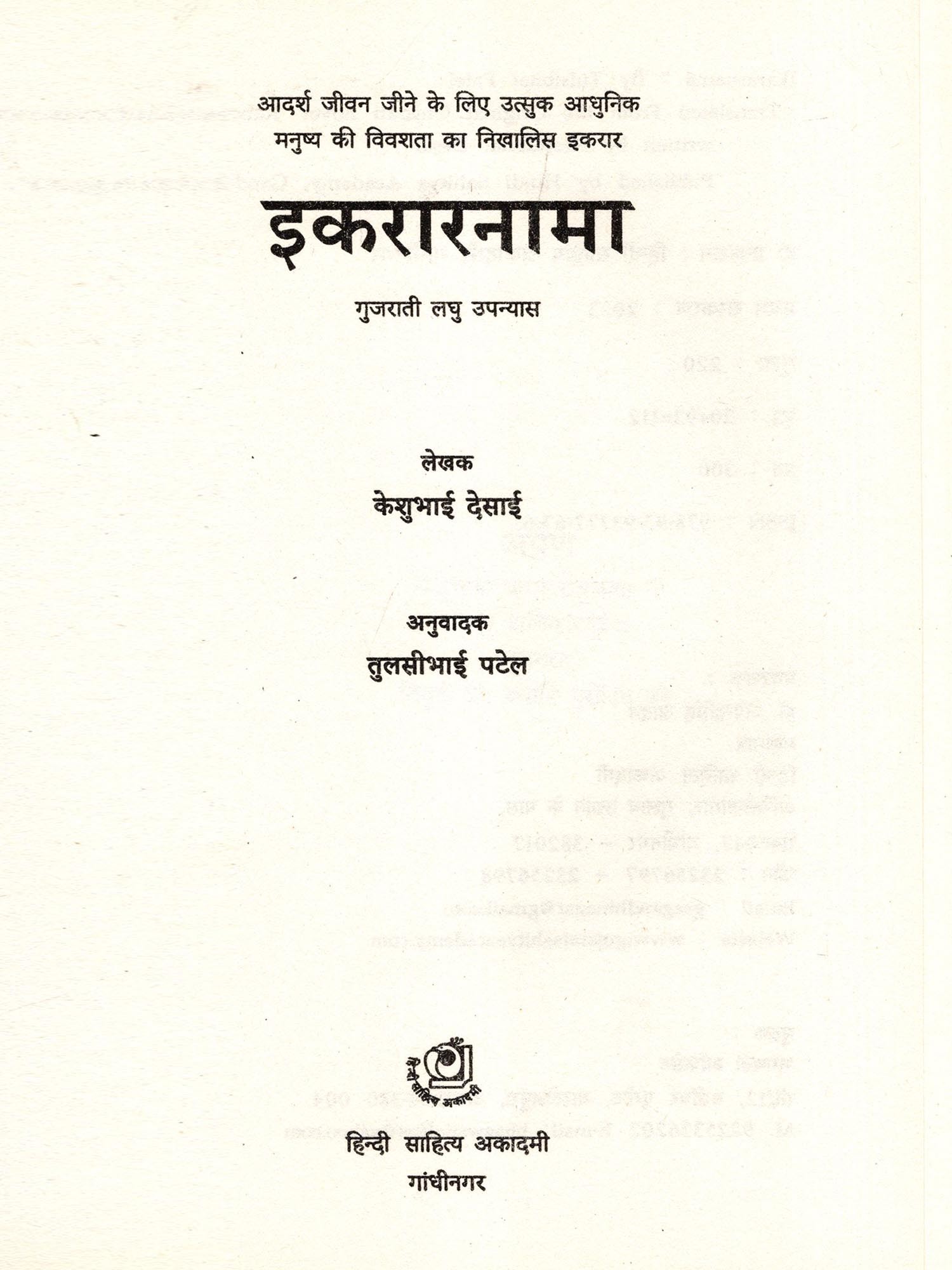 भारतीय कथा साहित्य में अपनी अलग पहेचान रखनेवाले गुजराती के प्रथितयश उपन्यासकार डॉ. केशुभाई देसाई के लघु उपन्यास 'कबूलातनामा' का हिन्दी अनुवाद 'इकरारनामा' प्रकाशित करने का गौरव गुजरात हिन्दी साहित्य अकादमी को प्राप्त हो रहा है यह न सिर्फ मेरे लिए अपितु गुजराती साहित्य सृष्टि के लिए आनंददायिनी घटना है। बहुमुखी प्रतिभा के धनी डॉ. केशुभाई देसाई गत चार दशकों से नितान्त सृजनरत हैं। उनकी कई विद्याओं में कई पुस्तकें प्रकाशित हो चुकी हैं और निरंतर हिन्दी सहित अन्य भारतीय भाषाओं में अनूदित होती रही हैं।