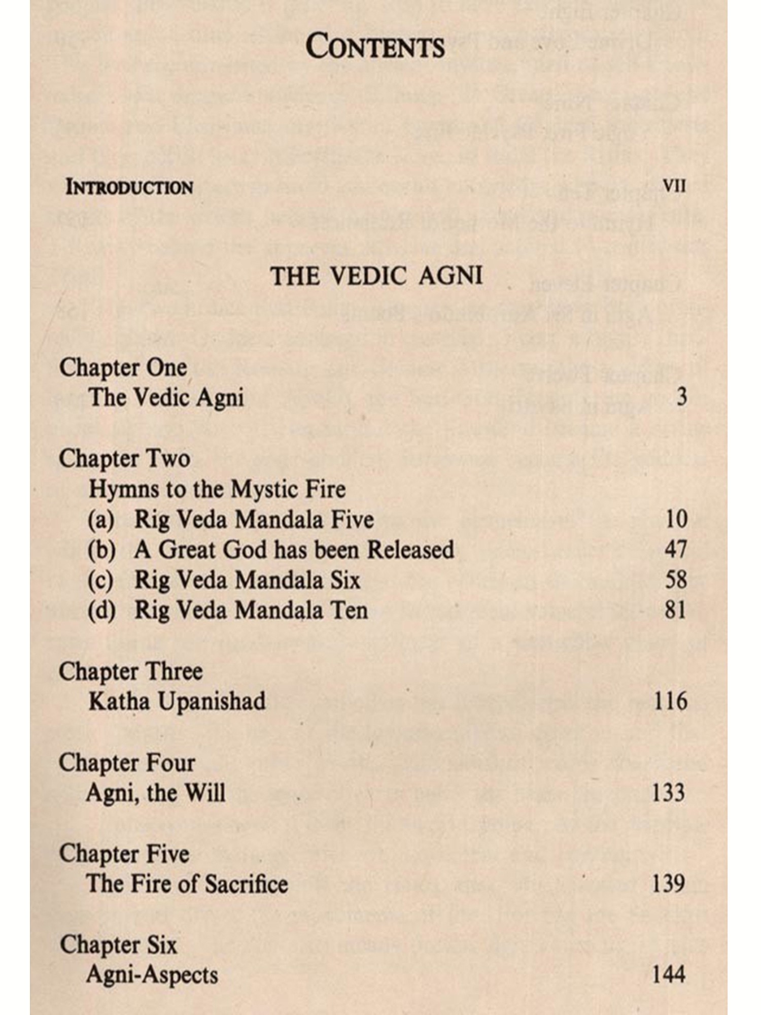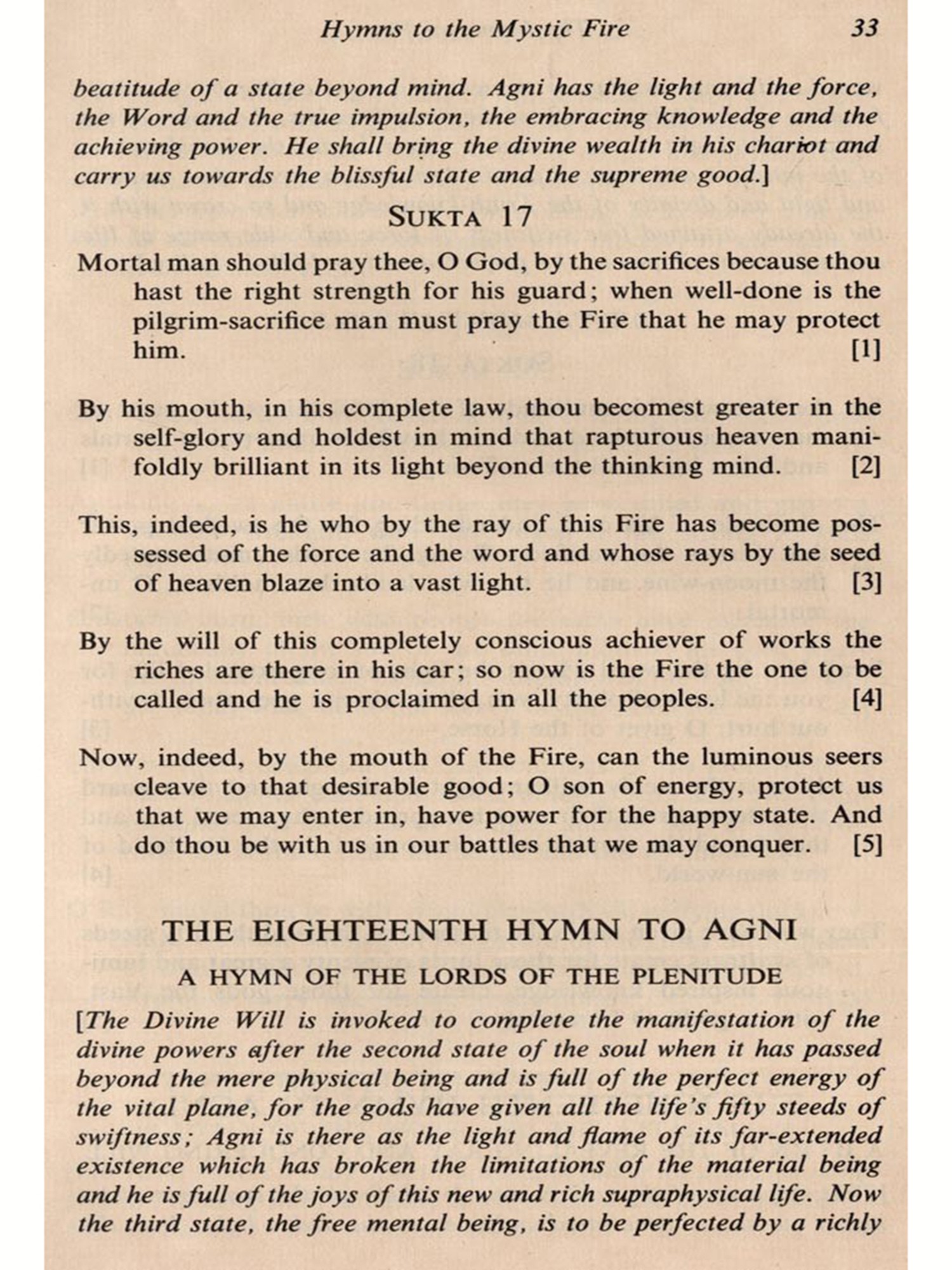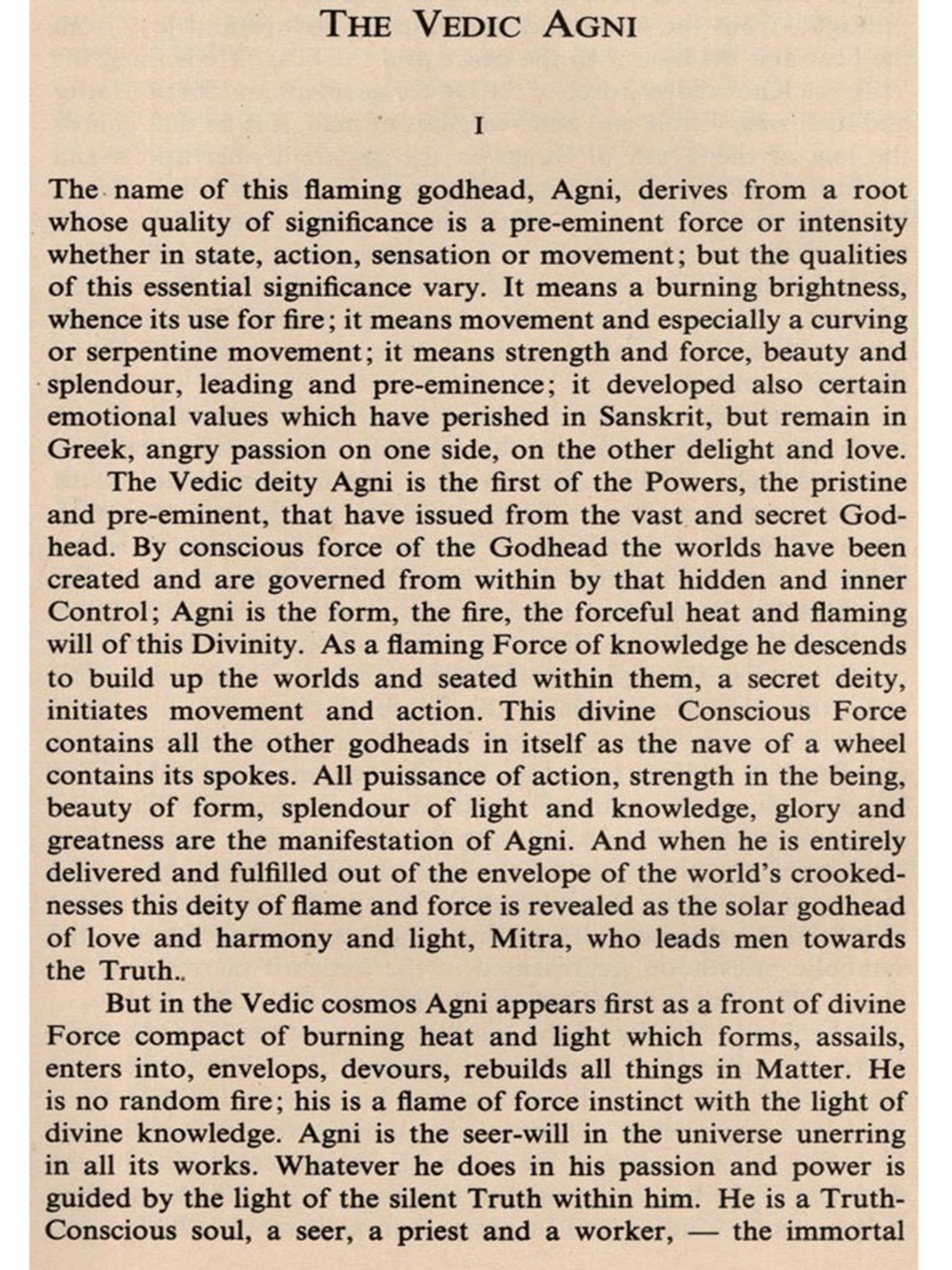 With the knowledge of the psychological significances of the Vedic words, even proper nouns have an inner sense, one starts unveiling the deeper reality of what is said. For instance, the colloquy of Agni and the Gods related in the Rig-Veda, Mandala X. 51, becomes a parable of Agni (the divine spark flickering in man) gone into hiding in the nether regions of inconscience when every-thing is laid for the Yajna, the sacrifice, the cosmic labour of the universe towards the Light out of Darkness. The gods who go in search of Agni are Varuna (god of the Vast Consciousness), Mitra (god of the harmony of Infinity) and Yama (god of the Under-world). Agni first refuses to join them; he is afraid of the enormous task, even his elders have failed before. But the gods insist and Agni comes out; the soul, the divine spark in man, accepts the mission of the manifestation of divinity on the earth, even though the attempts of its predecessors, the deities of the physical, vital and mental consciousness, one may say, did not succeed.