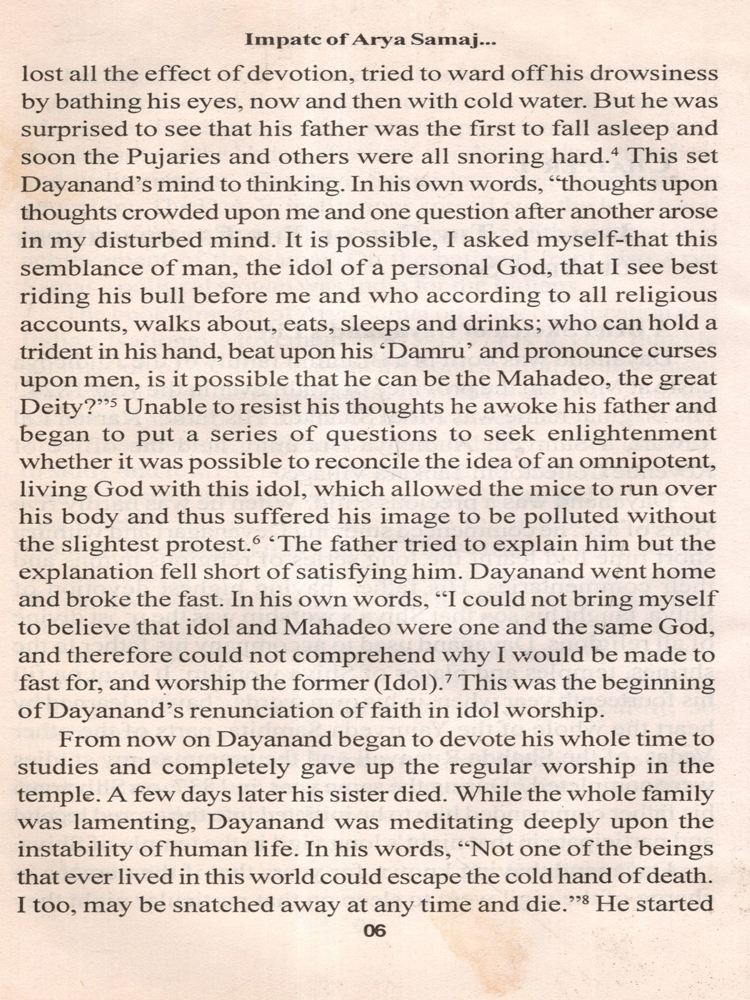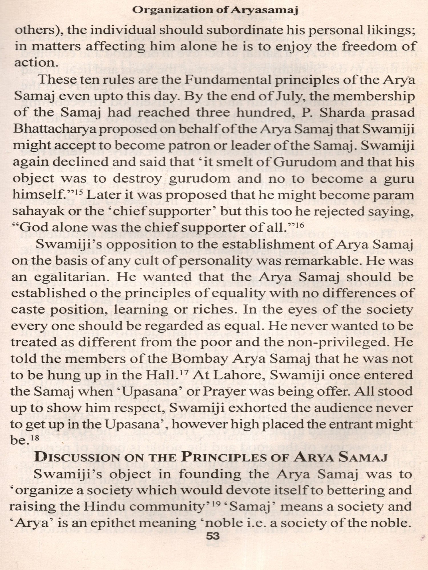 The Arya Samaj was founded by Swami Dayananda Saraswati (1824-1883). He was a good Sanskrit Scholar but had no English education. His motto was "Go back to the Vedas". He wanted to shape society on the model of the Vedas. He believes in one God and decried polytheism and the use of images. He established the Arya Samaj first at Bombay in 1875. He traveled all over India to propagate his views and established Arya Samaj organizations at different places for the same purpose.