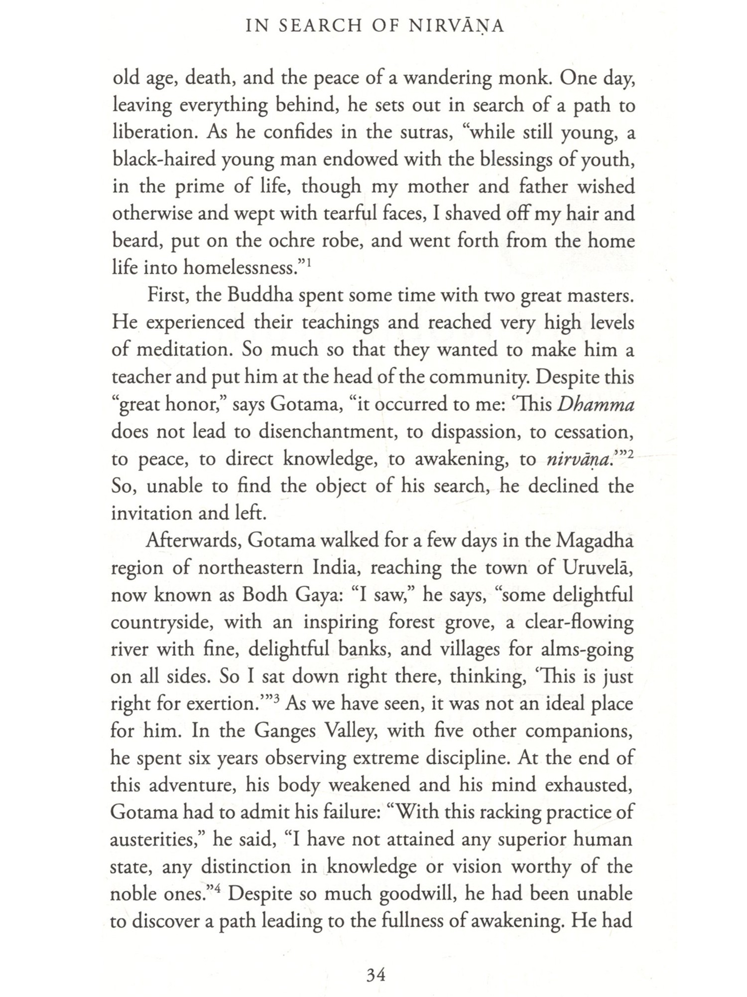 A ncient texts give few details about the life of the sage Gotama, known as the Buddha. Their thousands of pages tell us more about his teaching, this invaluable gem of the East, "Whoever sees the teaching sees me," said the Buddha. To know the Buddha's thought, his teaching, is to know him deeply through his eyes. A few works on the life of the Buddha did appear, however, between the second century BCE and the second century CE. They mainly rely on various accounts passed down by oral tradition and ancient texts. These stories, with their legendary flavor, often present the life of Gotama in a mysterious and magnificent way. Imagine a storyteller of that time recounting the first steps of his noble search for nirvana: "In his part of the world, one could not find more noble parents, a more splendid wife, a more enviable situation or a more spacious home. His father, Suddhodana, is king of the Sakka clan, and his mother is Queen Mahāmāyā. Siddhattha Gotama is a prince, and he is married to the lovely Princess Yaśodharā, daughter of King Dandapani. They live in a magnificent palace, surrounded by numerous servants. "In this climate of wealth and wonder, it is said that even the trials of life are hidden from the eyes of the young prince. And so, at any time of the day, one can see his father keeping away from his eyes such trying realities as old age, illness and death. But one day, intrigued by vast horizons, the prince made a few escapades outside the palace: rendezvous with the usual and the unusual of life, which would cause the scales to fall from his eyes. For the first time. Siddhattha Gotama became aware of four realities that would change his life forever: old age, illness, death and the peace of a smiling monk. "But who is this man, leaning on a stick, who no longer has hair nor teeth? he asks. And what is this reality that you call illness, capable of turning a sun into a cloud? And this motionless body, adorned with flowers, why is it placed on a pyre? What is happening here is beyond comprehension!" Fortunately, Siddhartha also sees a monk passing by, whose serenity questions him deeply, Back home, watching these images unfold in his mind, troubled by the fact that at first sight the world is not as it should be, pondering the peaceful face of the wandering monk, Siddhattha suddenly shifts from dream to reality. At the age of twenty-nine, shortly after the birth of his only son, Rahula, he renounces everything and sets out in search of a peaceful way to end human suffering." There are many legends about the Buddha, some of which undoubtedly reveal certain realities. For example, while the first name Siddhattha (skt. Siddhārtha) is historically uncertain, the last name Gotama (skt. Gautama) is often found in ancient texts. He lived in the fifth century BCE and grew up in the Republic of the Sakka, on the border between India and Nepal, in the foothills of the Himalayas. Historians and archaeologists have confirmed that Gotama enjoyed a certain wealth, but lived a very simple life in the countryside rather than in the city. For his part, Suddhodana, Siddhattha's father, did not have the status of king that the legends ascribe to him, but was probably a very influential wealthy man, who held a high position in public affairs. In the fifth century BCE in India, conflicts berween different clans were numerous. It was the transition from the ancient tribal federations to the monarchy, the economy was being restructured, and there were weapons and cities. Within this social framework, Gotama belonged to the warrior caste. But the Buddha did not like war, and his teaching on nonviolence, while remaining realistic, bears witness to this. Therefore, it is in this tense climate that Gotama will gradually nourish his reflection on suffering, old age, illness, and death. And then, one day, "he will go in search of nirvana, where there is no more suffering, old age, illness or death." Little by little Gotama learns the way. At first, he listens to various schools of wisdom and meditation. Gotama finds in them a fertile ground for the development of his thought; he achieves everything successfully, but he soon has to admit that he cannot find the object of his search within these teachings. At the time, India was well known for its wandering monks, śramana, and this is the path Gotama will now follow. For six years in the Ganges Valley, he will dedicate himself to a life of extreme asceticism. His practice is difficult, and he does not eat his fill. Exhausted, he concludes the answers he seeks are not to be found on this arid path." Now thirty-five years old, Gotama decides to continue his quest by surrounding himself with better conditions. He eats sensibly and gradually regains his strength. Then one day, on the banks of the Nerañjara river near the town of Gaya while meditating under a tree, he finally discovers the object of his noble search. He attains awakening, bodhi, enlightenment, the unparalleled peace of the sublime state. He attains nirvana. Today, this holy place bears the name Bodhinanda, the tree of awakening where the sage Gotama became a Buddha.